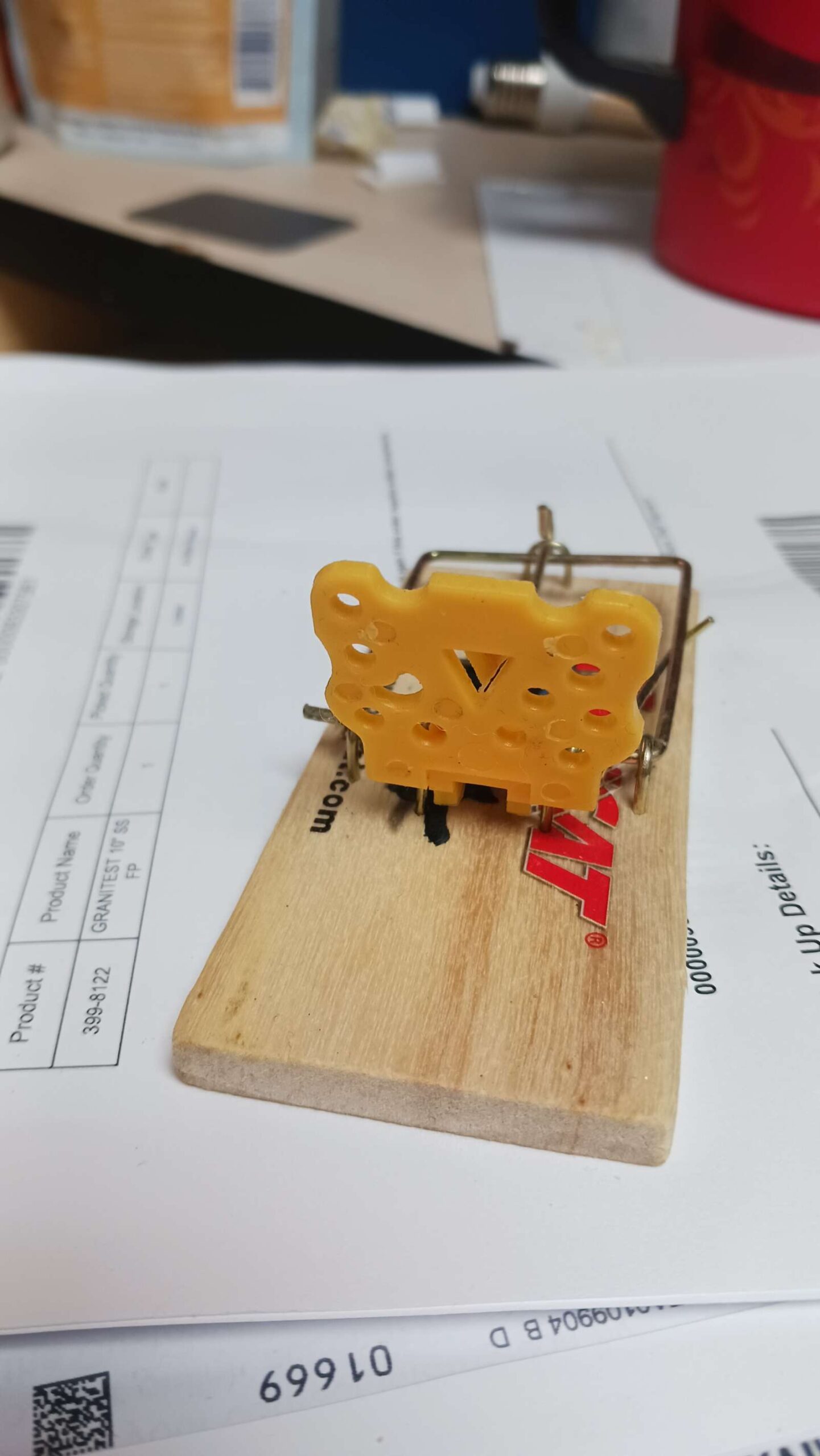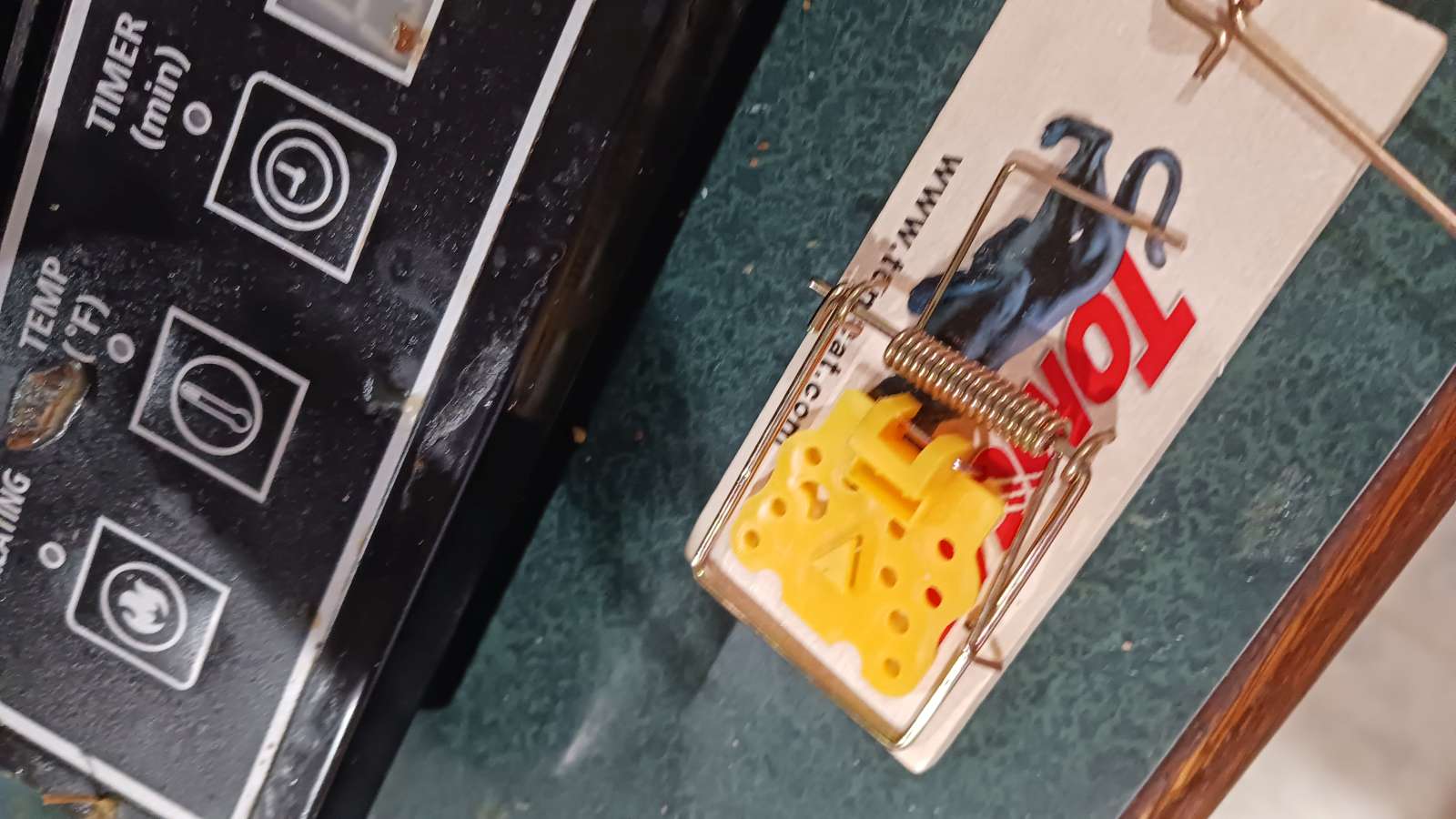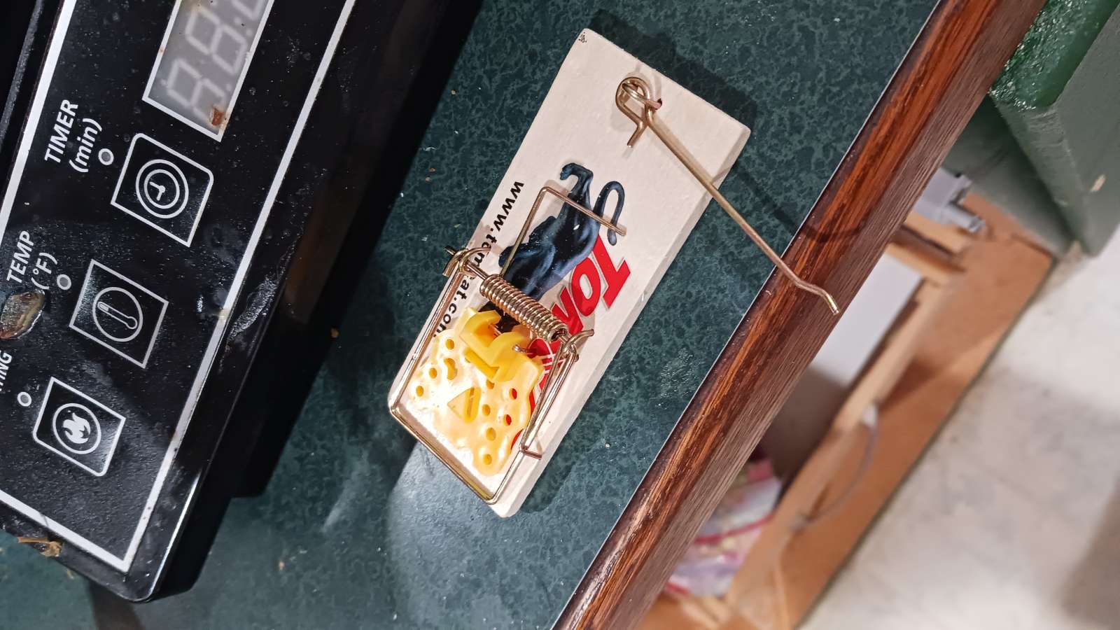 2 days later: got mouse in cheese trap in laundry room. notably, 80% of the cheese had been eaten, but he must have got greedy…