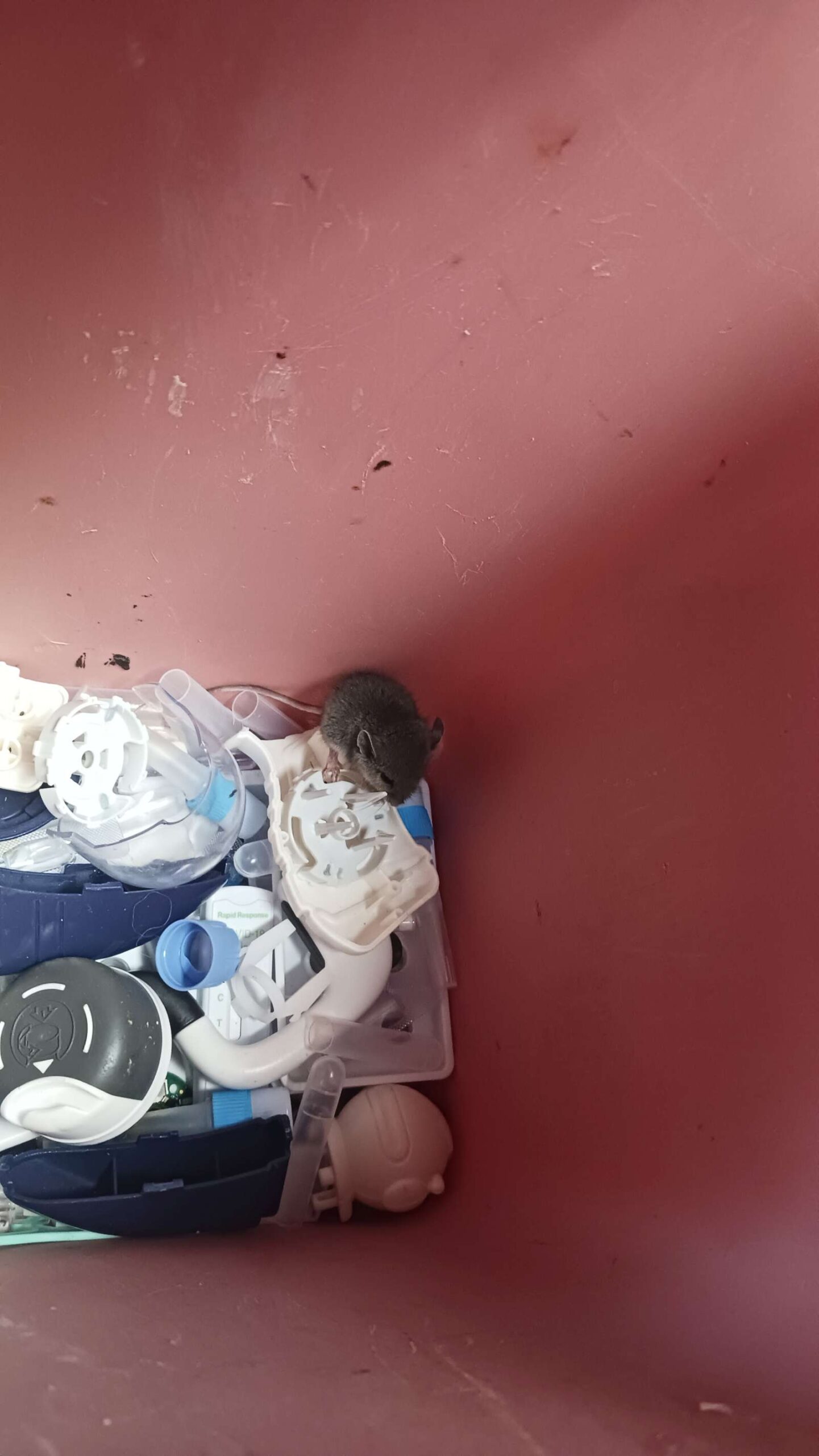 todaty there was found a mouse in a recycle tub with small plastics in cave. alive. let him go at the back of the garden outside. best of luck.