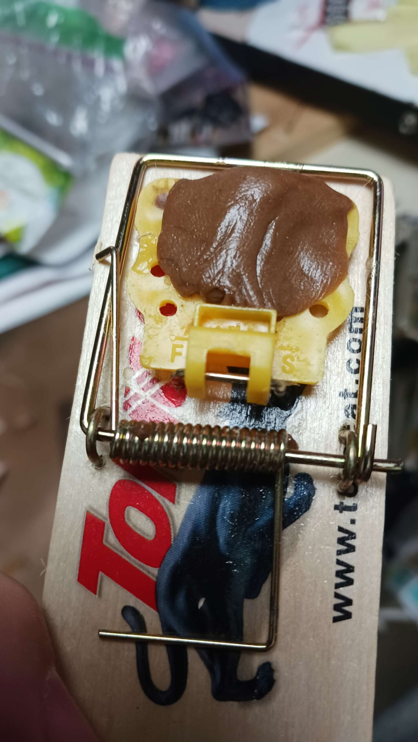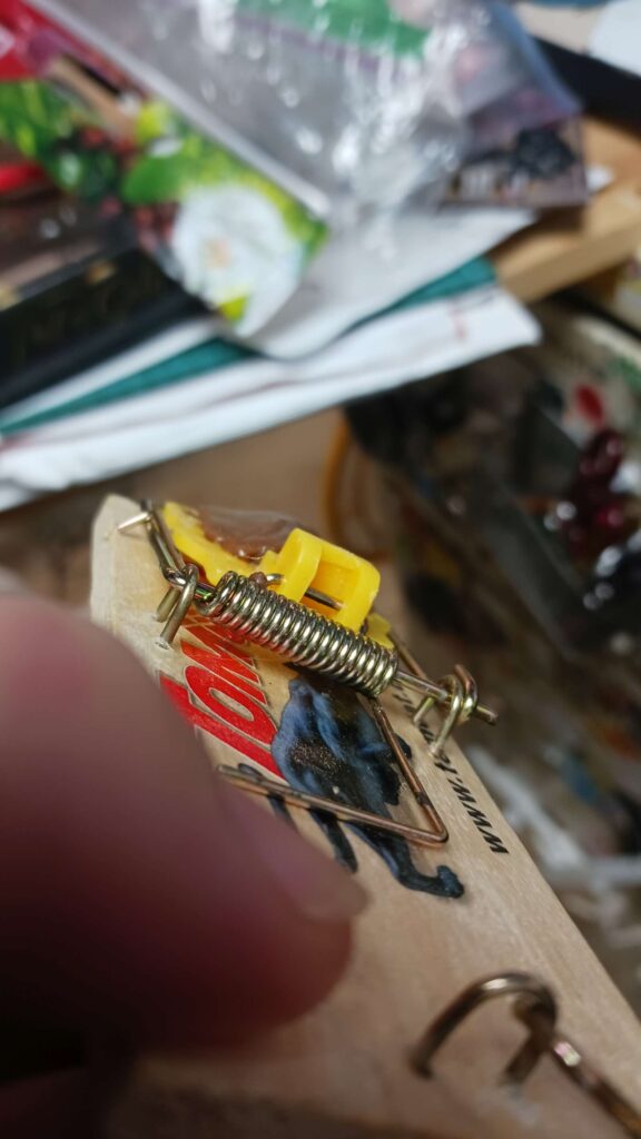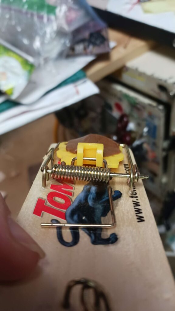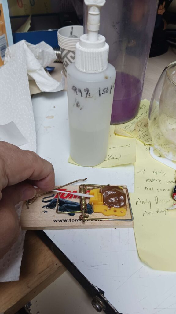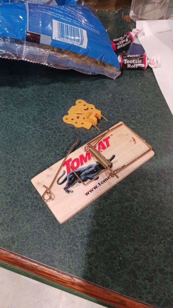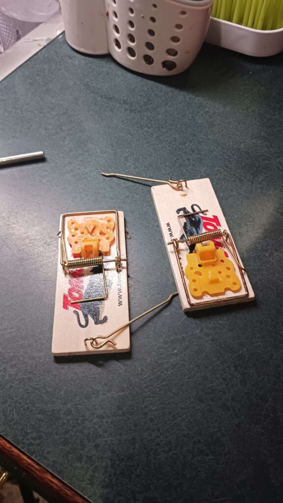 mouse war – set 3 traps (2 laundry, 1 bar), with tootsie rolls + a bit of pb on the back side; traps are getting harder to set, so easy to trip; tried to clean out the little cavitry where the hook goes into, ic case its been getting oily from the pb?