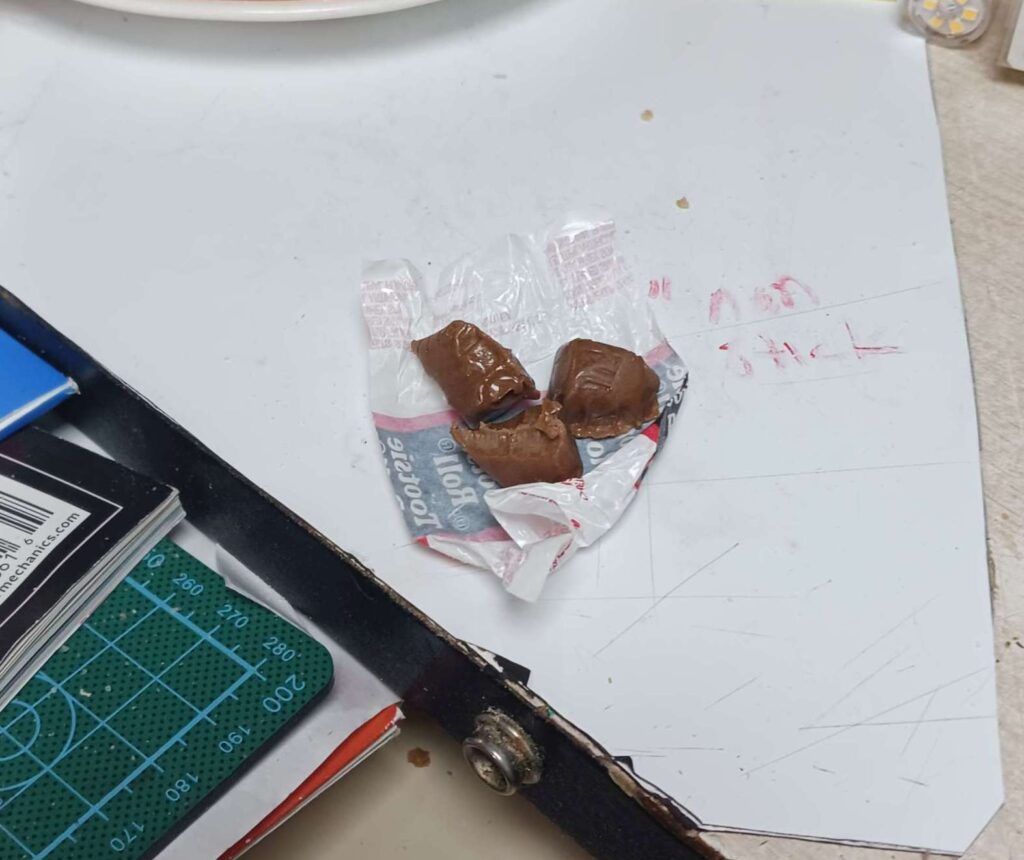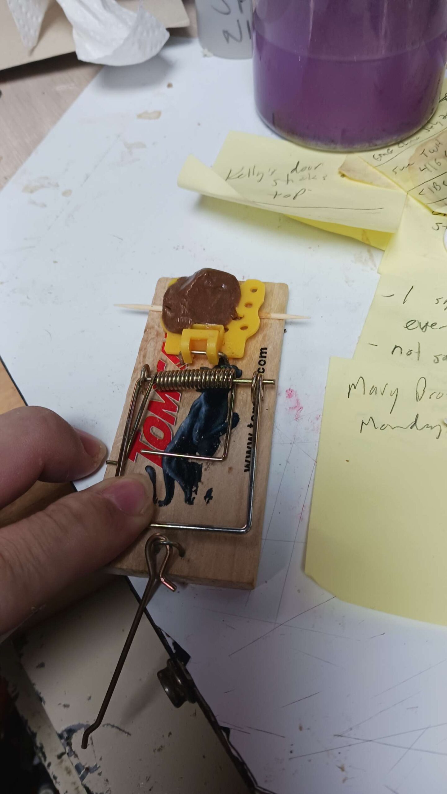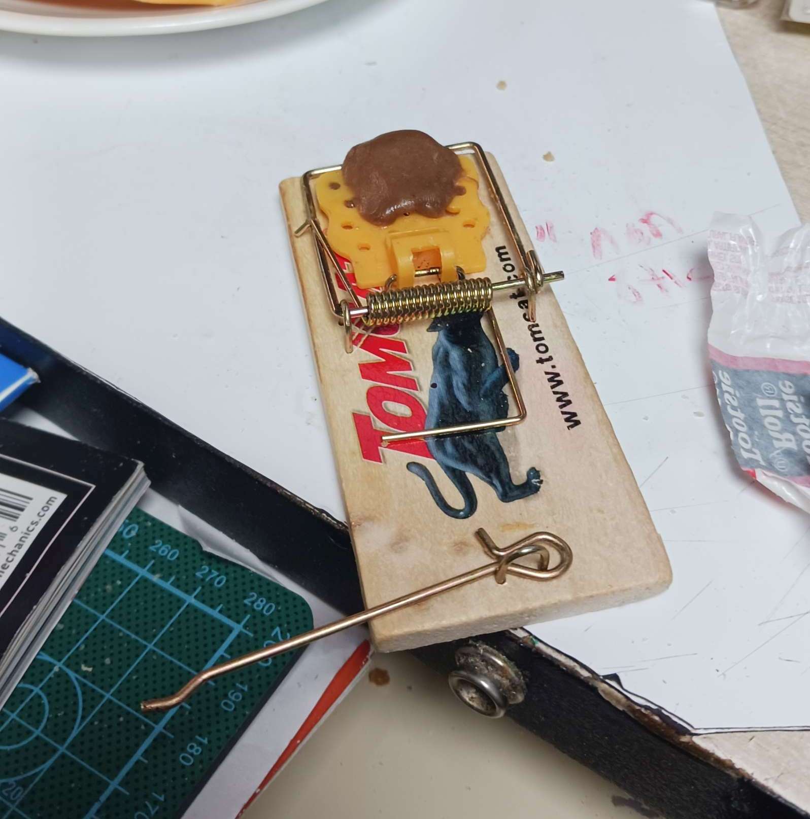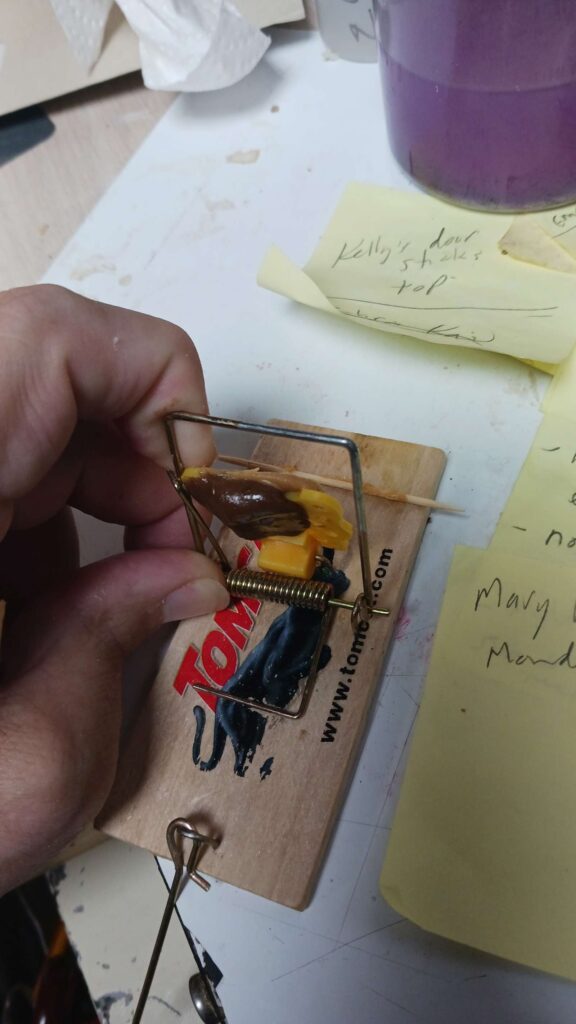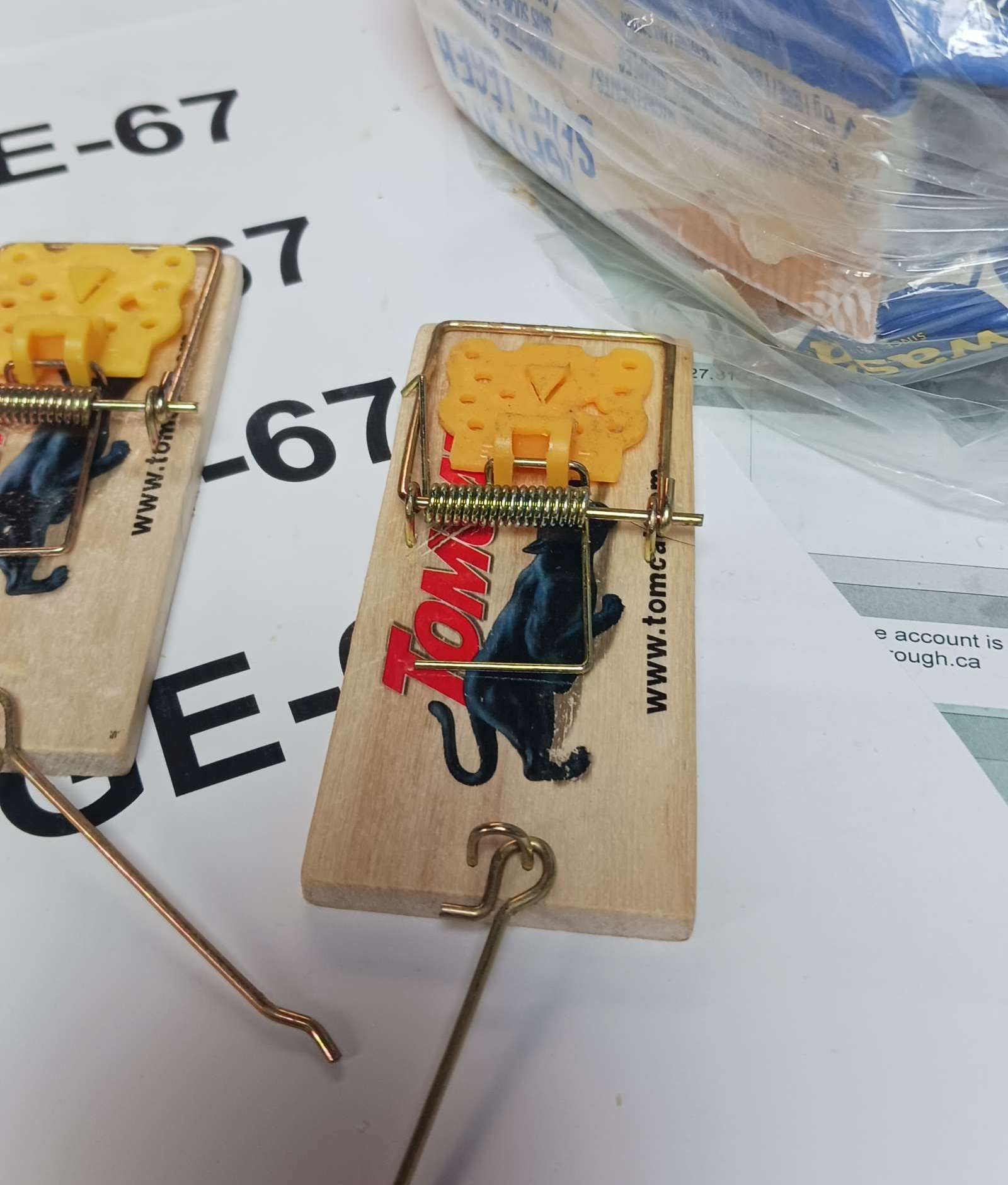 mouse war – set 3 traps (2 laundry, 1 bar), with tootsie rolls + a bit of pb on the back side; traps are getting harder to set, so easy to trip; tried to clean out the little cavitry where the hook goes into, ic case its been getting oily from the pb?