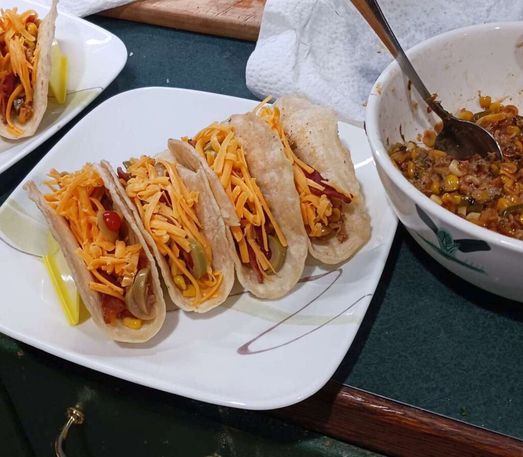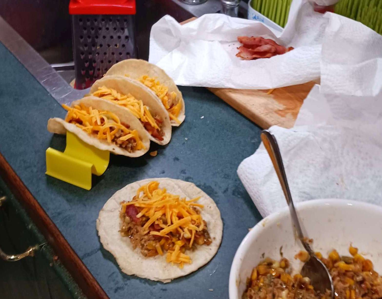 more tacos! the 4-banger holders work perfecdtly. seems better to put the 4 tortillas into the hodler, then fill all 4, this prevents witching tasks (grab spoon, bowl of corn, spoon base into tortillas x4, then switch to olives, grab handful, drop onto tacos while passing hand over them; then switch to cherese, grab handful, drop over tacos., etc.