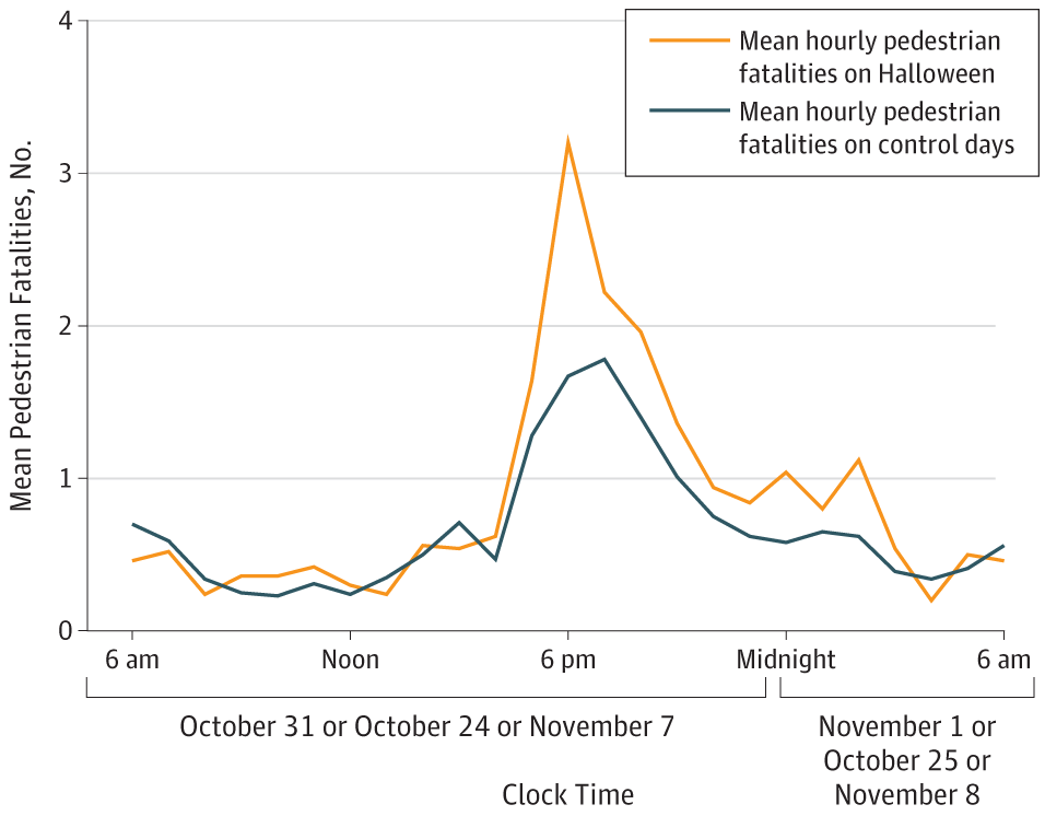 The entire study interval included 1 580 608 fatal traffic crashes involving 2 333 302 drivers and 268 468 pedestrians. A total of 608 pedestrian fatalities occurred on the 42 Halloween evenings, whereas 851 pedestrian fatalities occurred on the 84 control evenings. Absolute mortality rates averaged 2.07 and 1.45 pedestrian fatalities per hour, respectively. The relative risk of a pedestrian fatality was 43% higher on Halloween compared with control evenings (odds ratio, 1.43 [95% CI, 1.29-1.59]; P < .001). The average Halloween resulted in 4 additional pedestrian deaths.