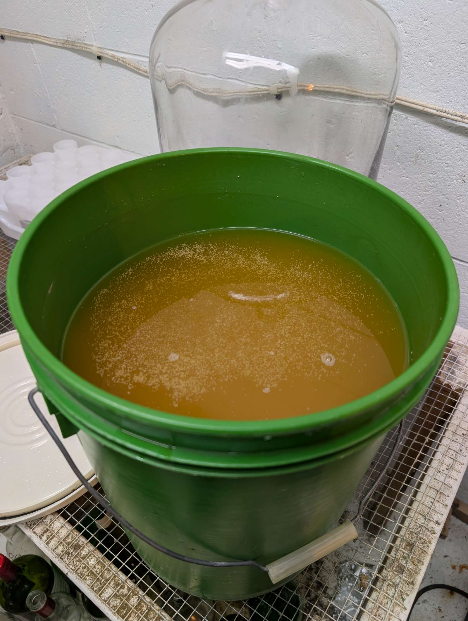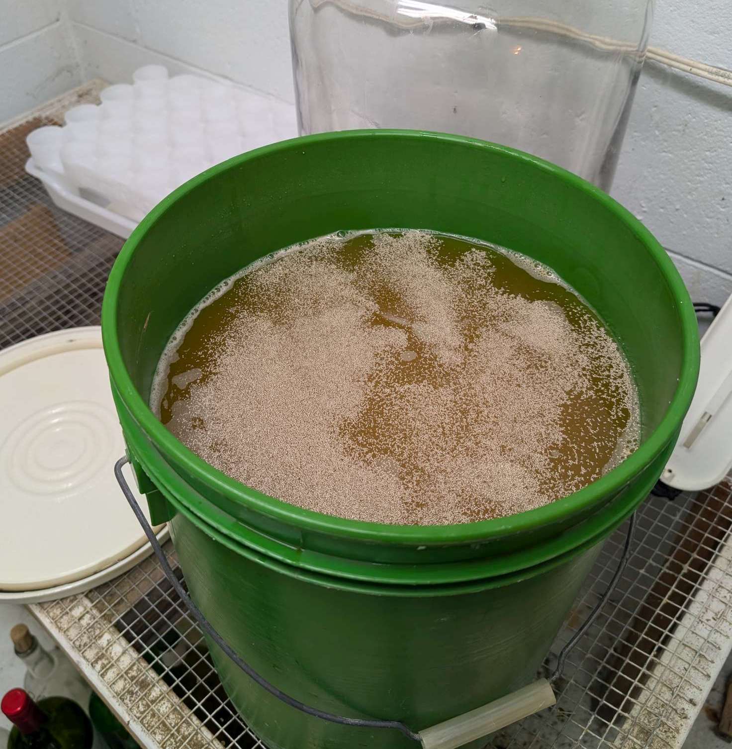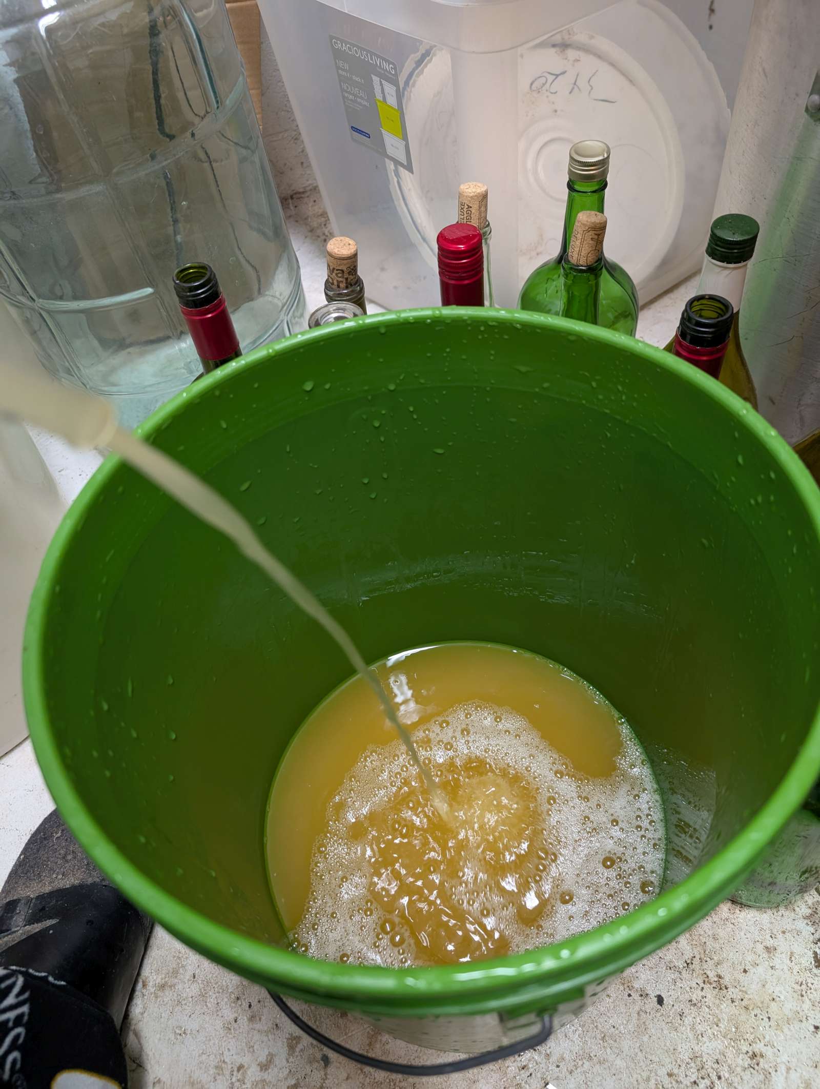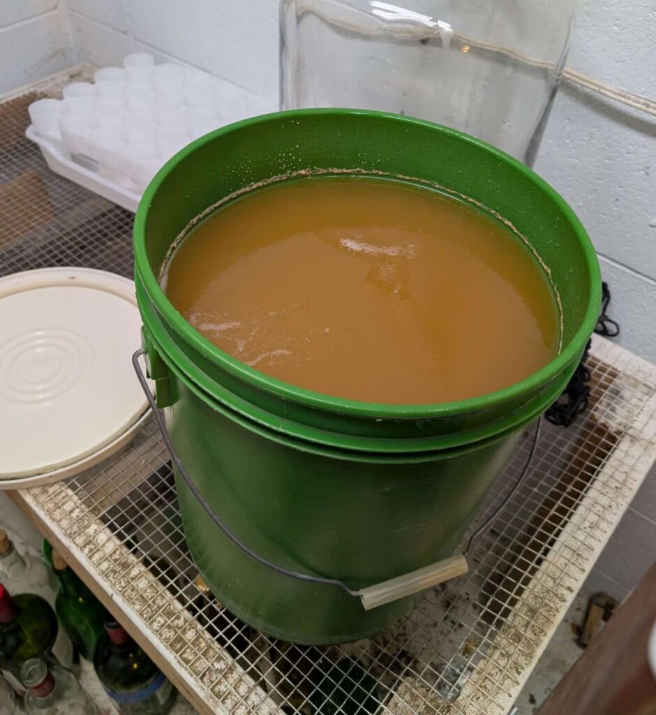 — 2024-12-17 – Tuesday – day 24 – no progress; transferred to new bucket, aerating as it goes, avoiding the goo (dead yeast) at the bottom; then added 1/4c white sugar, yeast package, and “booster”, gave it a vigourous 30-second stir.