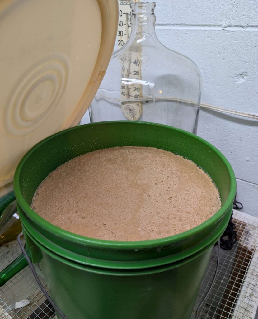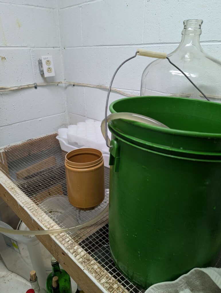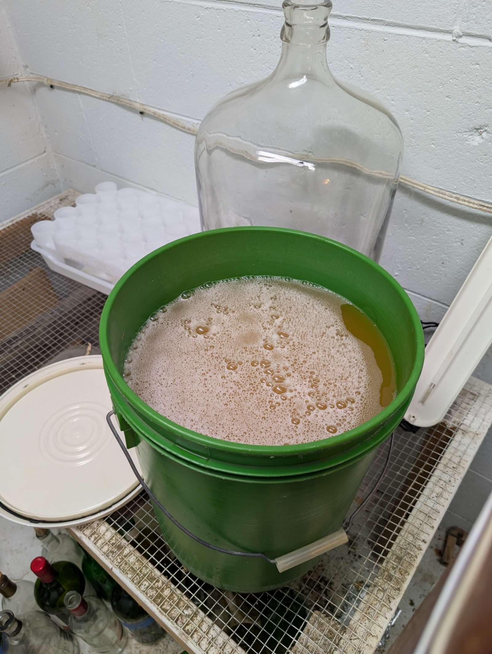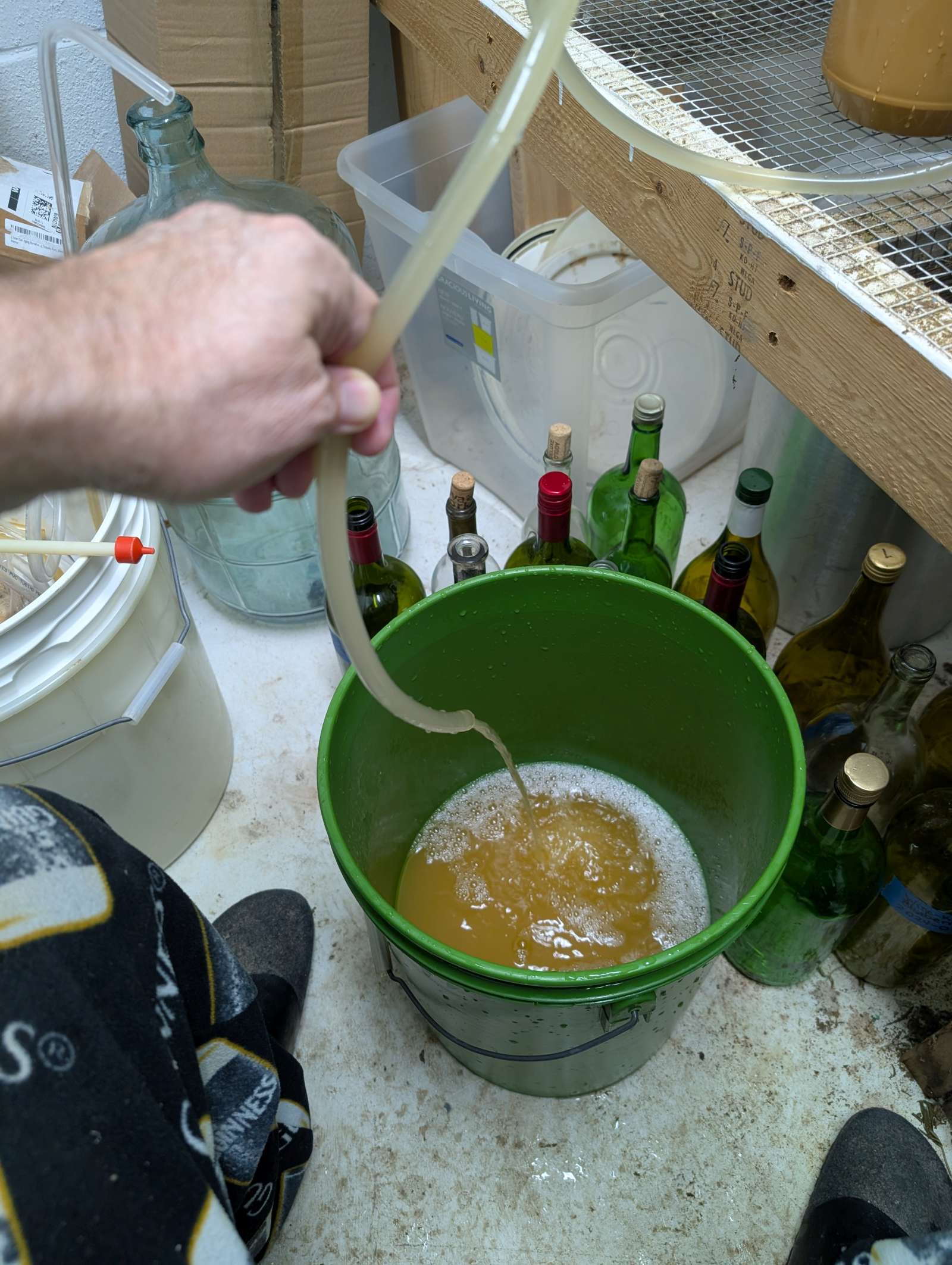 — 2024-12-17 – Tuesday – day 24 – no progress; transferred to new bucket, aerating as it goes, avoiding the goo (dead yeast) at the bottom; then added 1/4c white sugar, yeast package, and “booster”, gave it a vigourous 30-second stir.