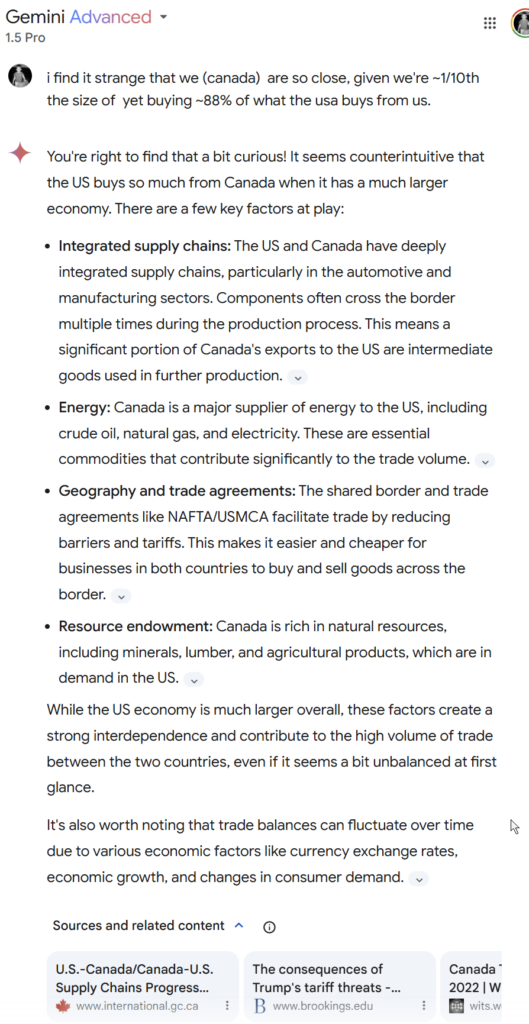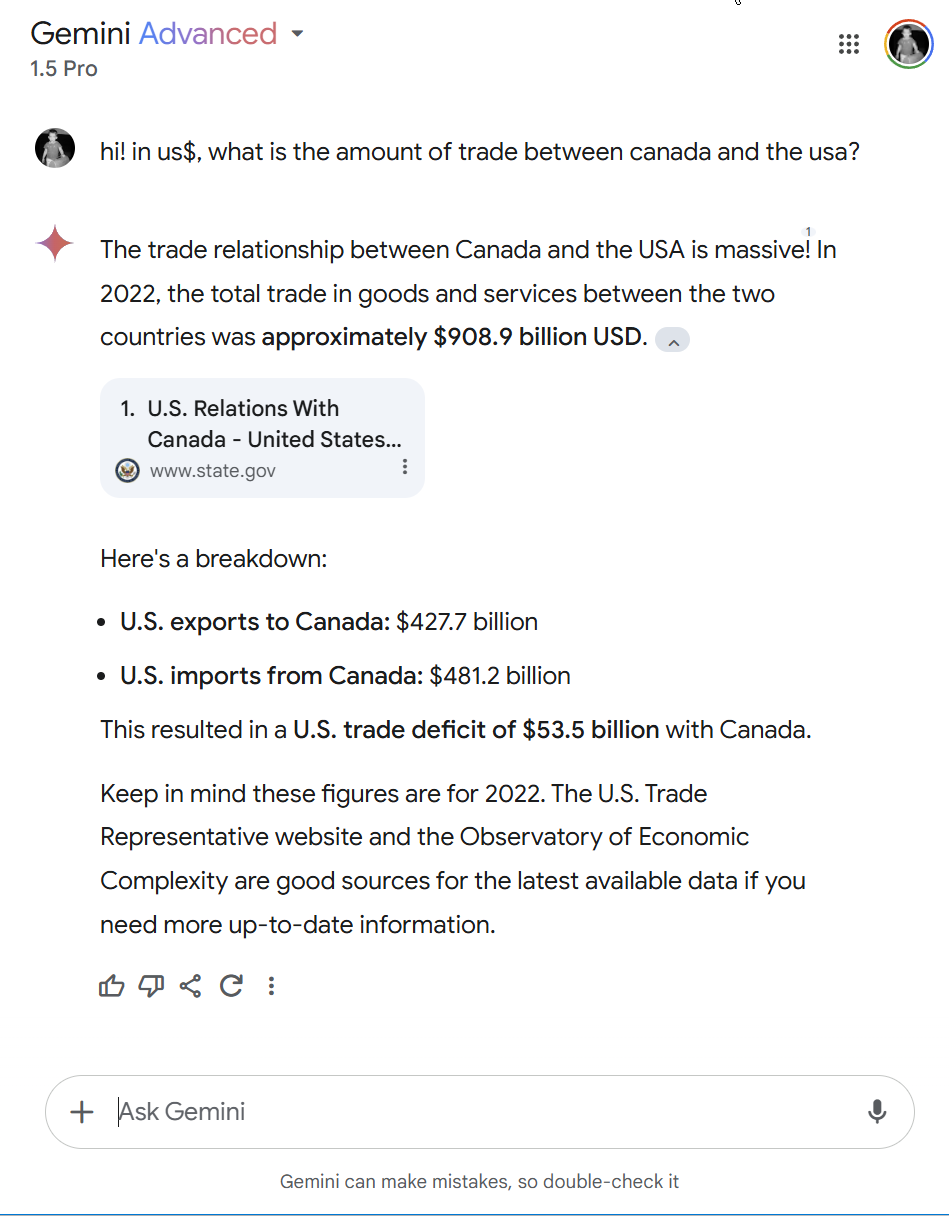 so is tfg really that stupid that he beleives the us deficit with canada is 100B$ (we buy 400$B from them, they buy 400+100=500B$, etimated from 2022’s numbers (see below for chat with gemini.