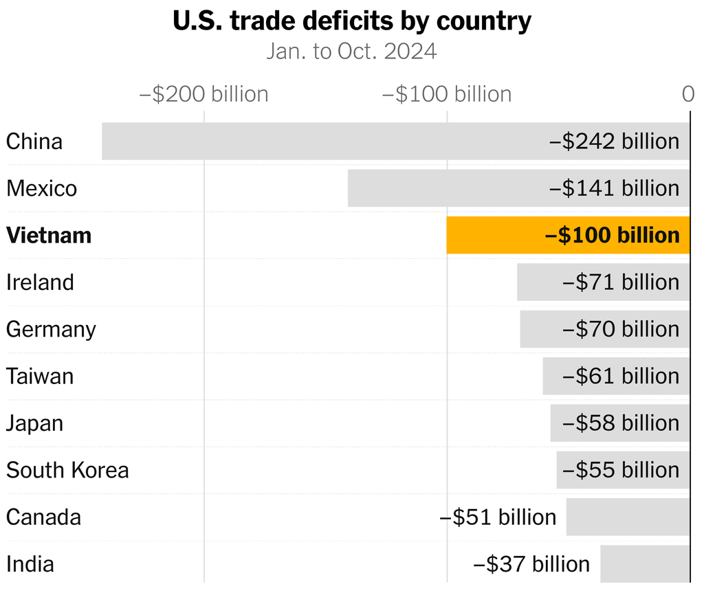 article mentions how companies moved out of china to vietnam as a response to tfg’s 2018 tarrifs on china. unintended consequences. also, canada isn’t $100B deficiet, maybe 65B?