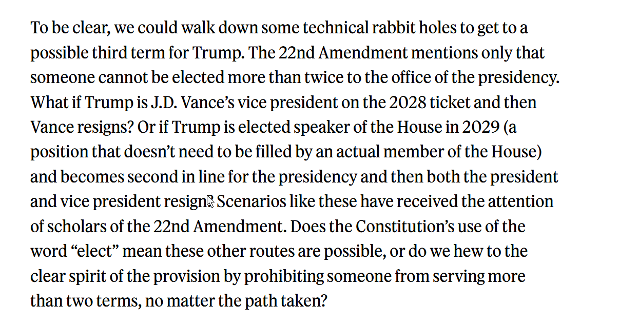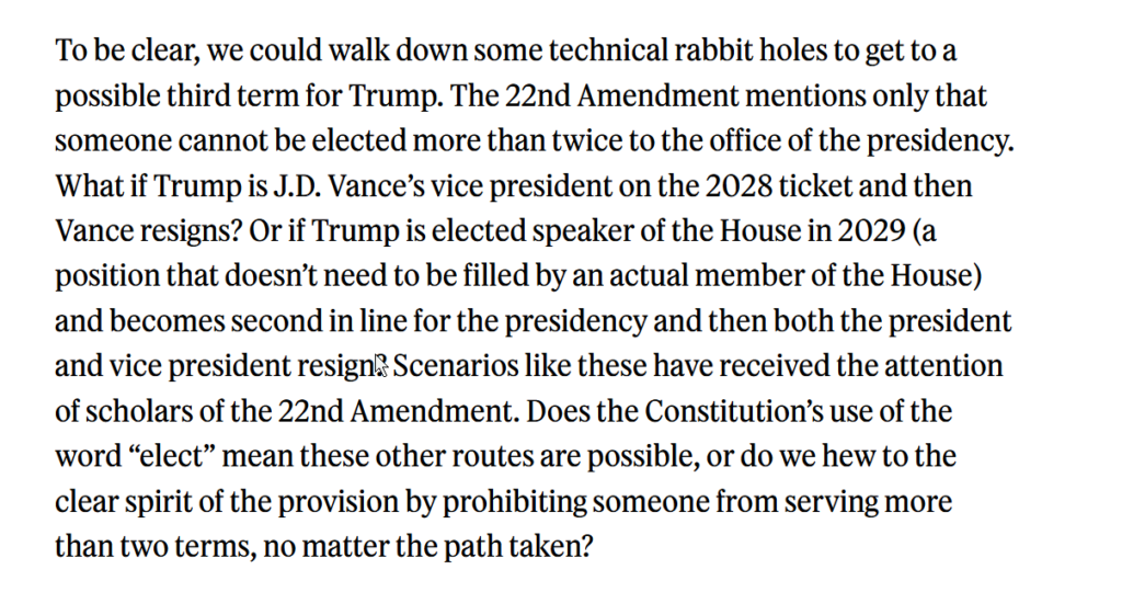 “To be clear, we could walk down some technical rabbit holes to get to a possible third term for Trump. The 22nd Amendment mentions only that someone cannot be elected more than twice to the office of the presidency. What if Trump is J.D. Vance’s vice president on the 2028 ticket and then Vance resigns? Or if Trump is elected speaker of the House in 2029 (a position that doesn’t need to be filled by an actual member of the House) and becomes second in line for the presidency and then both the president and vice president resign? Scenarios like these have received the attention of scholars of the 22nd Amendment. Does the Constitution’s use of the word “elect” mean these other routes are possible, or do we hew to the clear spirit of the provision by prohibiting someone from serving more than two terms, no matter the path taken?”