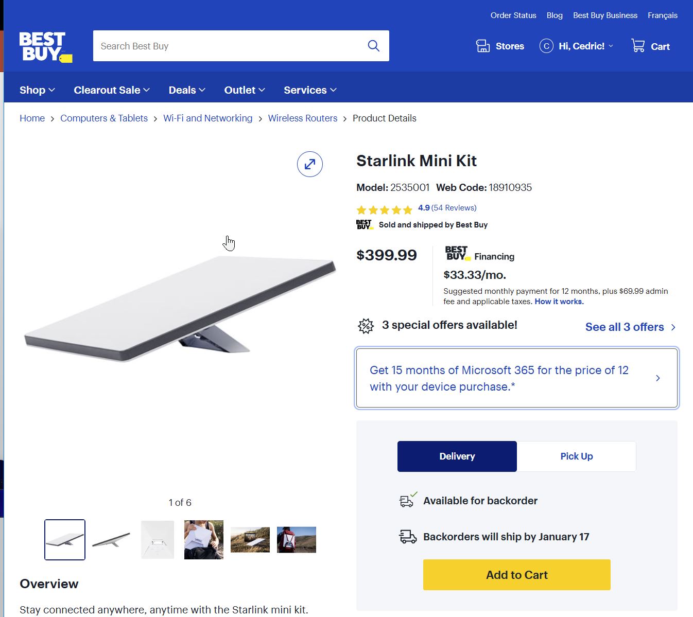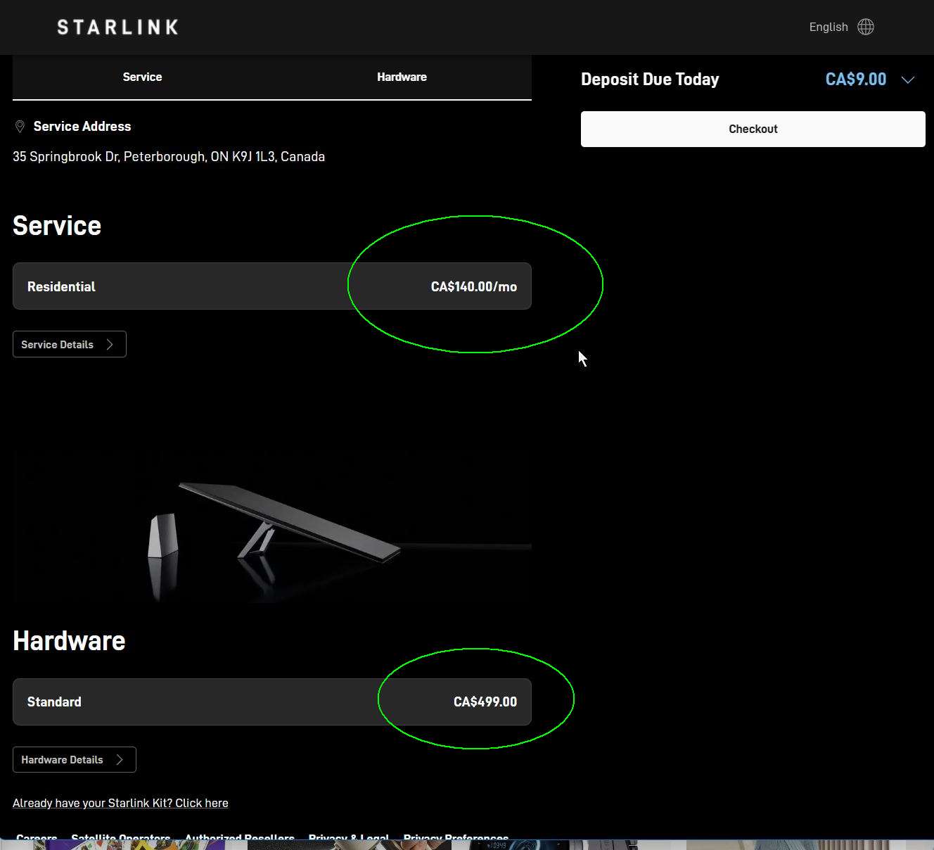 Hardware: C$400 from Best Buy. Same from CostCo? C$500 from Starlink directly. Might be backordered?