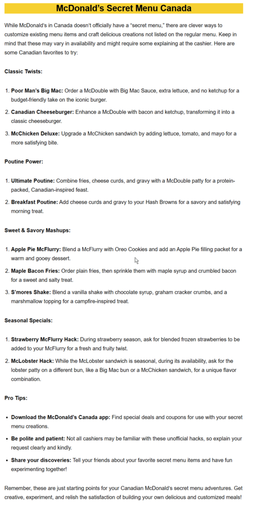 Remember, these are just starting points for your Canadian McDonald’s secret menu adventures. Get creative, experiment, and relish the satisfaction of building your own delicious and customized meals!