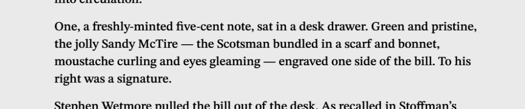 “One, a freshly-minted five-cent note, sat in a desk drawer. Green and pristine, the jolly Sandy McTire — the Scotsman bundled in a scarf and bonnet, moustache curling and eyes gleaming — engraved one side of the bill. To his right was a signature.
