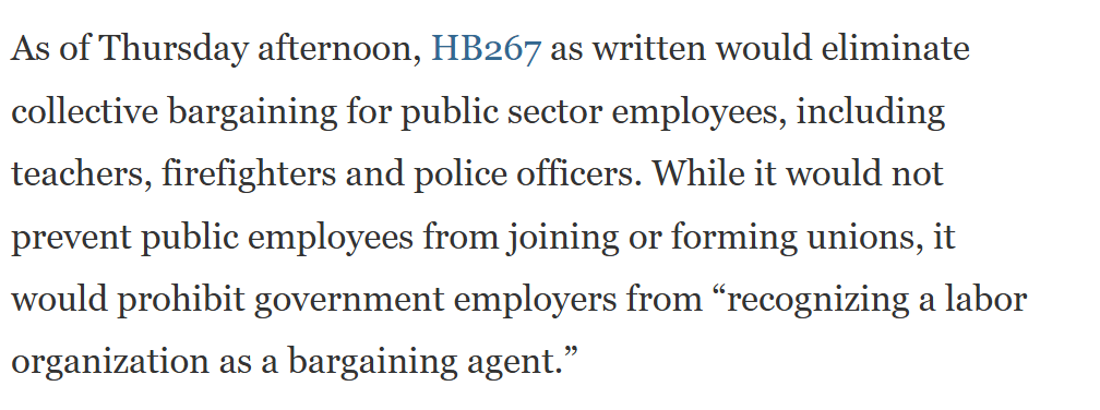 As of Thursday afternoon, HB267 as written would eliminate collective bargaining for public sector employees, including teachers, firefighters and police officers. While it would not prevent public employees from joining or forming unions, it would prohibit government employers from “recognizing a labor organization as a bargaining agent.”