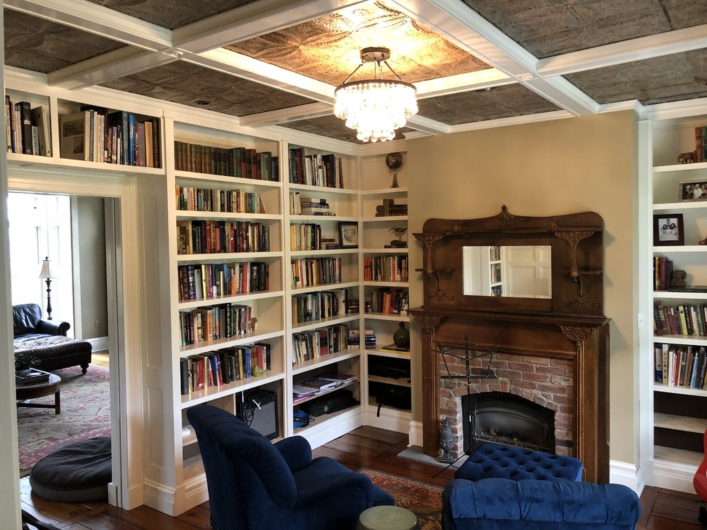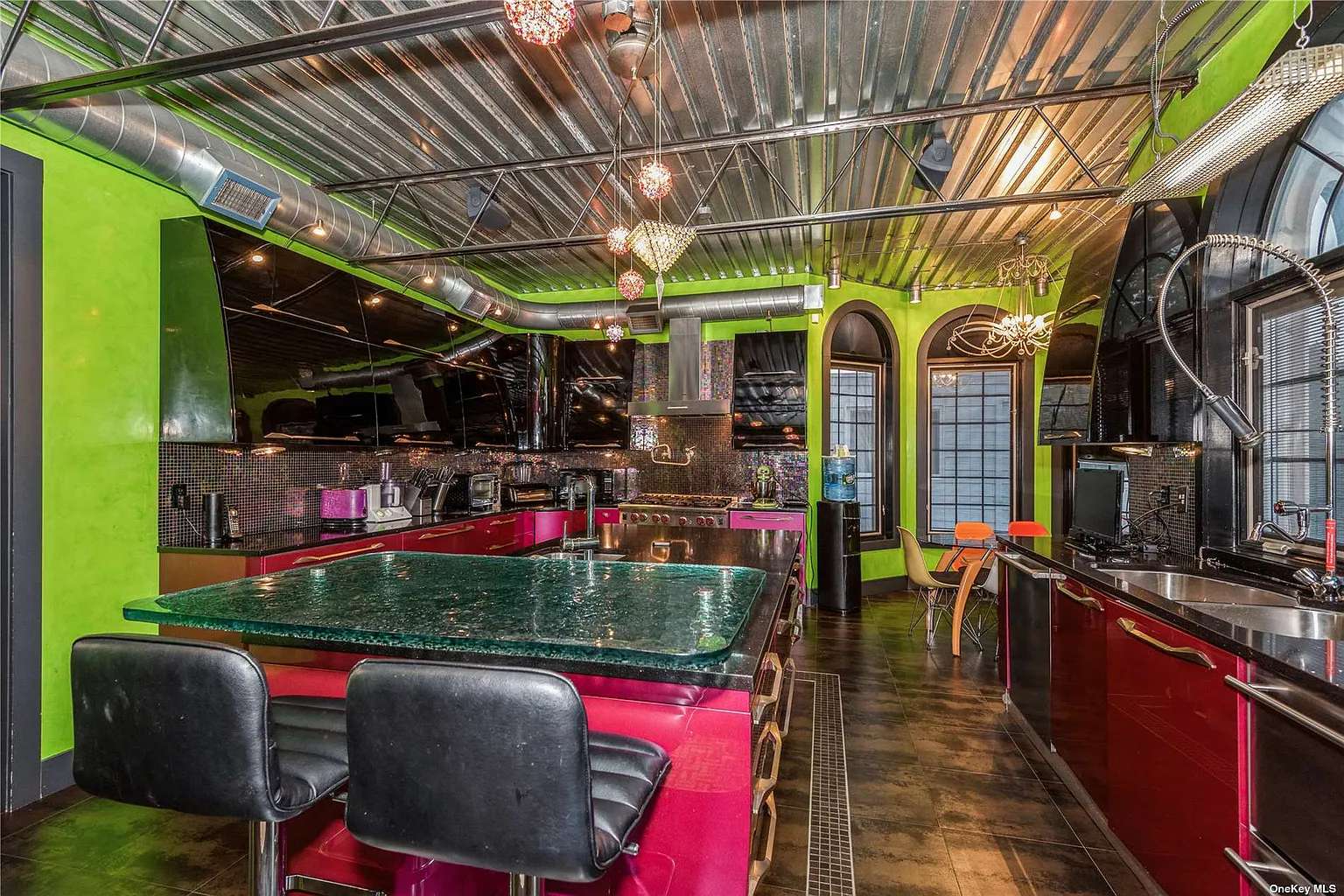 this would be for the tv end, aligned with the flooring. thinks something “tin tile”-ish for over the bar area. see below this gallery