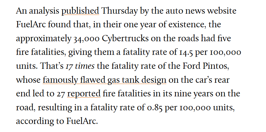 “An analysis published Thursday by the auto news website FuelArc found that, in their one year of existence, the approximately 34,000 Cybertrucks on the roads had five fire fatalities, giving them a fatality rate of 14.5 per 100,000 units. That’s 17 times the fatality rate of the Ford Pintos, whose famously flawed gas tank design on the car’s rear end led to 27 reported fire fatalities in its nine years on the road, resulting in a fatality rate of 0.85 per 100,000 units, according to FuelArc.”