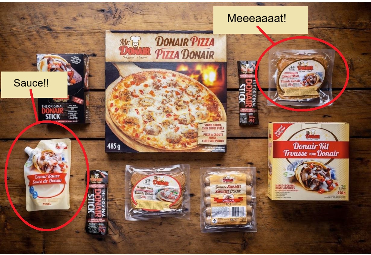 the donair kits we get from Giant Tiger (maybe FreshCo?) are pretty good, since some donair is better than no donair. the meat is good, easy to prepare (microwave 1.5mins, then air fry or pan fry to get some crispy bits); sauce is very good, and enough, could be more, but i like a wetter donair.