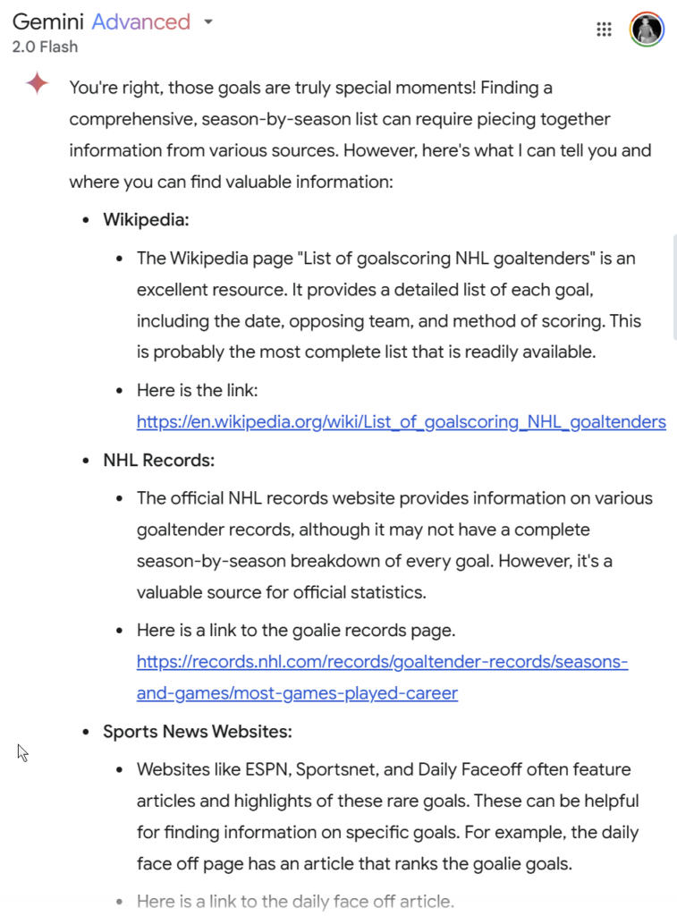 asked Gemini: turns out there’s a wikipedia entry for goaltender goals. which lead me to ask about “own goals”; turns out no easy-to-find list. maybe ask nhl stats guys for a list, and add to the wikipedia entry? can I edit an wikipedia entry?