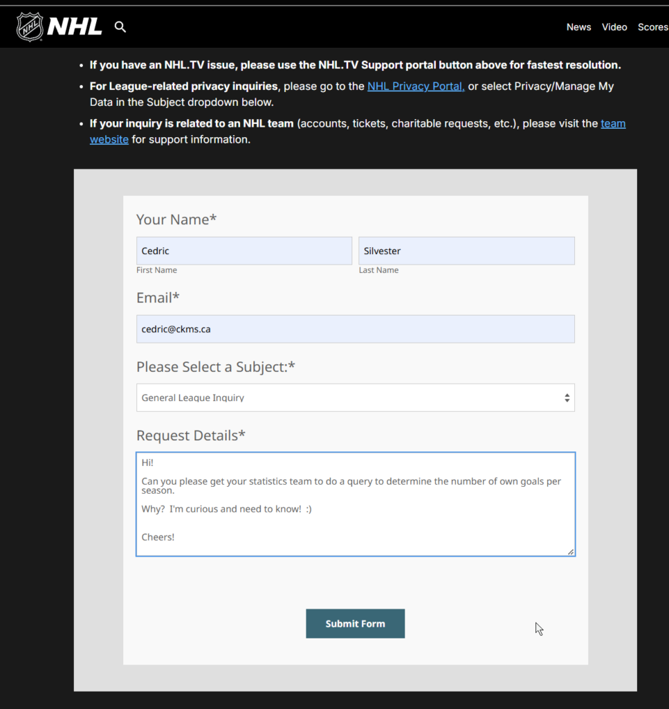 i used nhl website to find contact us, sent an email: