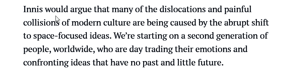 “Innis would argue that many of the dislocations and painful collisions of modern culture are being caused by the abrupt shift to space-focused ideas. We’re starting on a second generation of people, worldwide, who are day trading their emotions and confronting ideas that have no past and little future.”