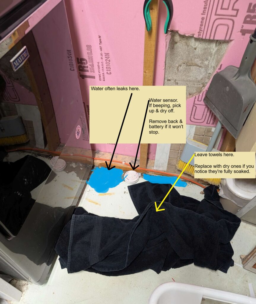 usually we can keep up by using towels: on floor to absorb water; once soaked, into washer; spin dry; dryer; 8 towels can usually handle the leak and dryer.