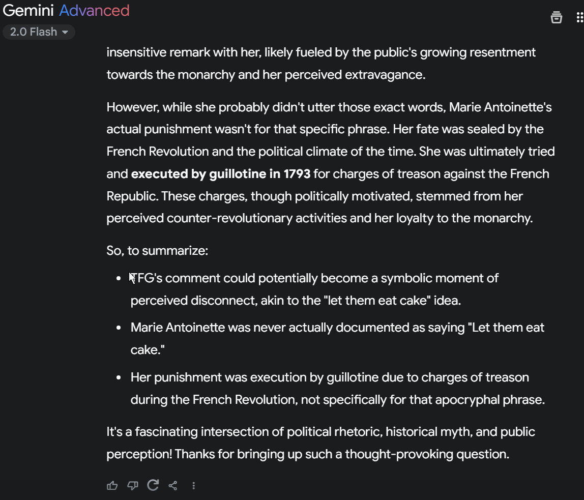 but what was the punishment for Marie A. saying that famous phrase? ask gemini? Herer’s the tl;dr: