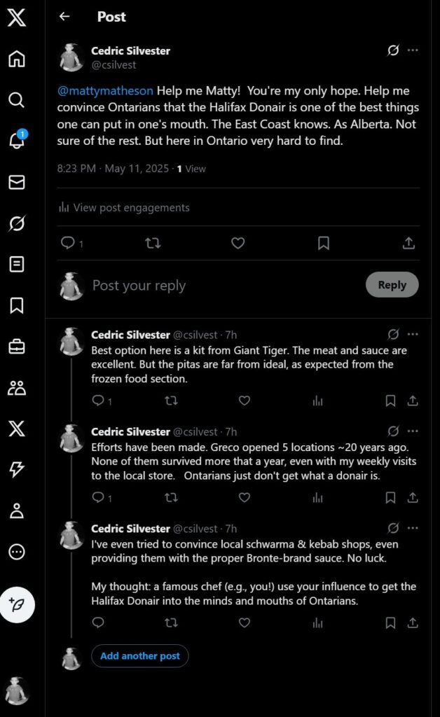 Posted in Article my-plea-to-matty-matheson-donairs-in-ontario-2025-05-12 2025-05-12 Leave a Comment on my-plea-to-matty-matheson-donairs-in-ontario-2025-05-12 — 2025-05-12 – Monday – here’s what I sent to Matty Matheson on Twitter: ?????????????????????????????????????????????????