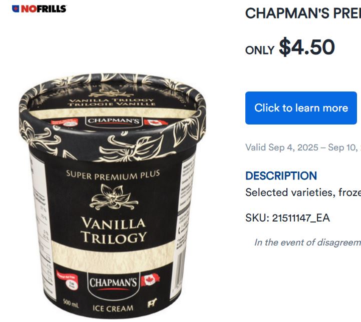 ice cream (No Frills, Chapman’s Premium)