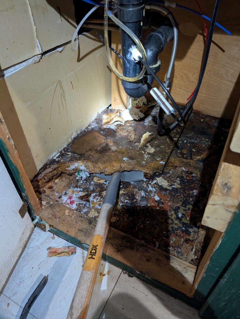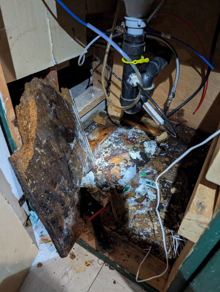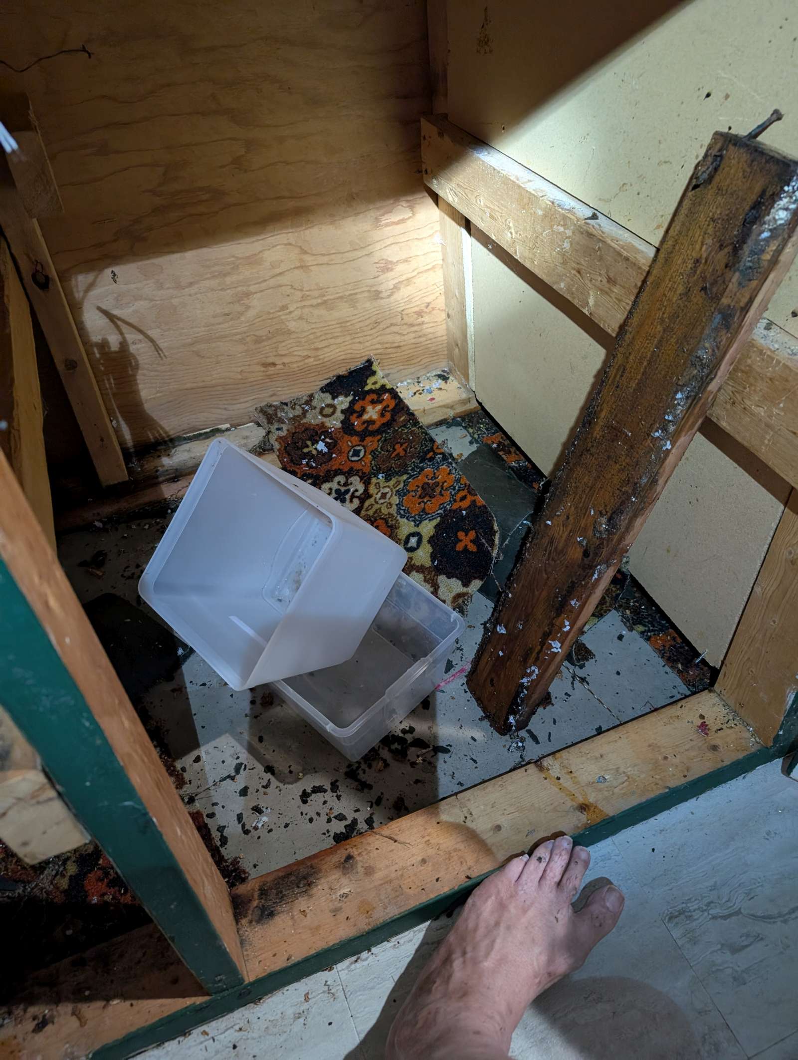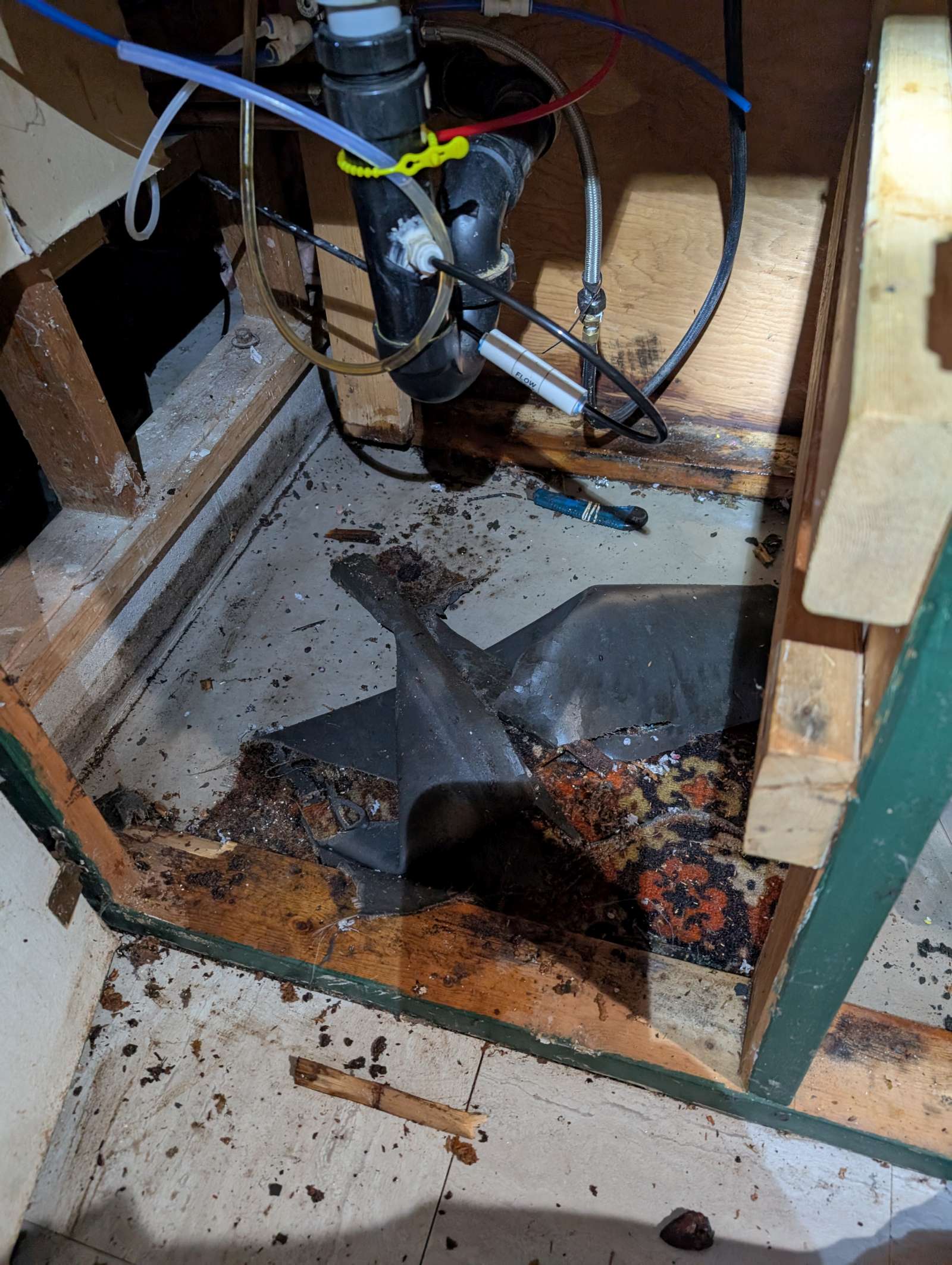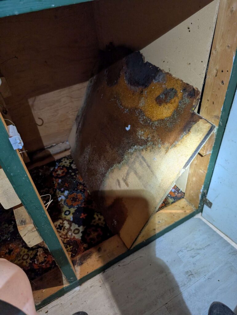 the floor under the bar sink is rotten, needs replacing. so I had to dig out the particle board, groovy old rug, and etc.