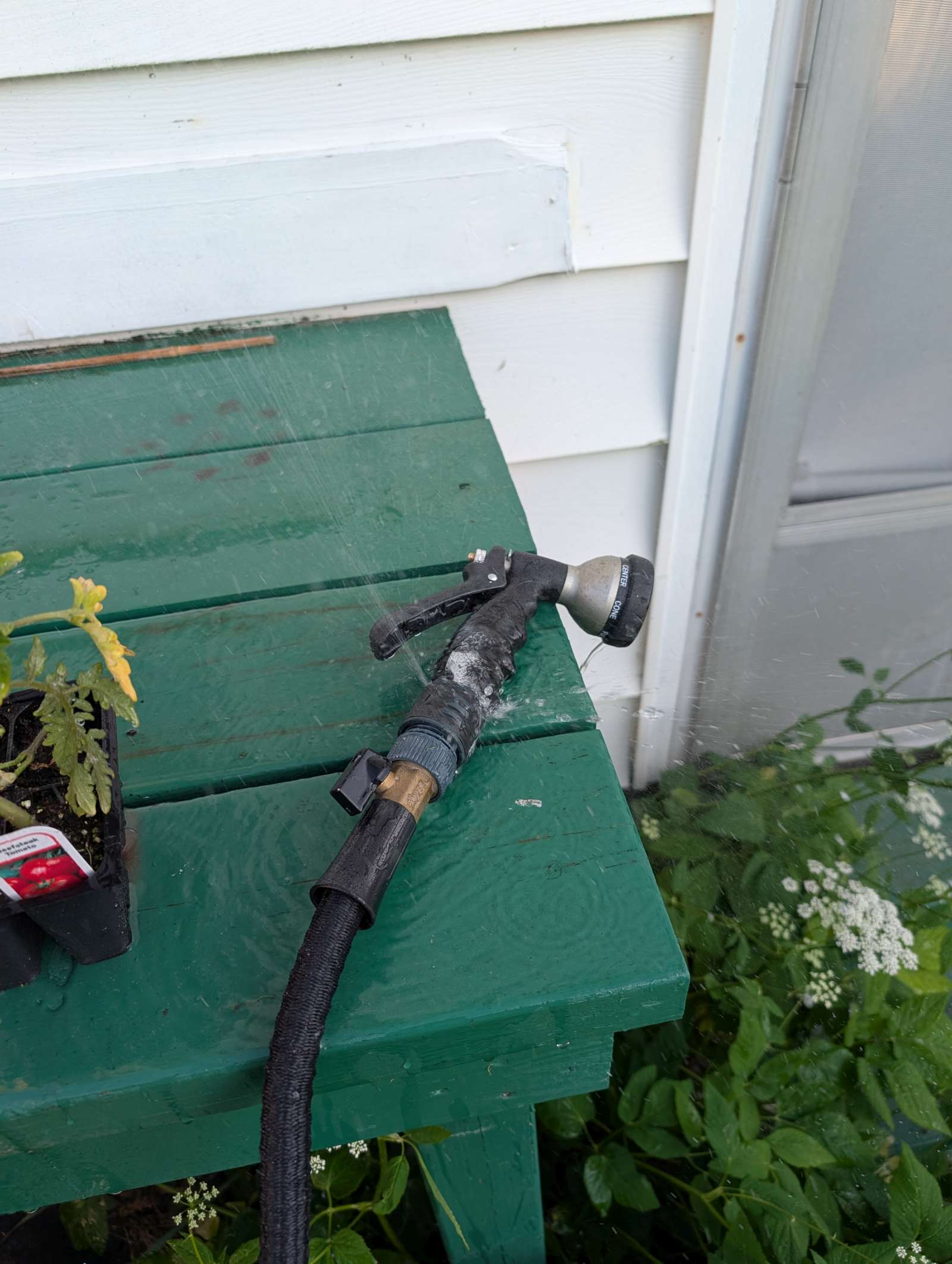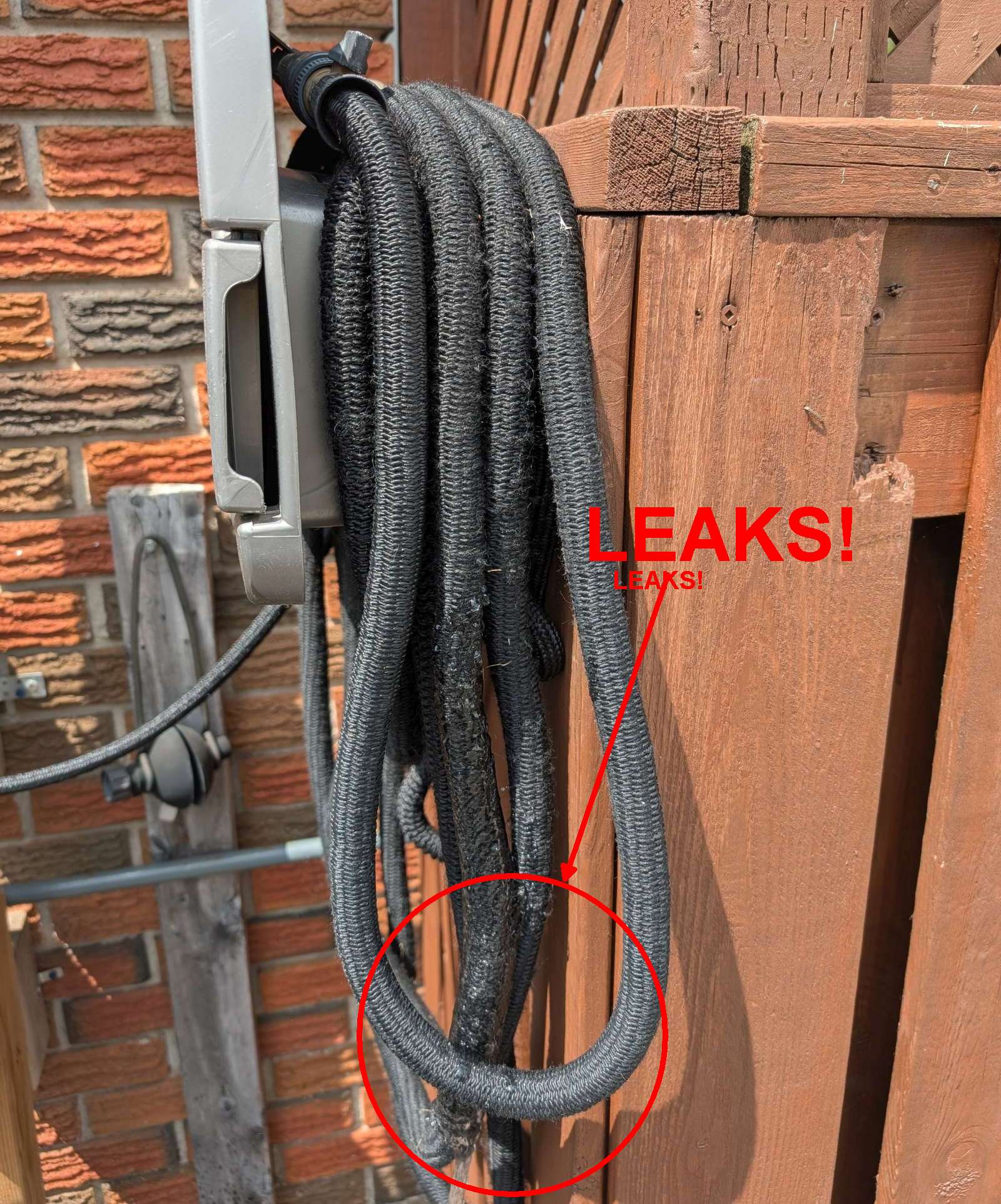 two fo these black hoses have leaks (driveway hose, backdoor hose) and the one at the back of the garage is leaking badly at the quick disconnect; hose is fine, so maybe replace the quick disconnect? also, add to the “prrepare for winter” list, since it linkely is damaged due to water freezing in it?