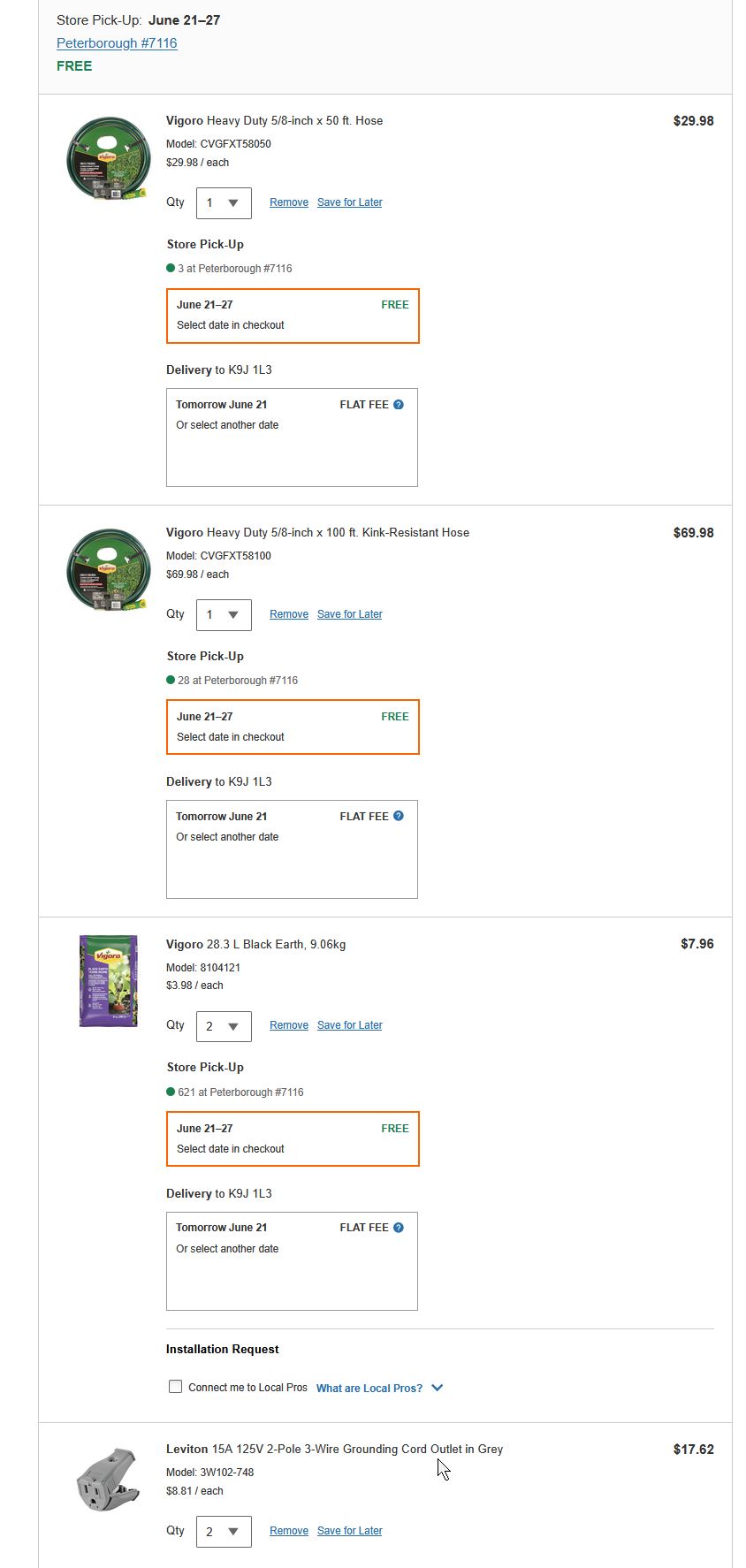 here’s a 50′ (for garage back corner) and a 100′ (for garage/driveway side) + 2 bags soil for tomato pots + 2 ac receptacles for bar: