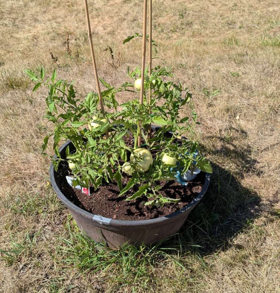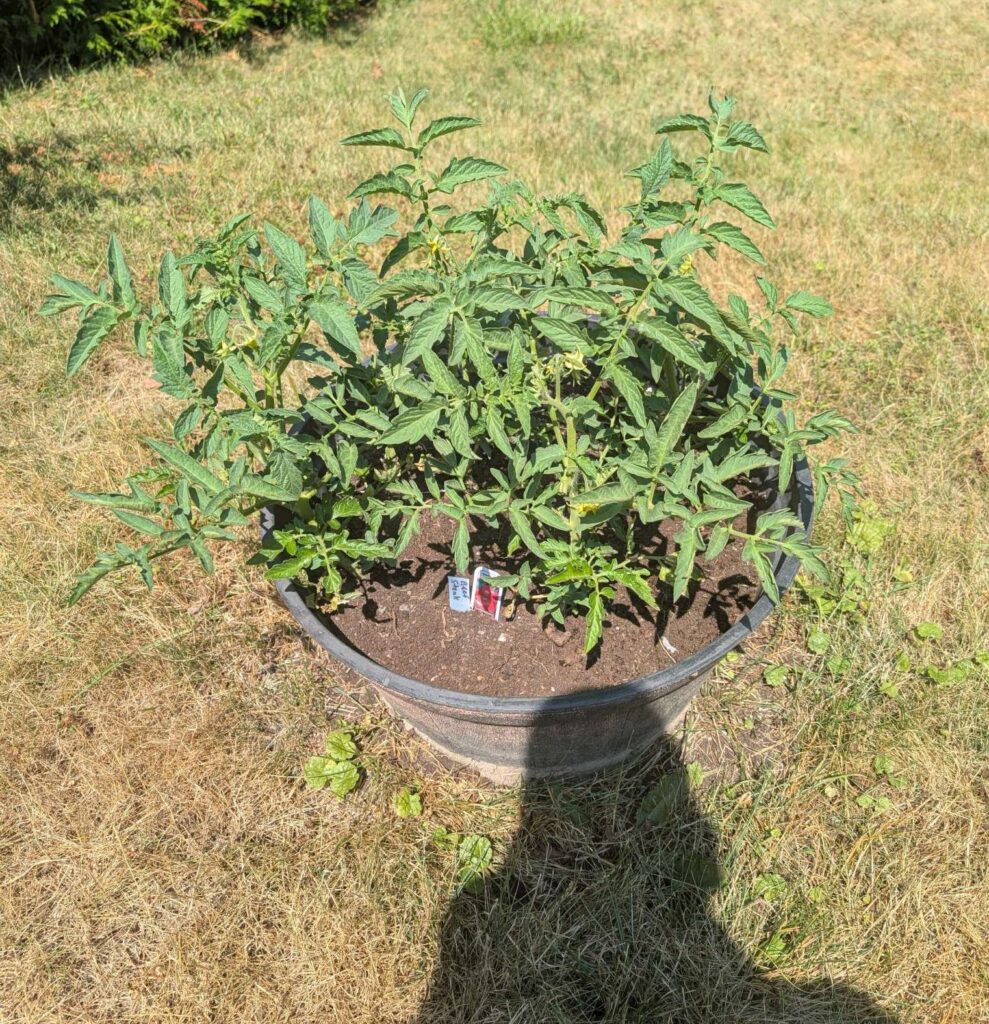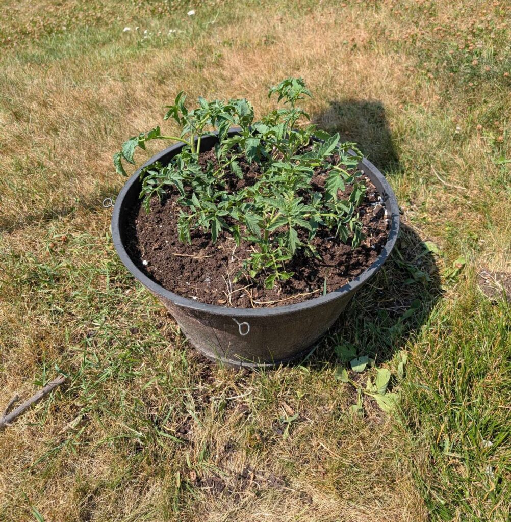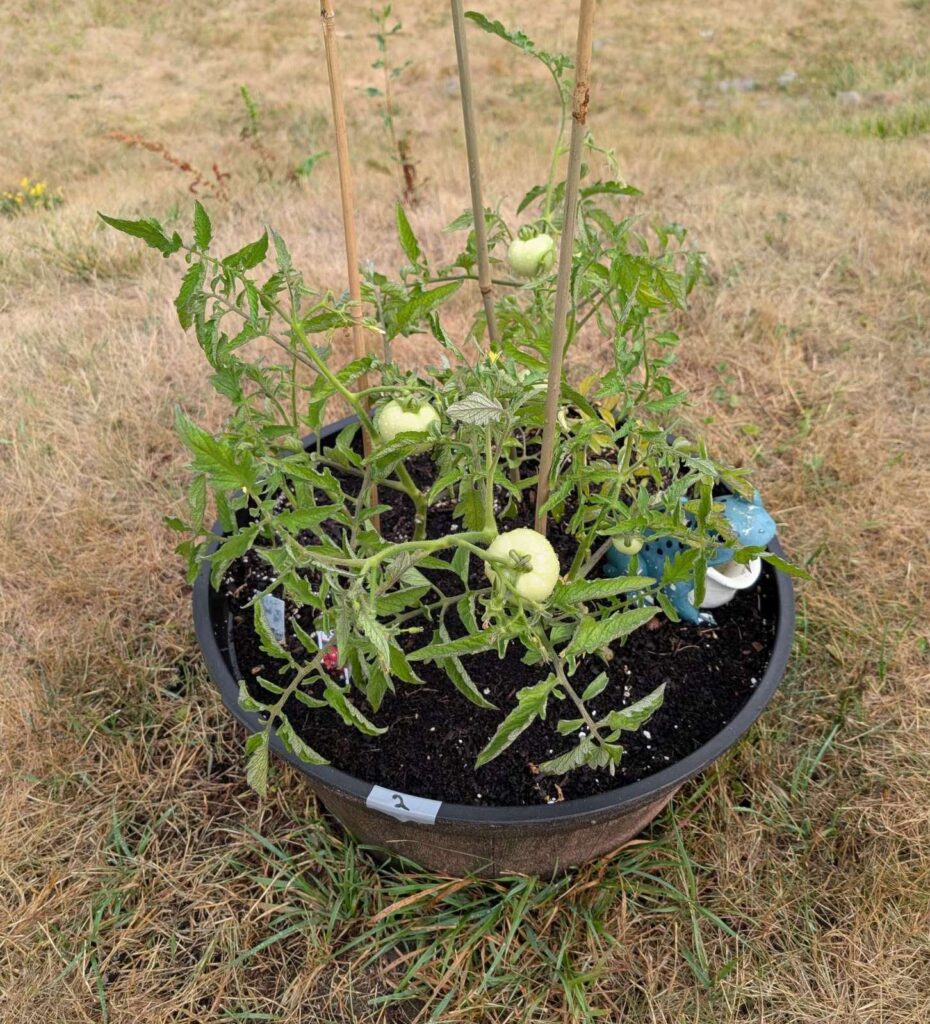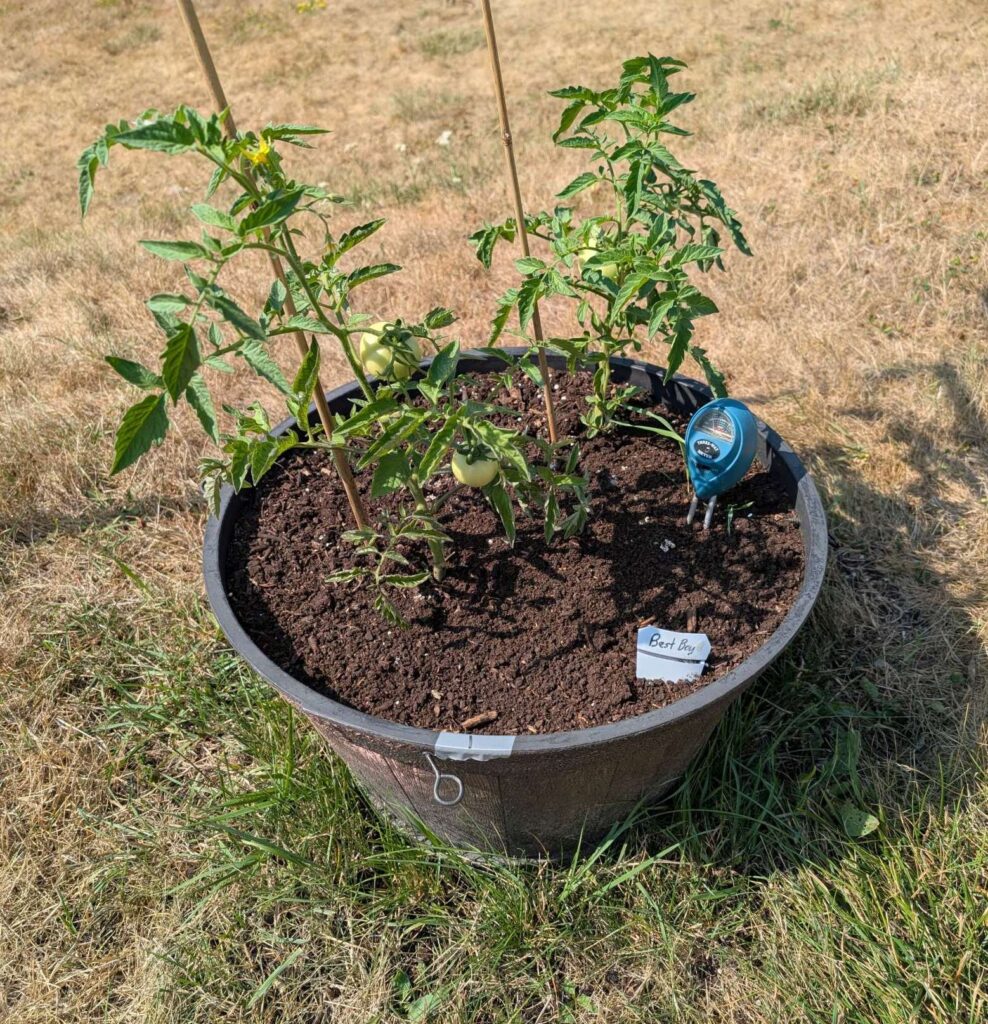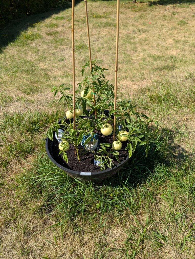 — 2025-08-02 – Saturday – day 38 – moved 1 Big Boy from pot 3 to pot 1; so now we have 2, 3, 3, 2 (counting from right to left); added soil to all pots; watered.
