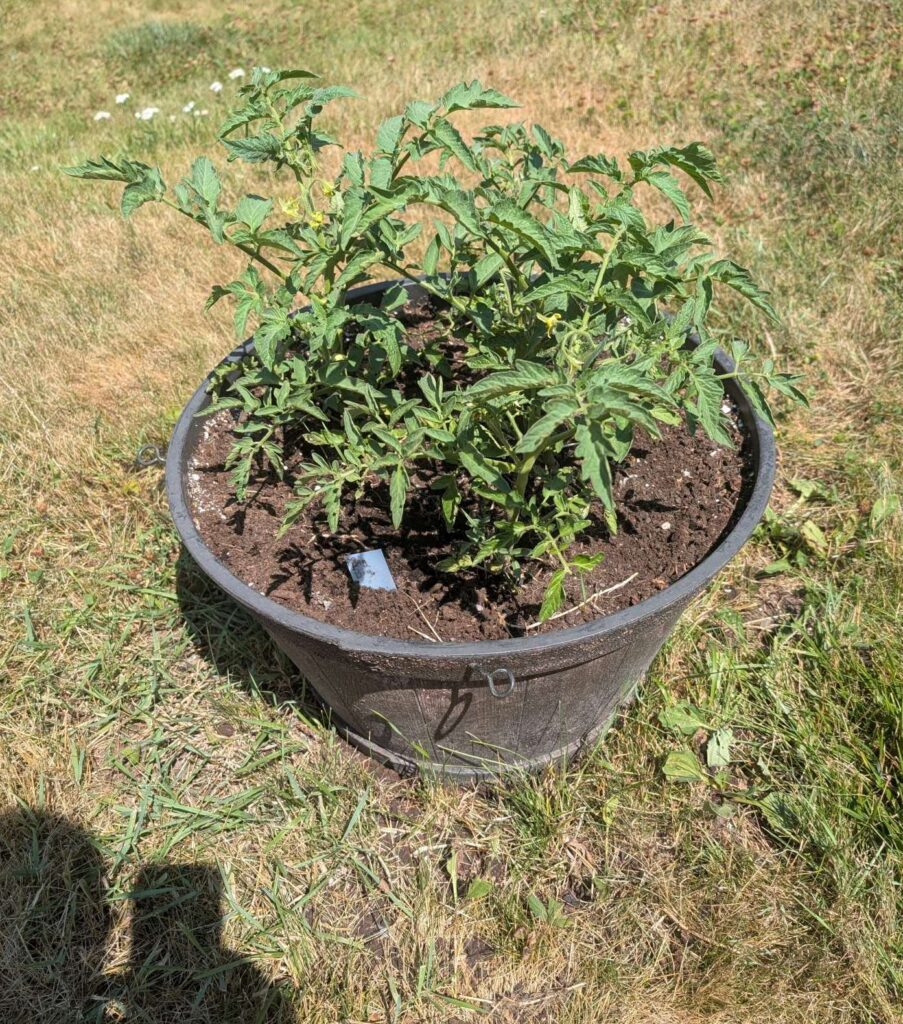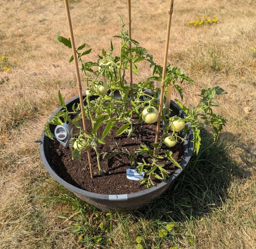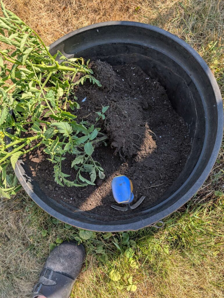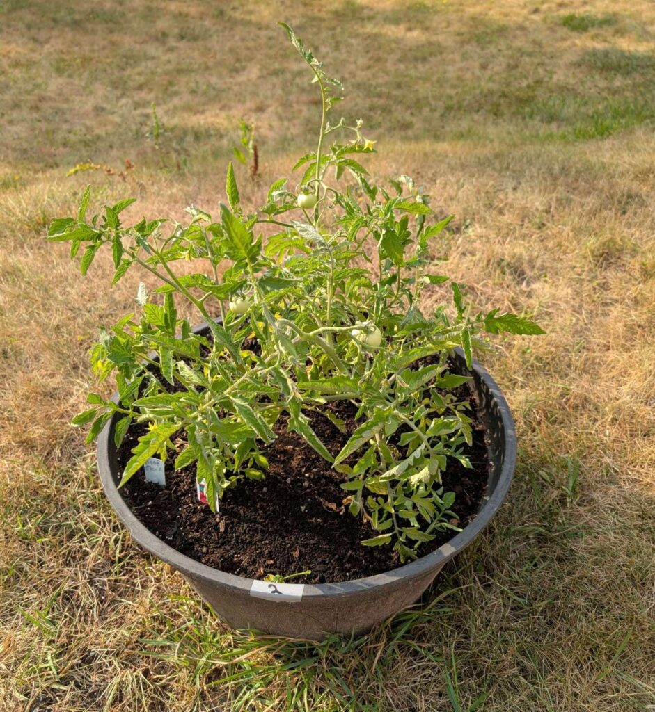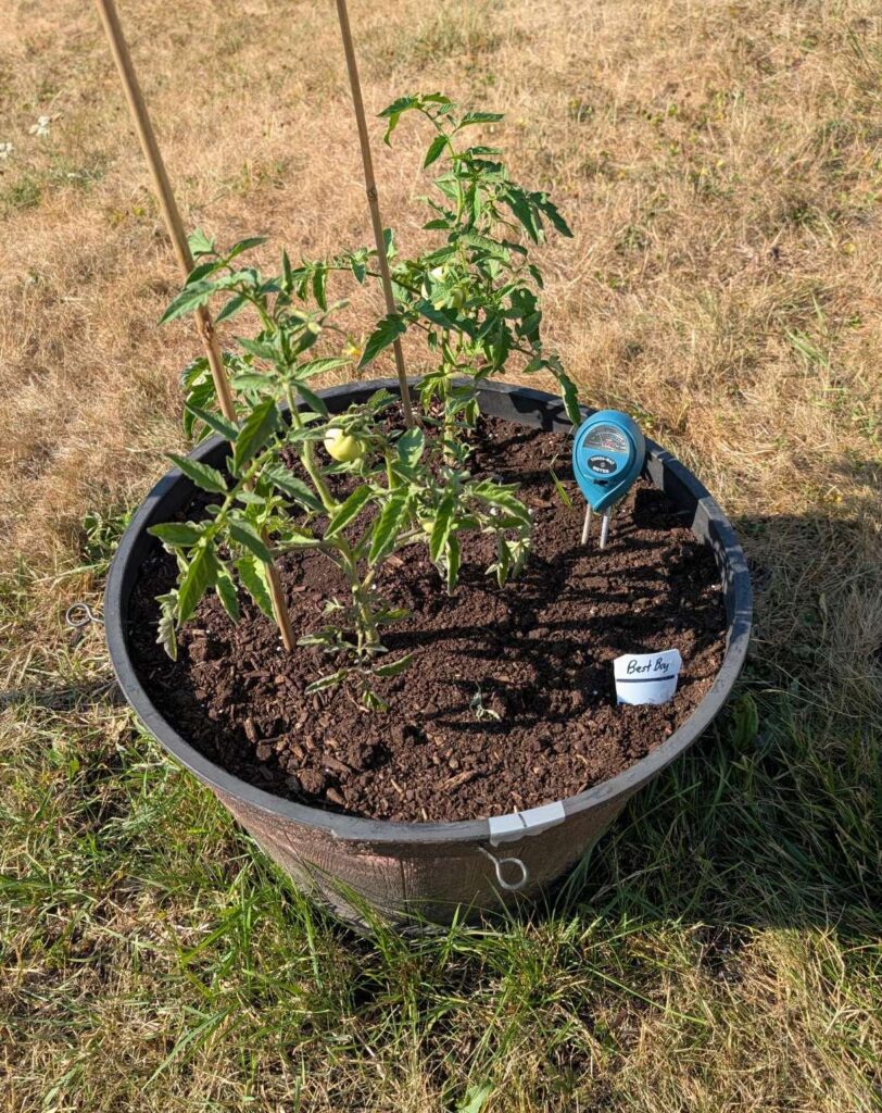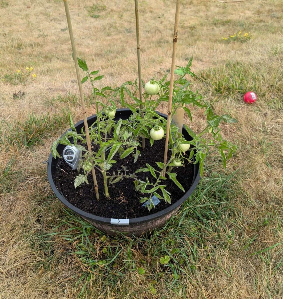 — 2025-08-02 – Saturday – day 38 – moved 1 Big Boy from pot 3 to pot 1; so now we have 2, 3, 3, 2 (counting from right to left); added soil to all pots; watered.