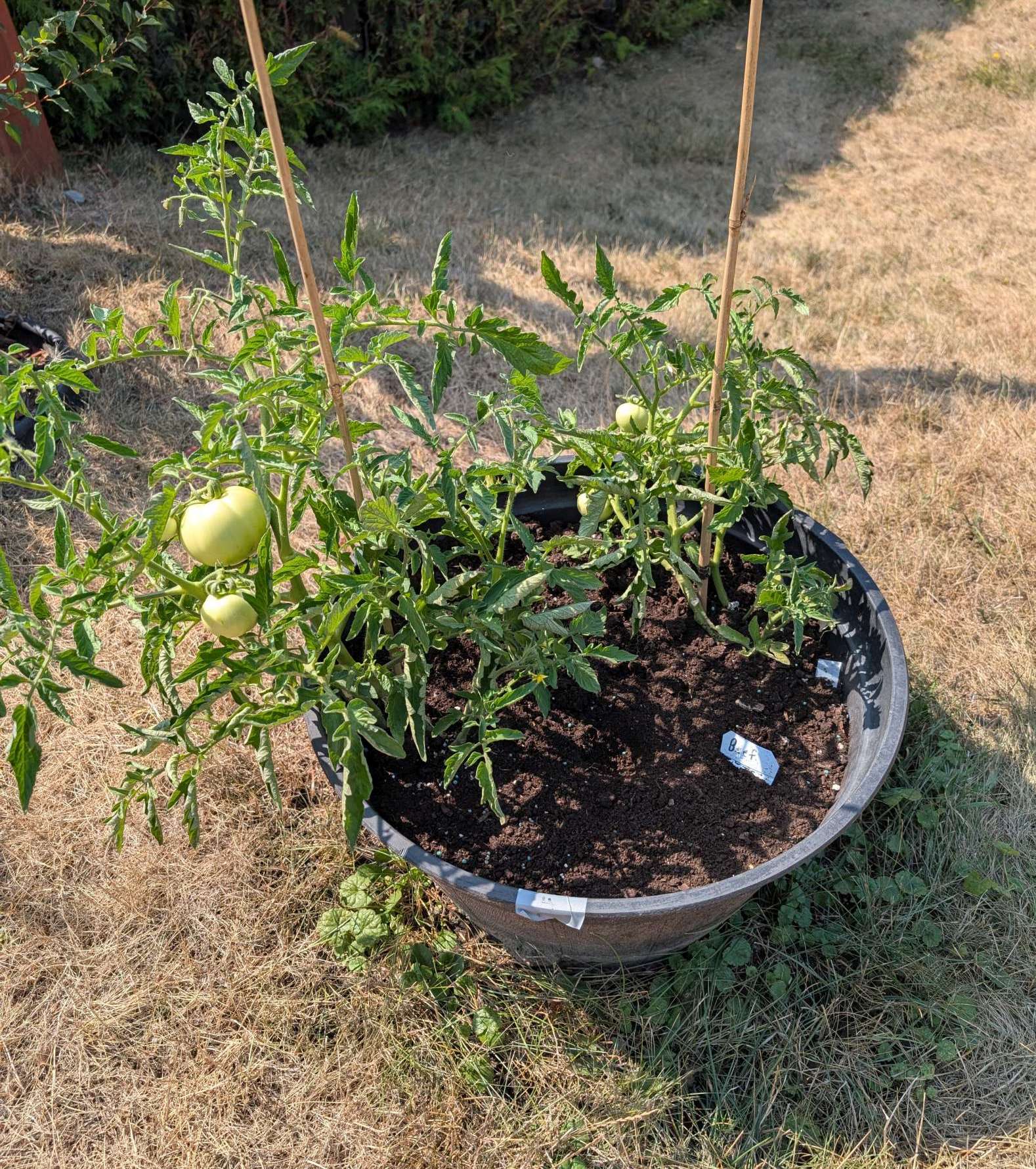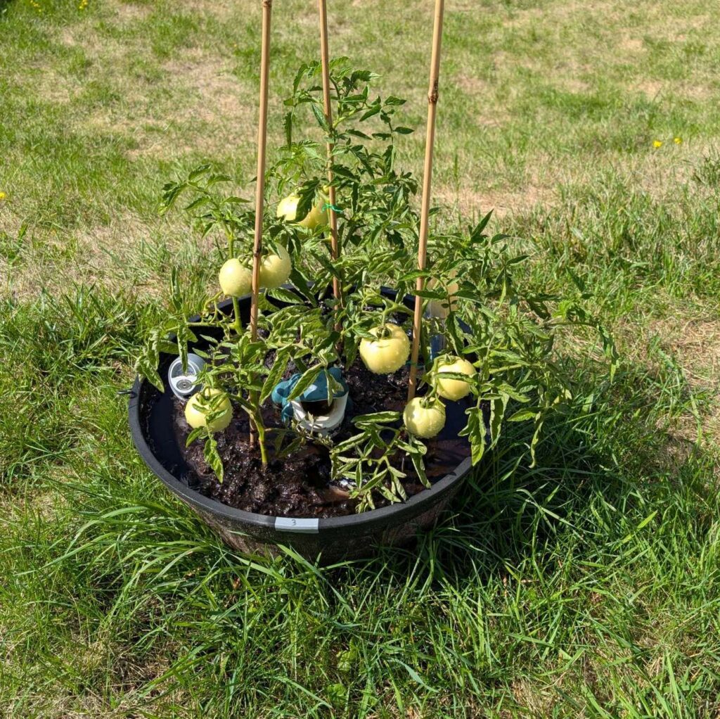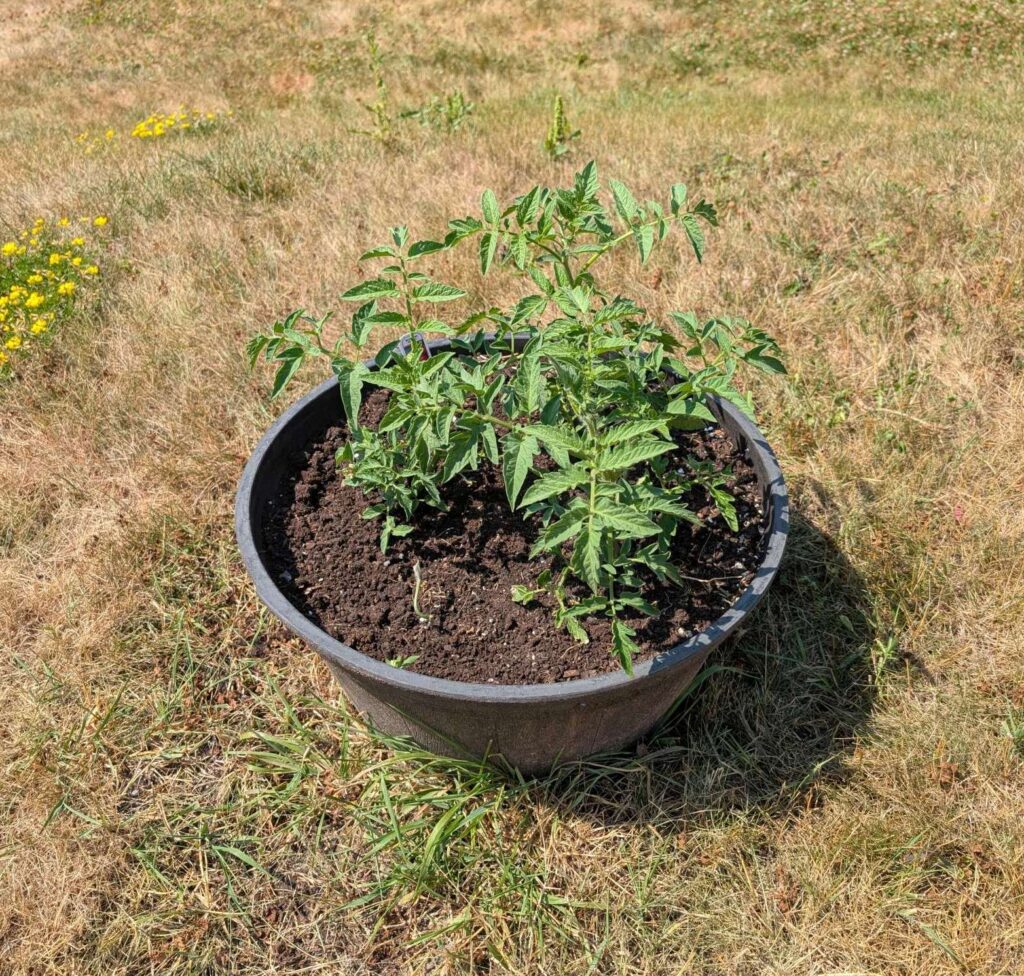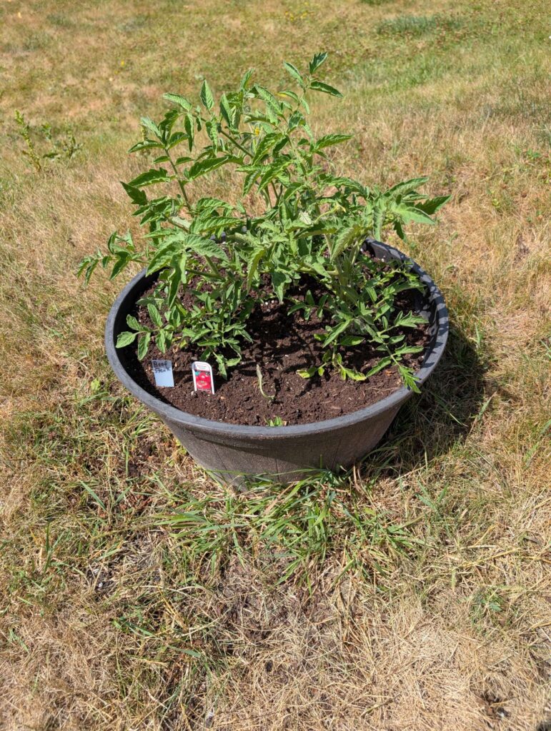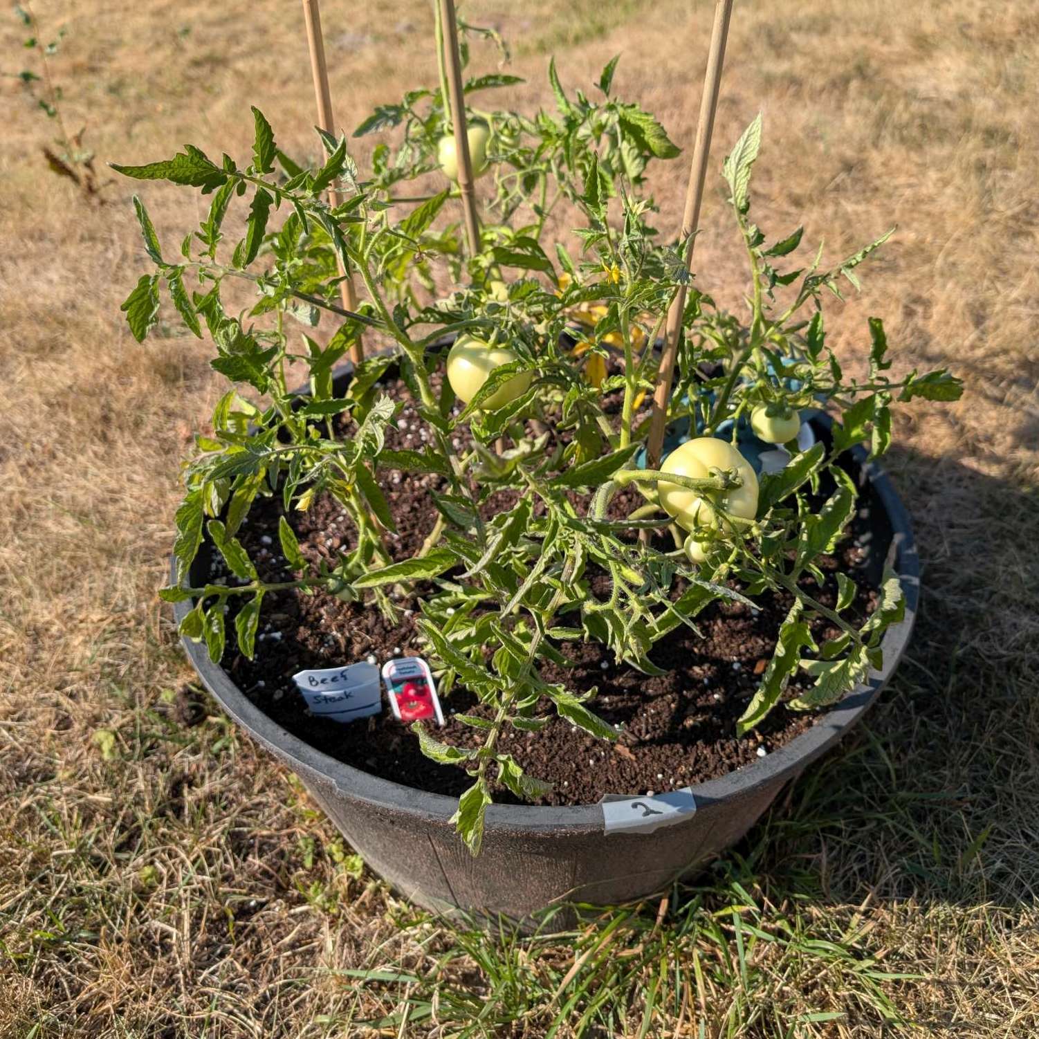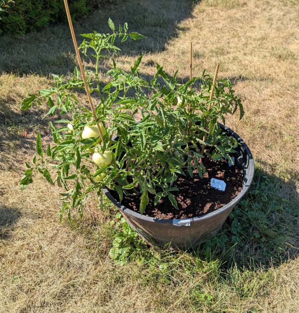 — 2025-08-02 – Saturday – day 38 – moved 1 Big Boy from pot 3 to pot 1; so now we have 2, 3, 3, 2 (counting from right to left); added soil to all pots; watered.