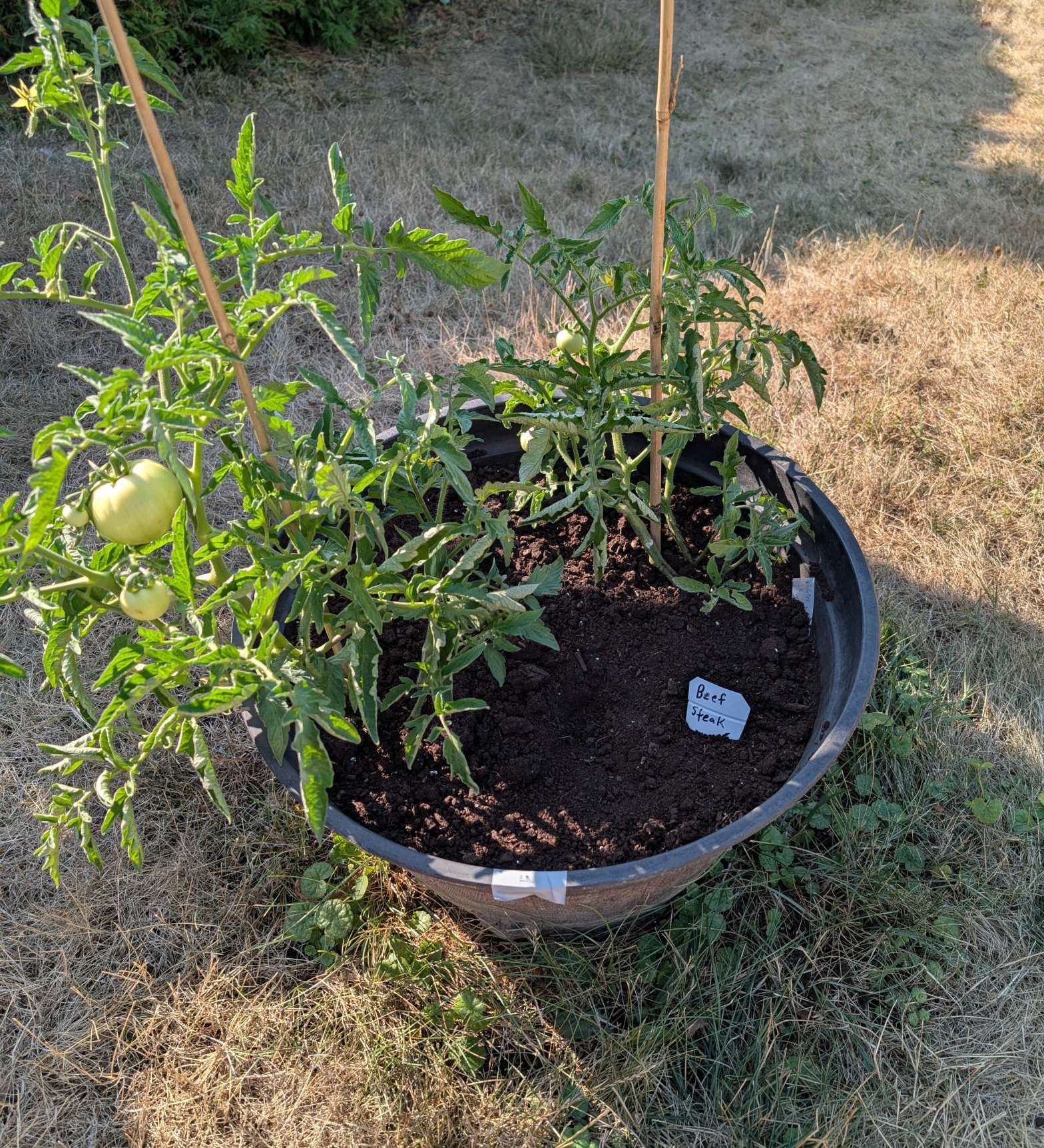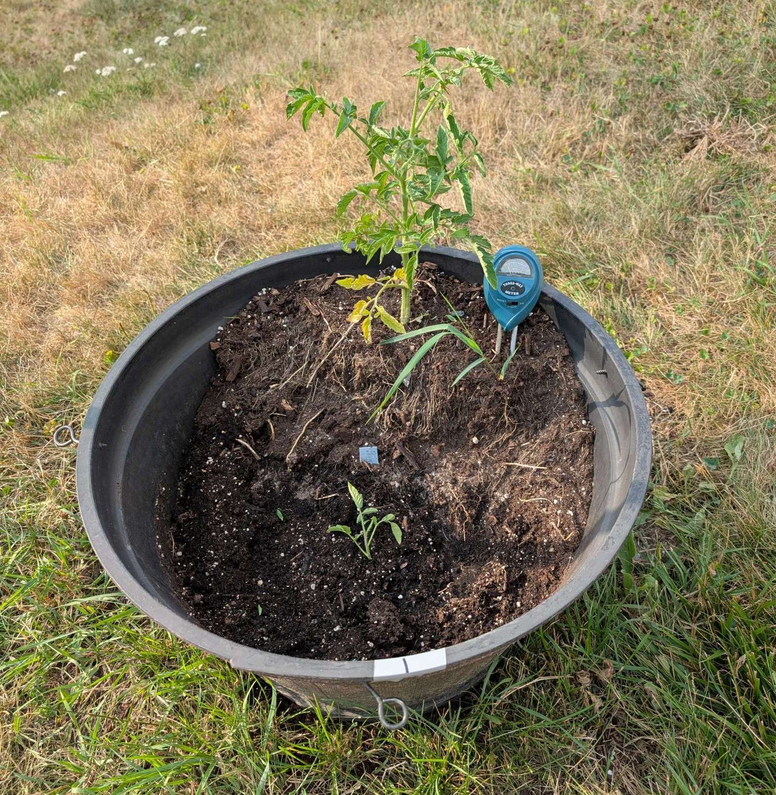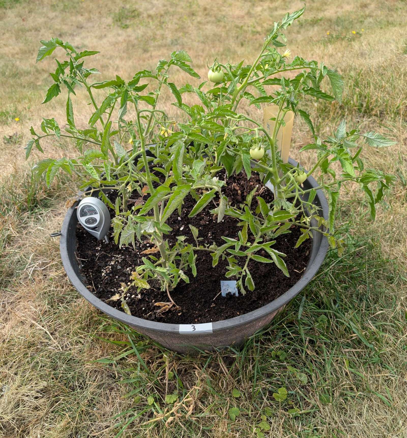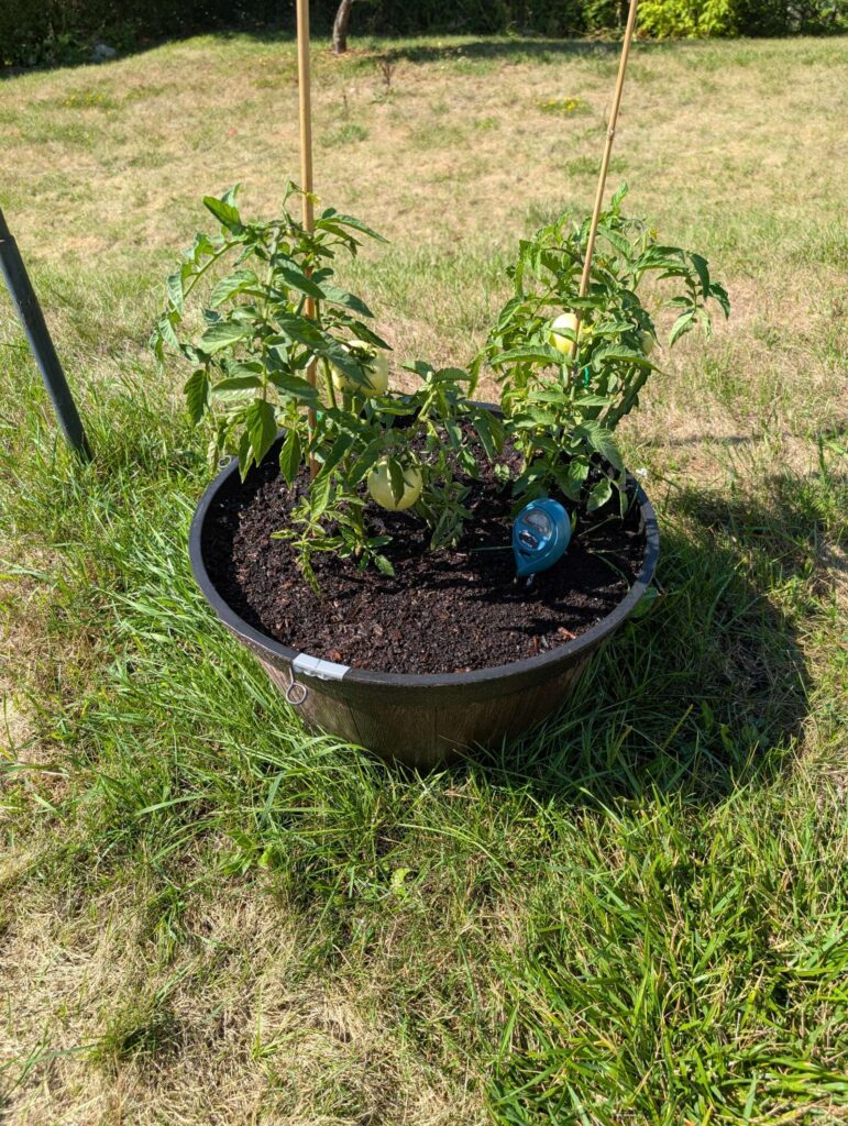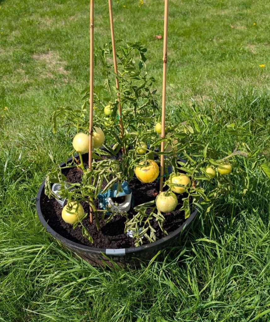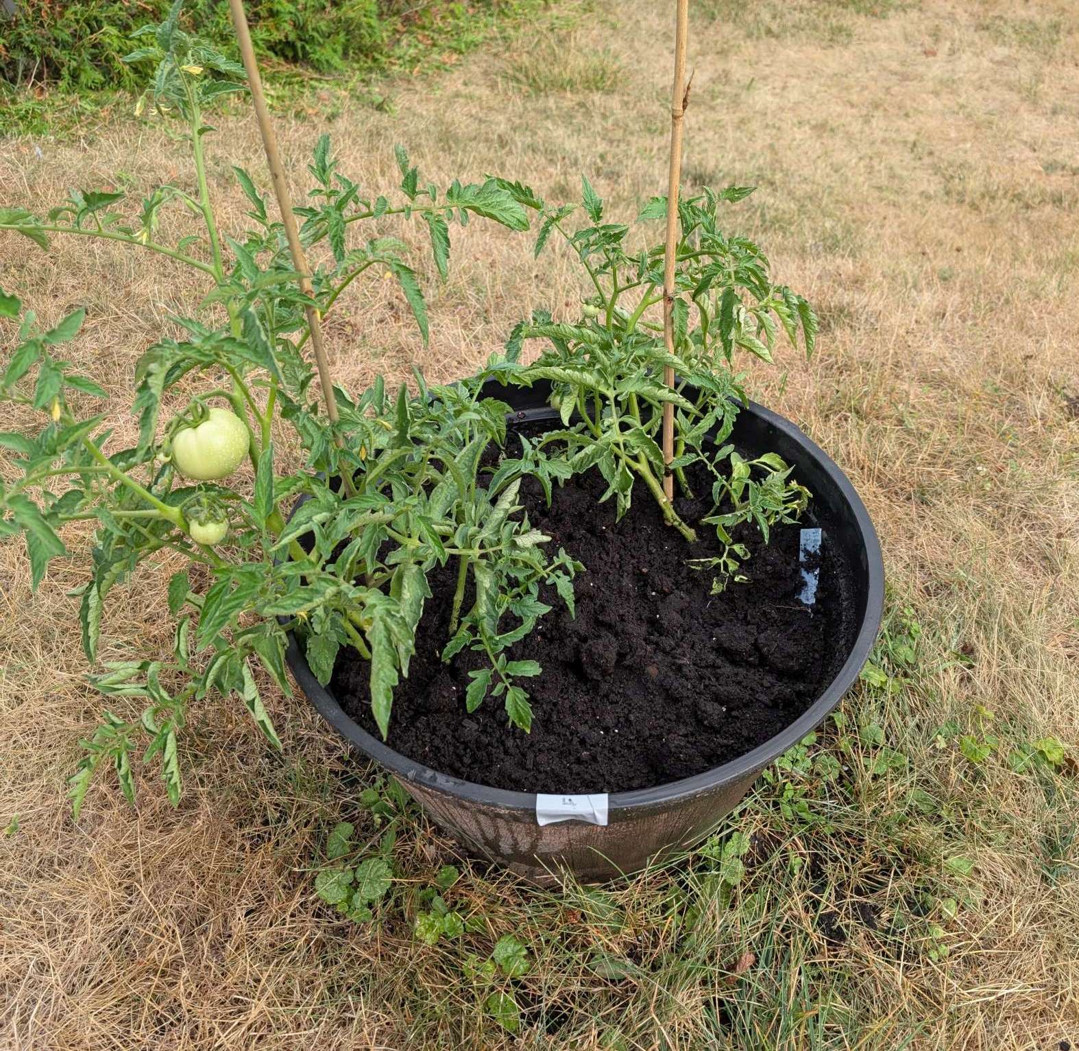 — 2025-08-02 – Saturday – day 38 – moved 1 Big Boy from pot 3 to pot 1; so now we have 2, 3, 3, 2 (counting from right to left); added soil to all pots; watered.