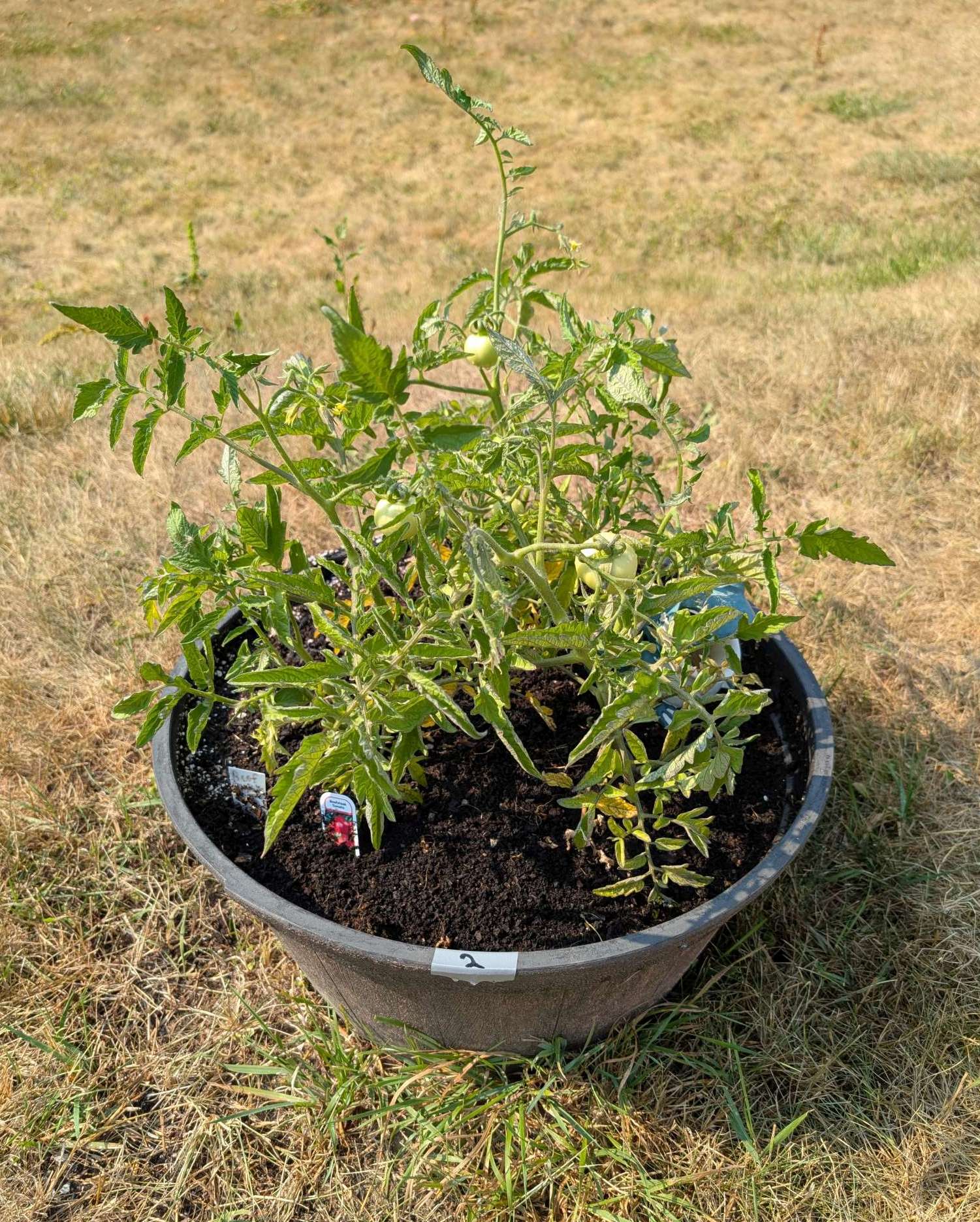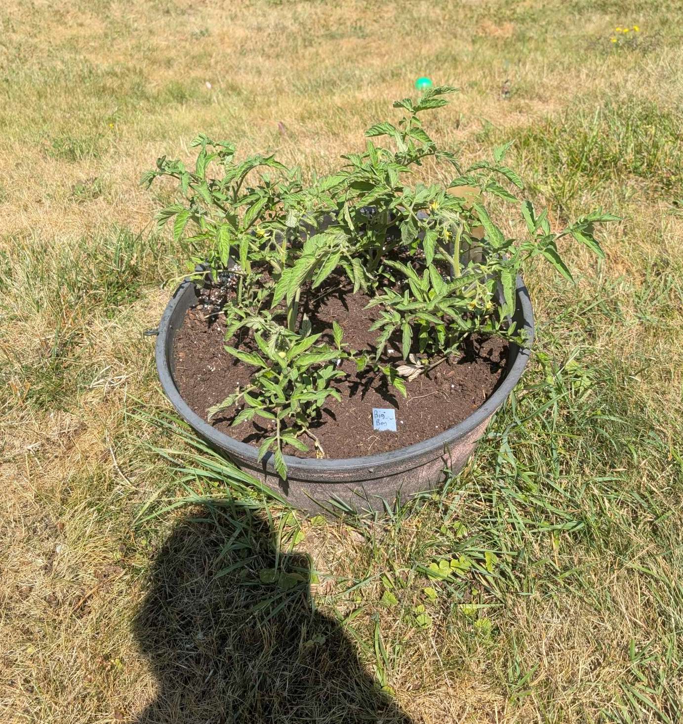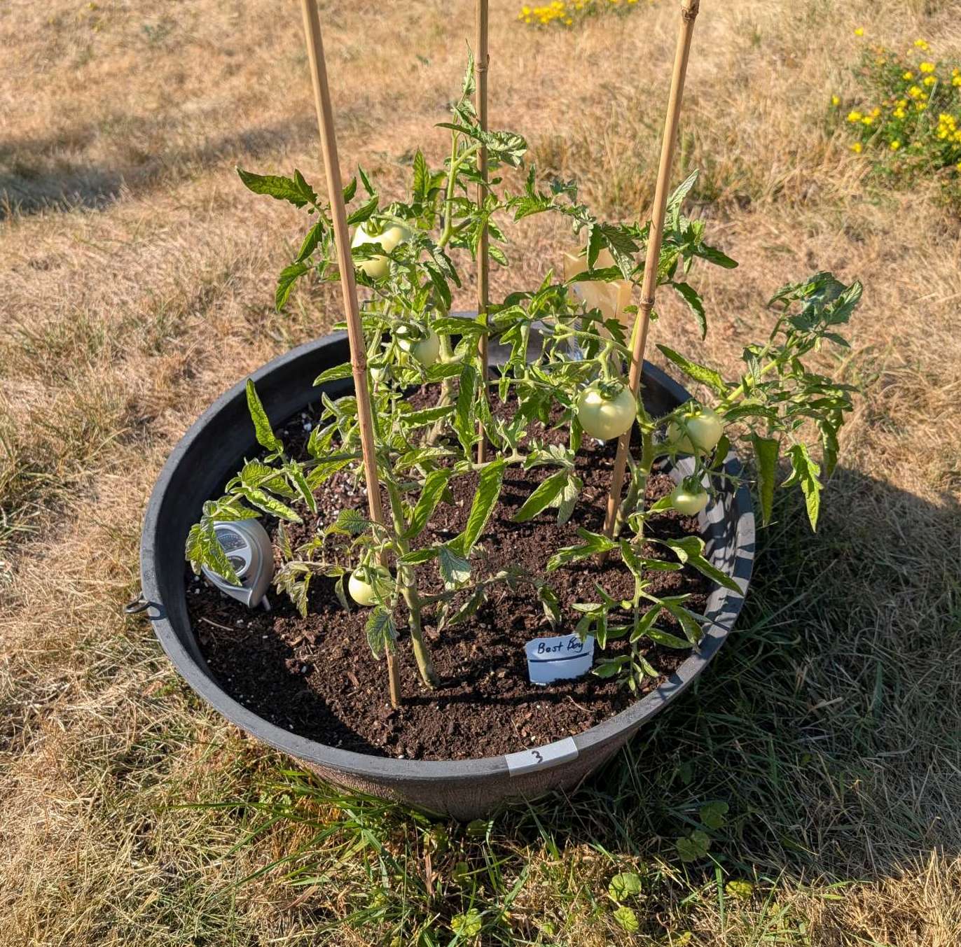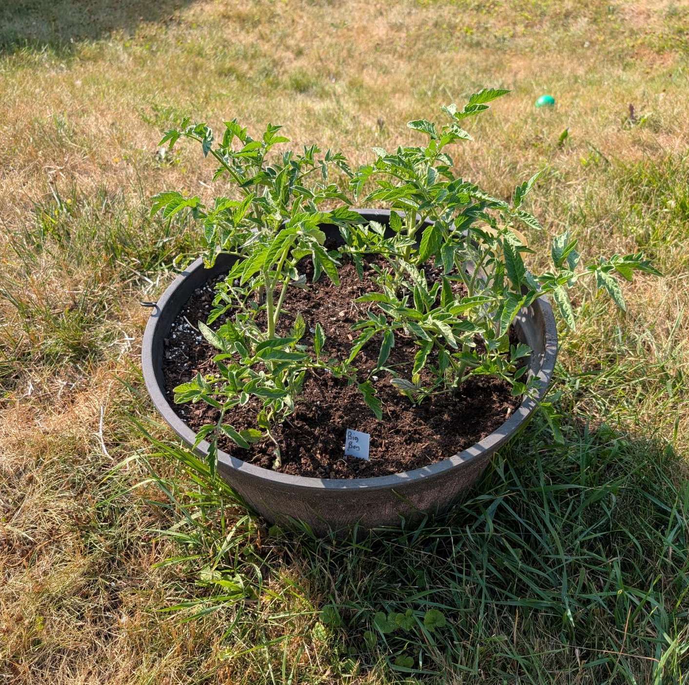 — 2025-08-02 – Saturday – day 38 – moved 1 Big Boy from pot 3 to pot 1; so now we have 2, 3, 3, 2 (counting from right to left); added soil to all pots; watered.