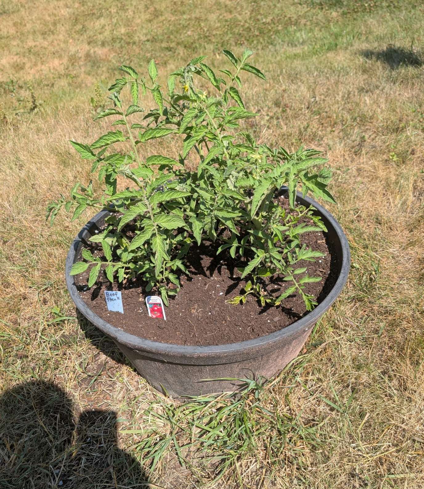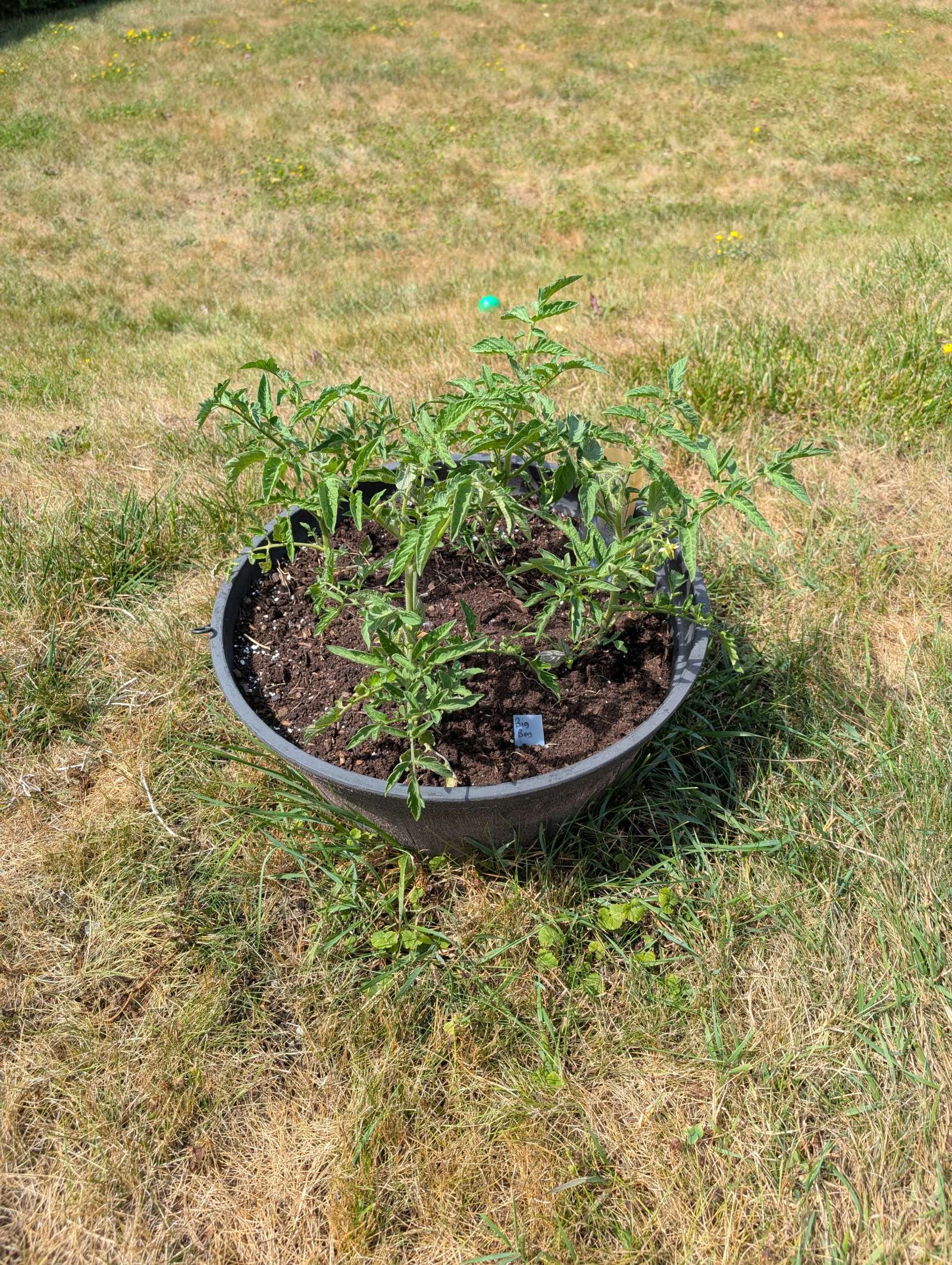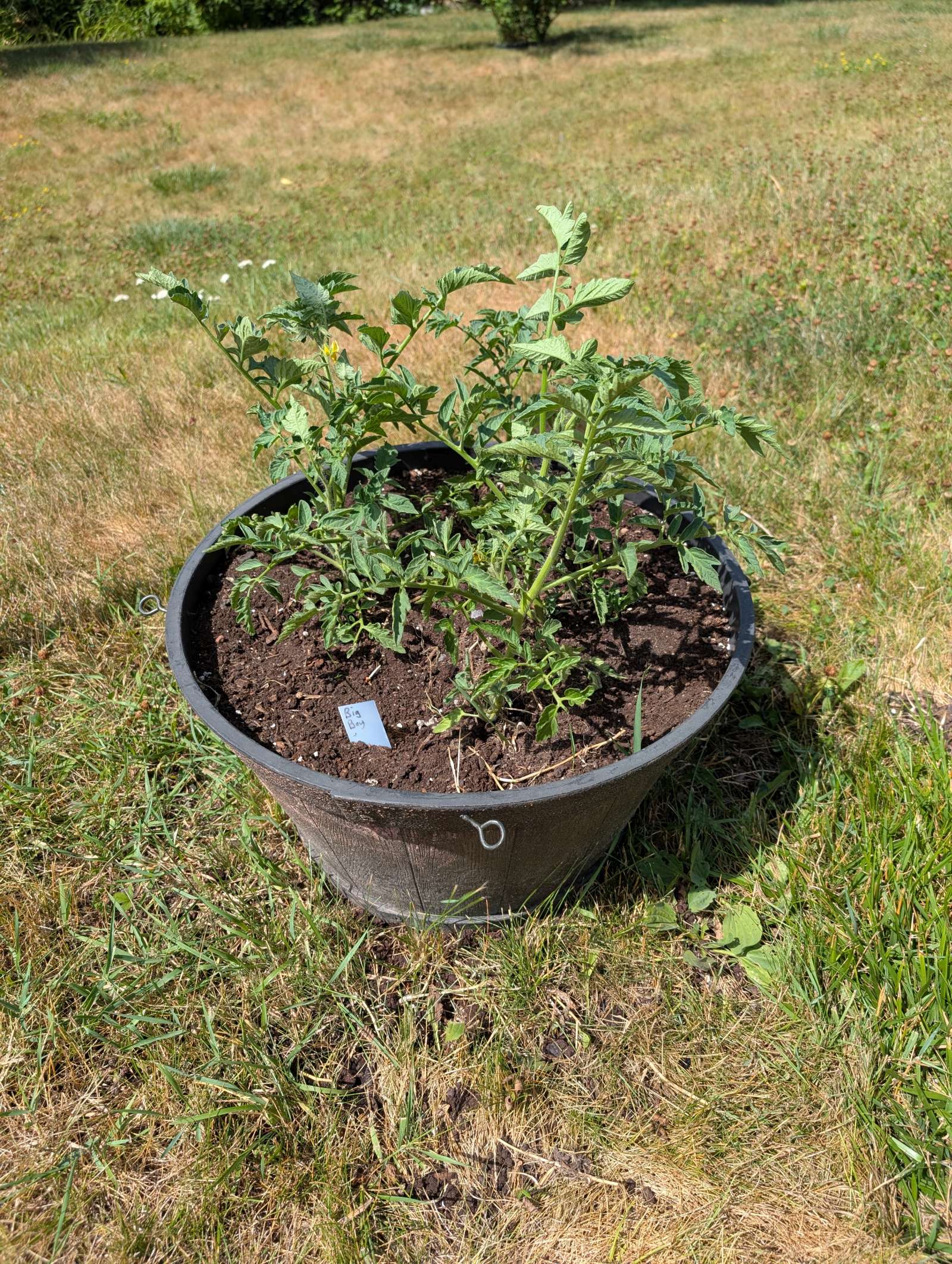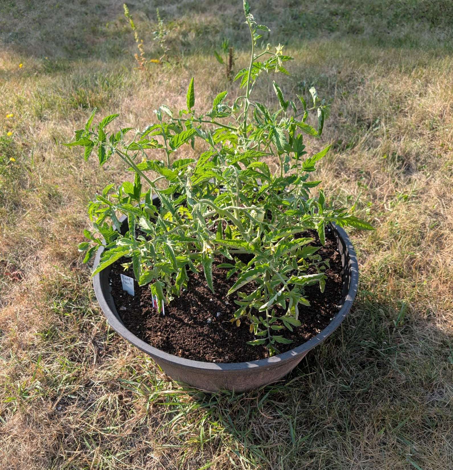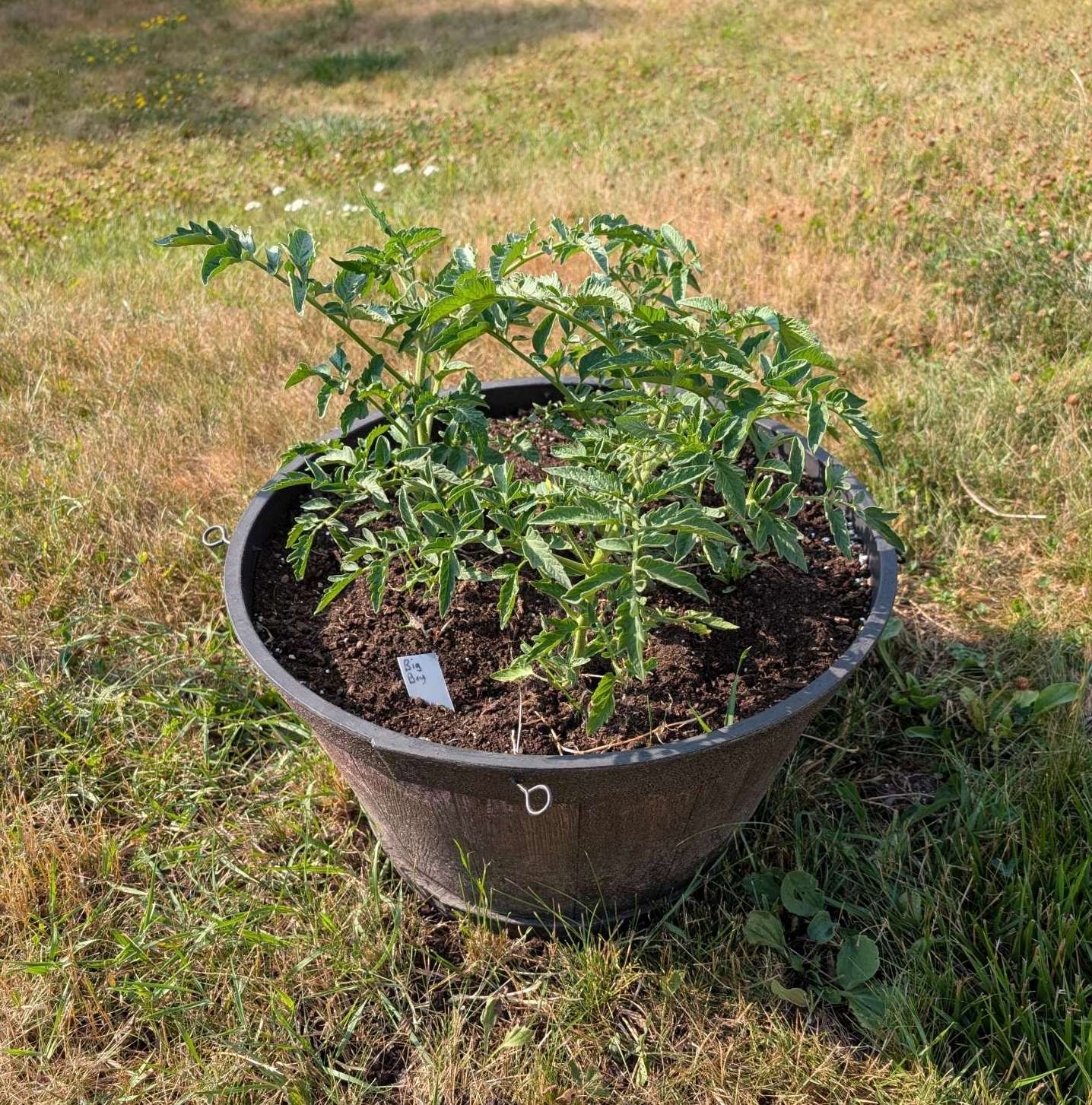 — 2025-08-02 – Saturday – day 38 – moved 1 Big Boy from pot 3 to pot 1; so now we have 2, 3, 3, 2 (counting from right to left); added soil to all pots; watered.