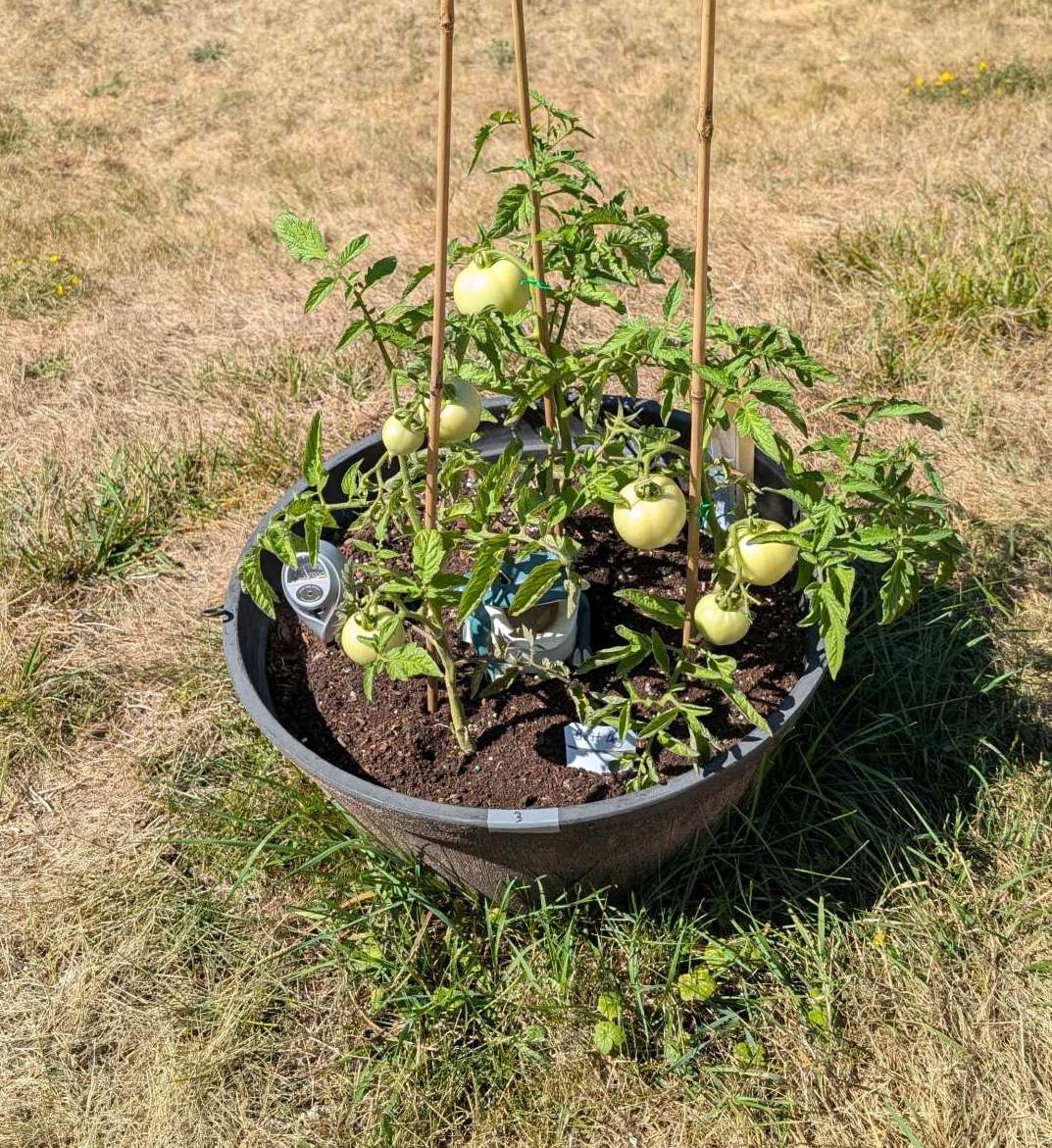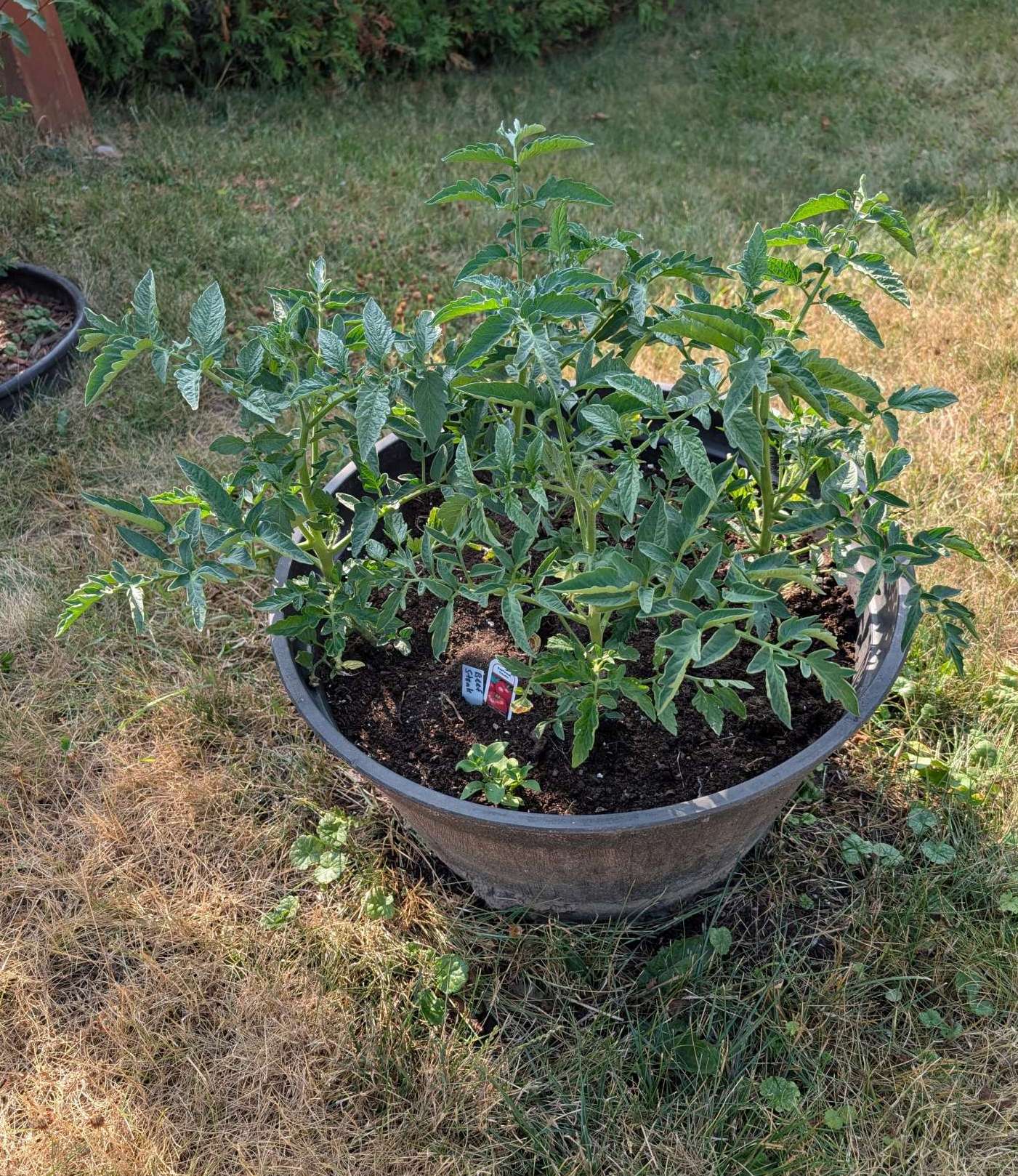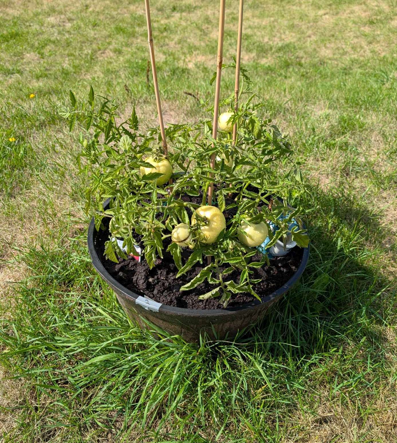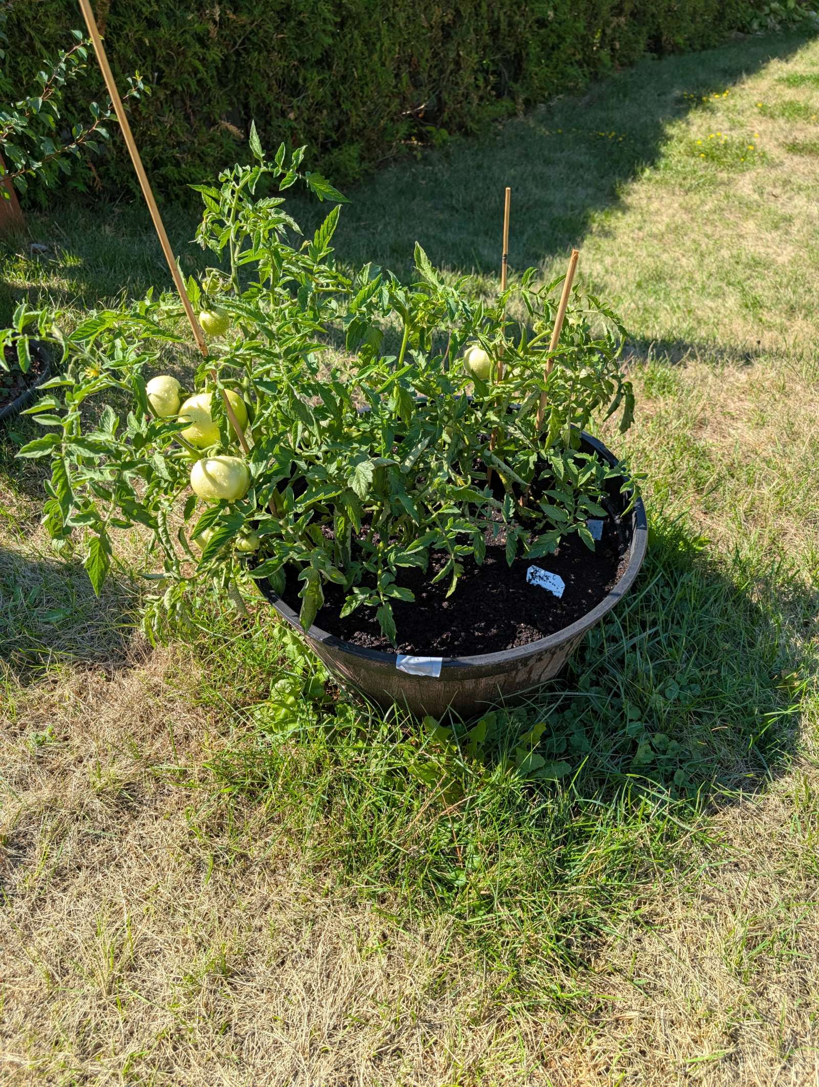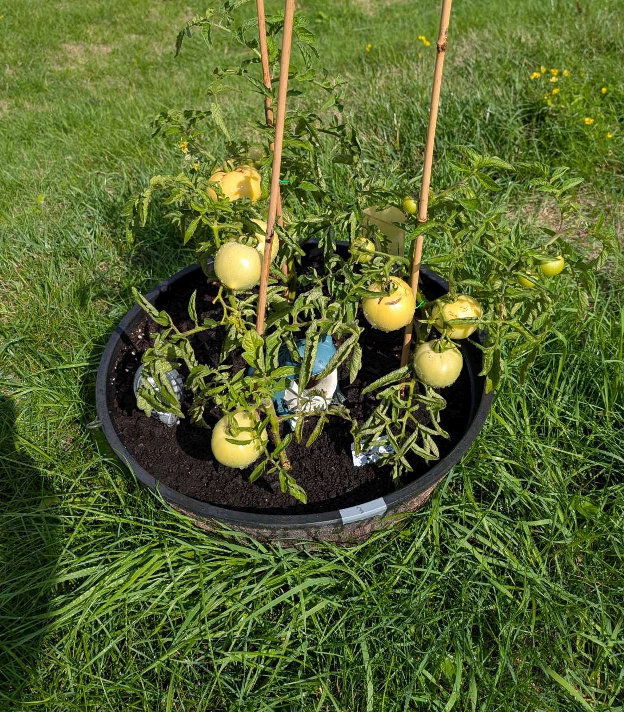 — 2025-08-02 – Saturday – day 38 – moved 1 Big Boy from pot 3 to pot 1; so now we have 2, 3, 3, 2 (counting from right to left); added soil to all pots; watered.