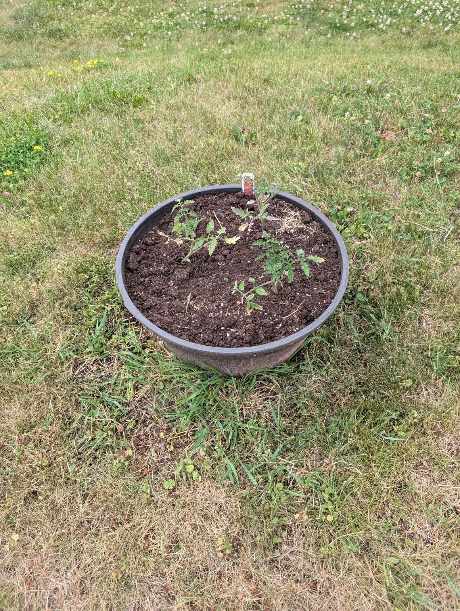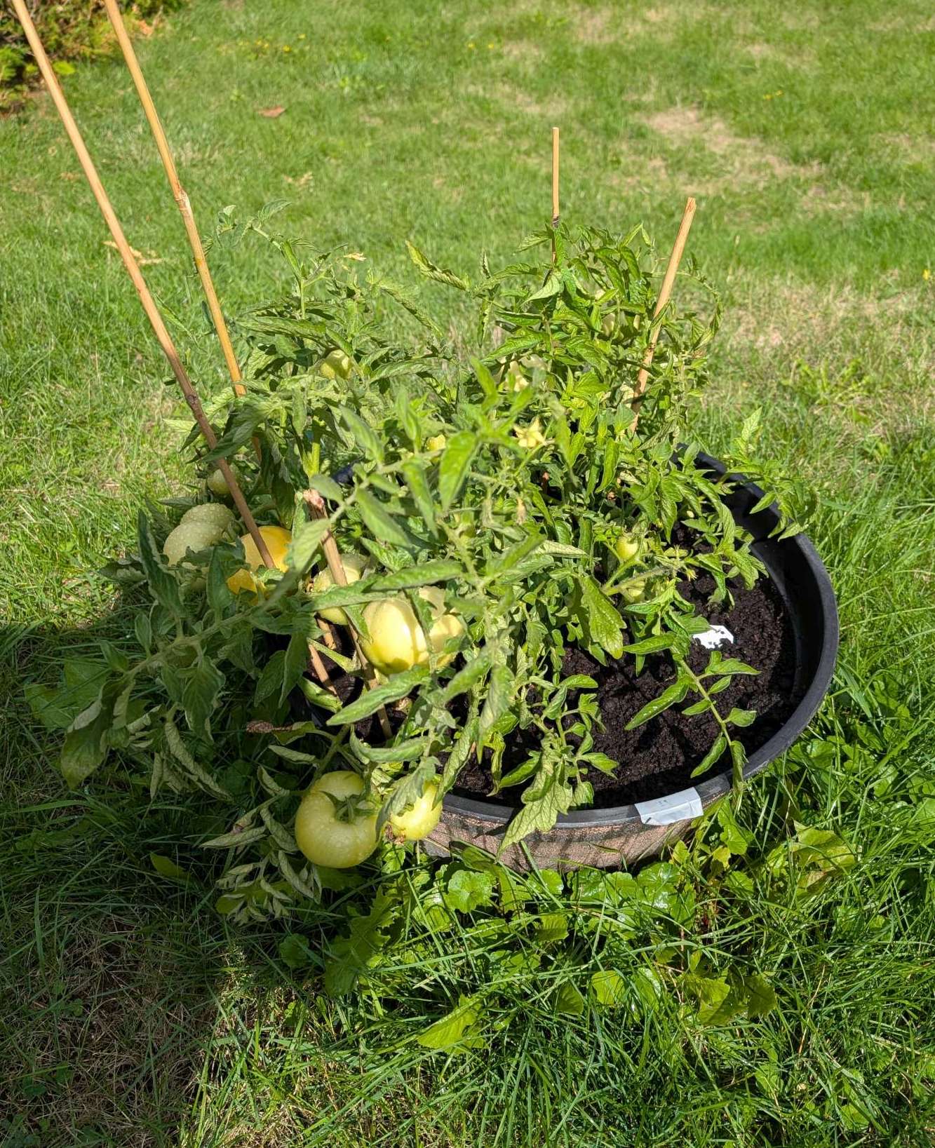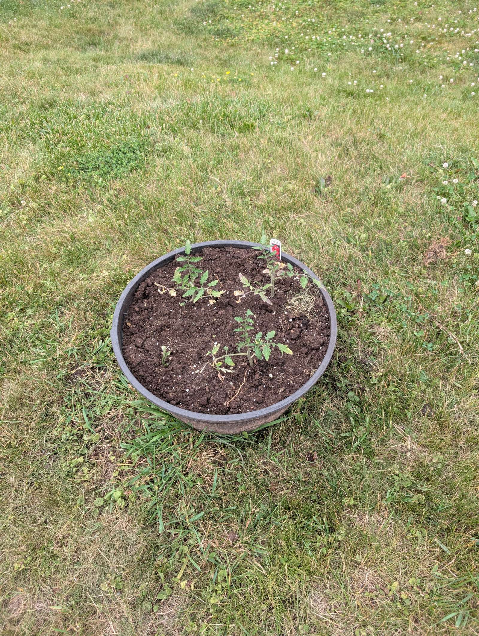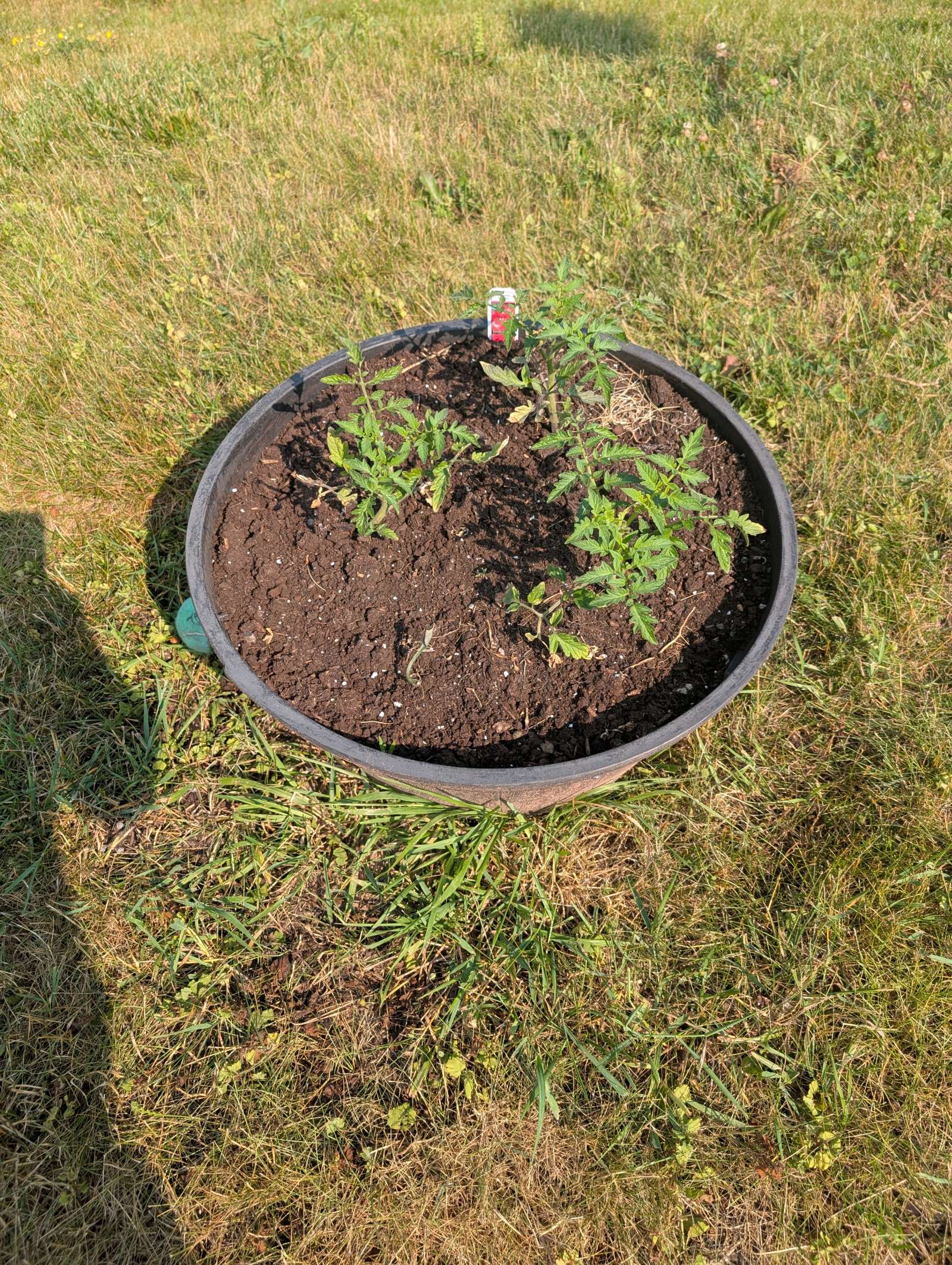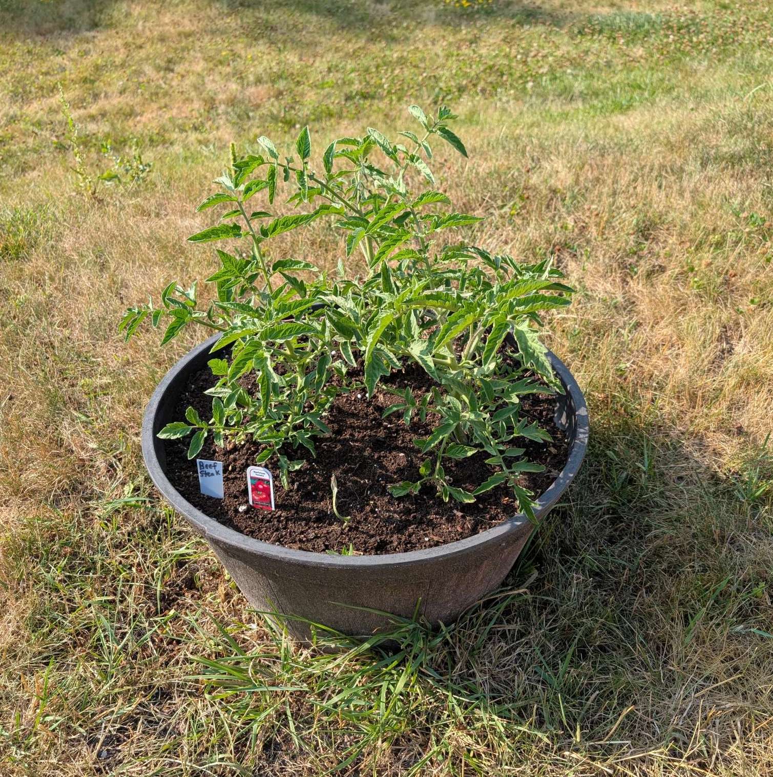 — 2025-08-02 – Saturday – day 38 – moved 1 Big Boy from pot 3 to pot 1; so now we have 2, 3, 3, 2 (counting from right to left); added soil to all pots; watered.