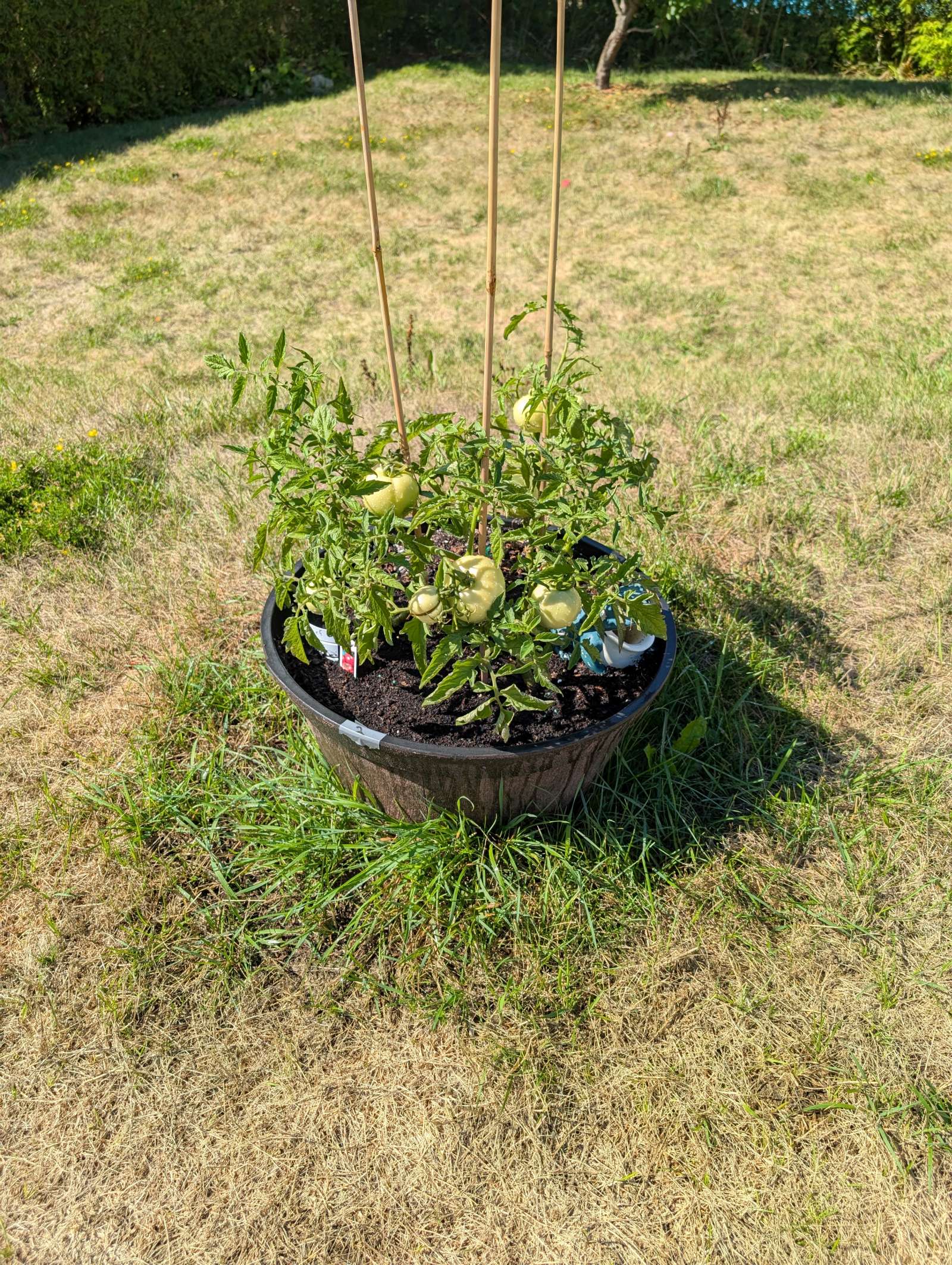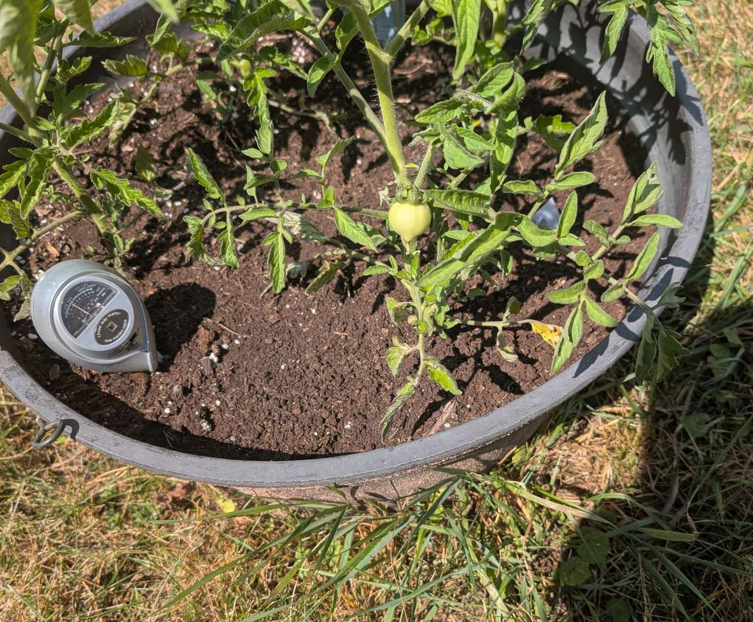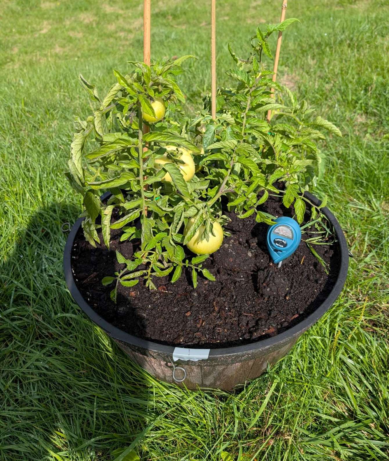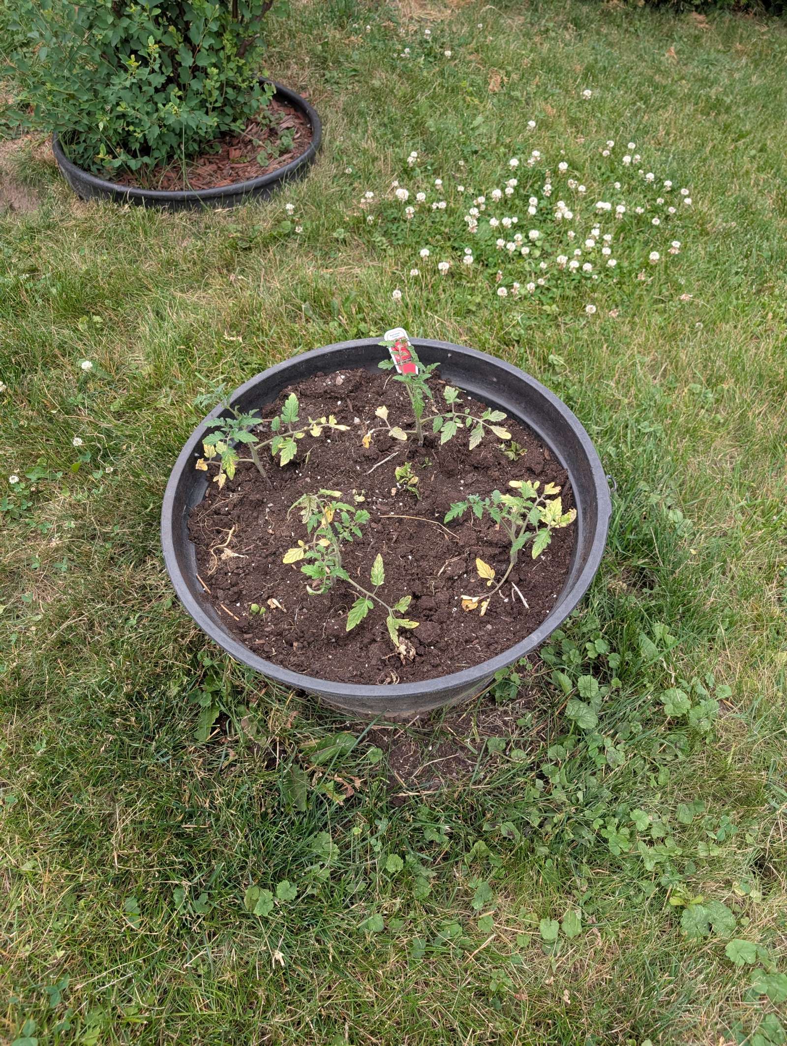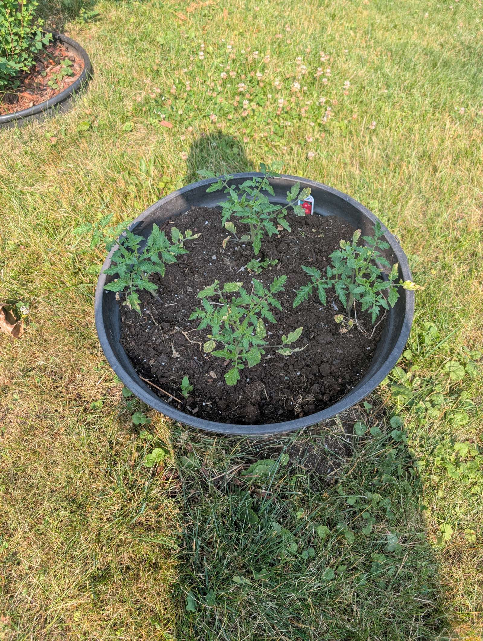 — 2025-08-02 – Saturday – day 38 – moved 1 Big Boy from pot 3 to pot 1; so now we have 2, 3, 3, 2 (counting from right to left); added soil to all pots; watered.