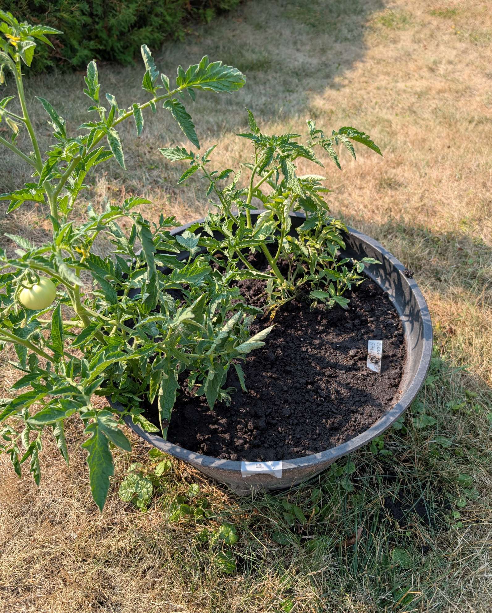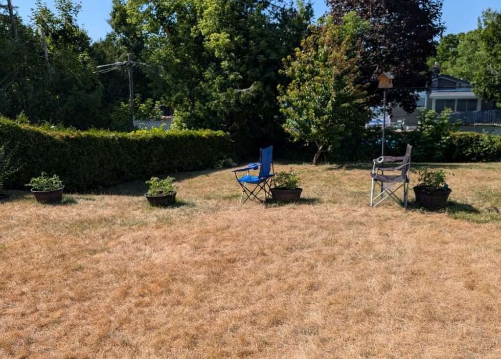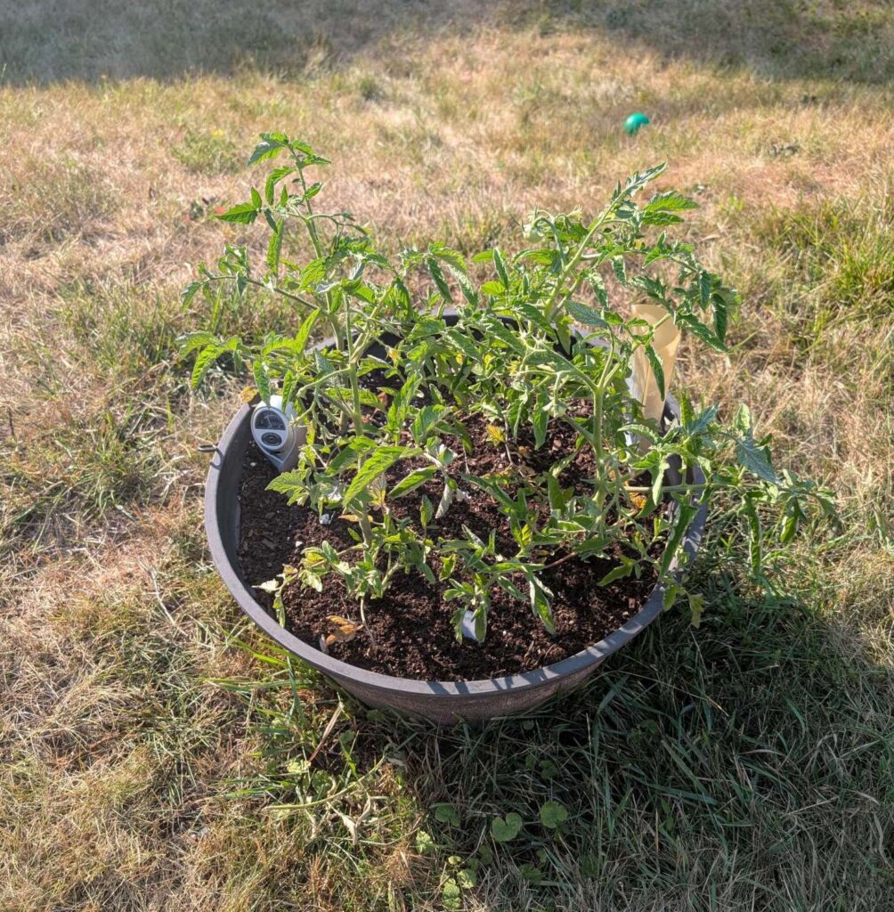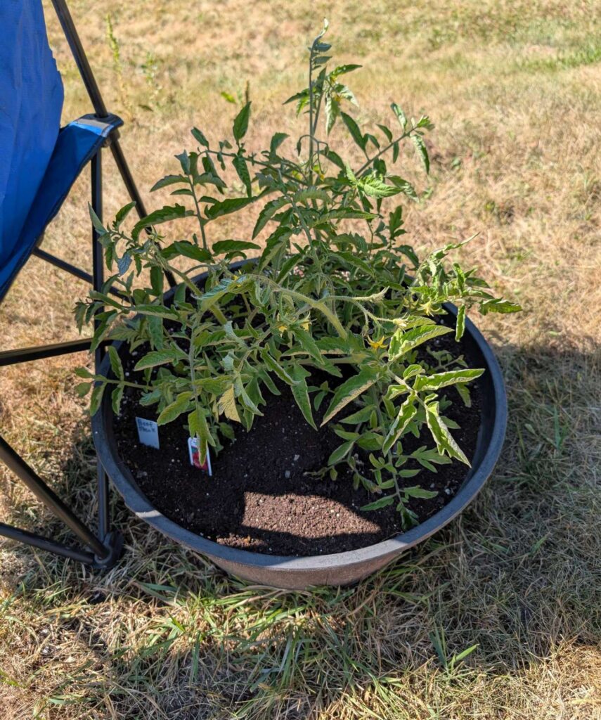 — 2025-07-23 – Wednesday – day 28 – added sun shade to 2 right side plants; for simplicity, used 2 camp chairs, which give ~90% shade BUT will have to be adjusted ~11am, ~3pm, ~5pm as the sun moves. left 2 as control.
