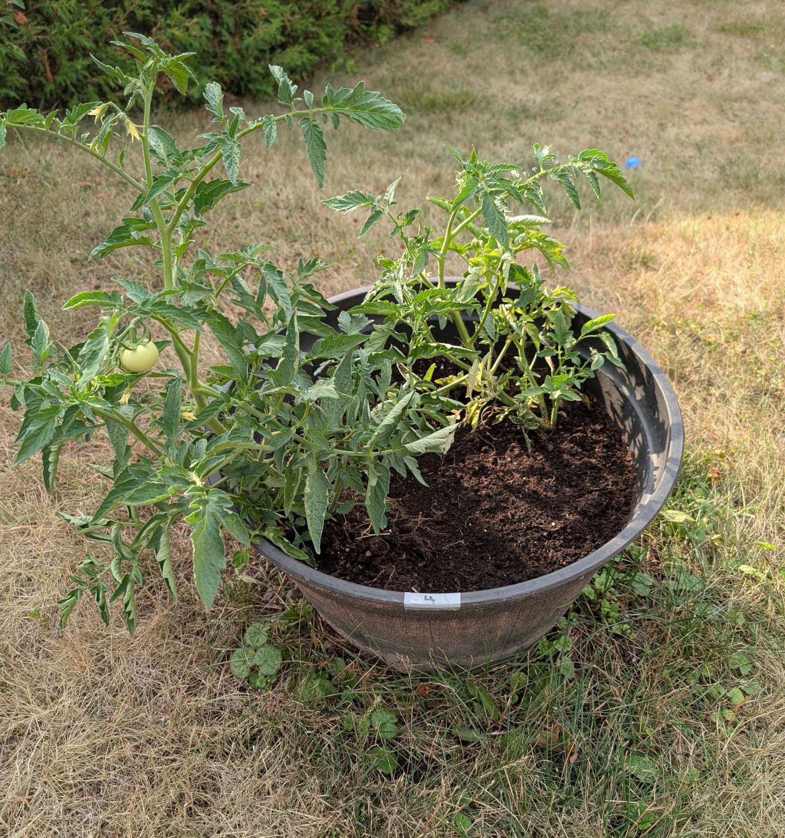 — 2025-07-31 – Thursday – day 36 – added labels (1=right (near garage), 4=left (near west fence); #1 now has 1 plant (someone took 3… you’d fucking think that someone might attempt to cover the roots for the remaining 1 plant, and might take one out of #2 (leaving 2) and one out of #3 (leaving 3), but too fucking difficult, so now we have 1, 3, 4, 2 (counting from right to left); I’ll fix this tomorrow…