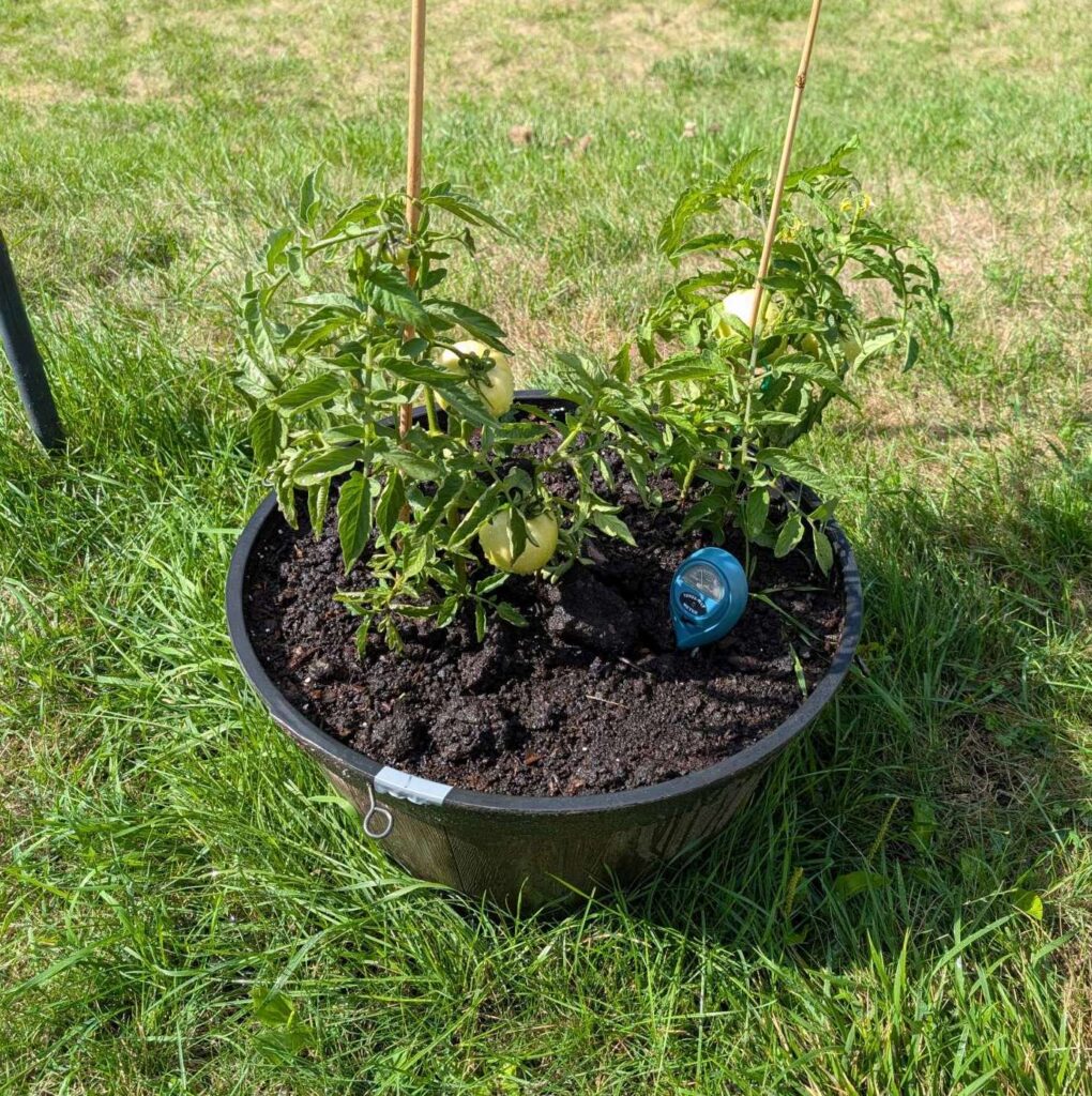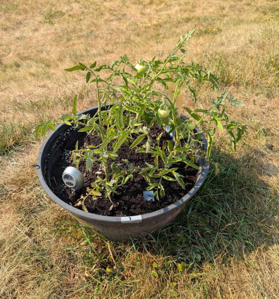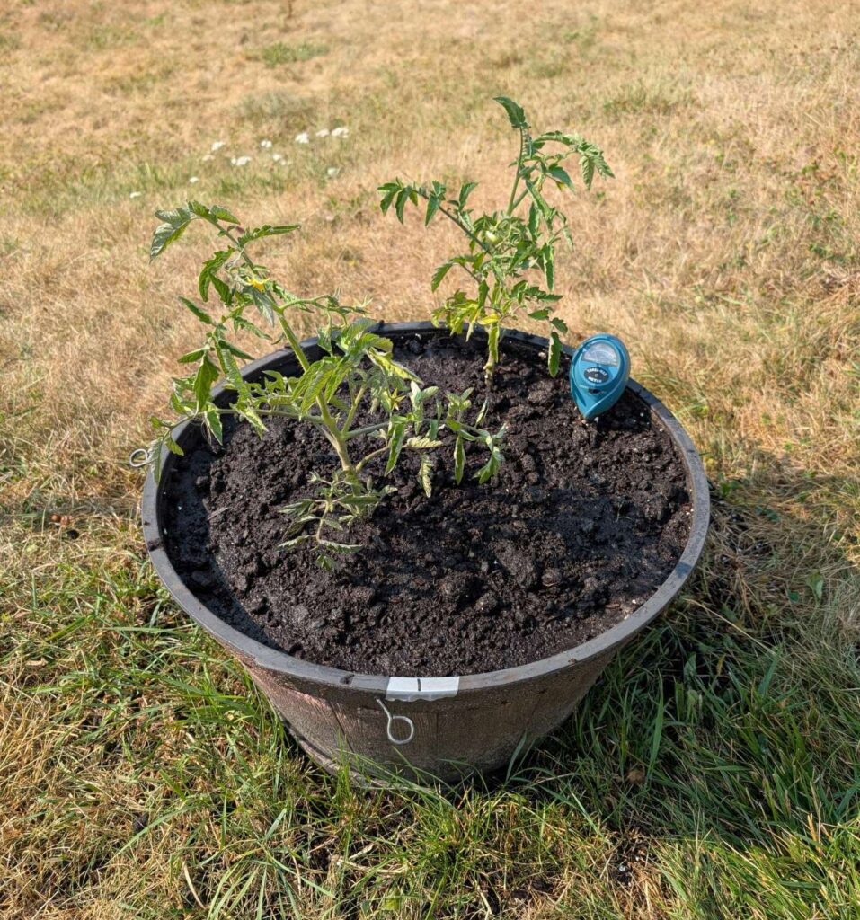 — 2025-07-23 – Wednesday – day 28 – tested soil using vinegar & baking soda method; no fizzing with either, suggesting neutral pH; so next step is to reduce temperature by shading the plants.