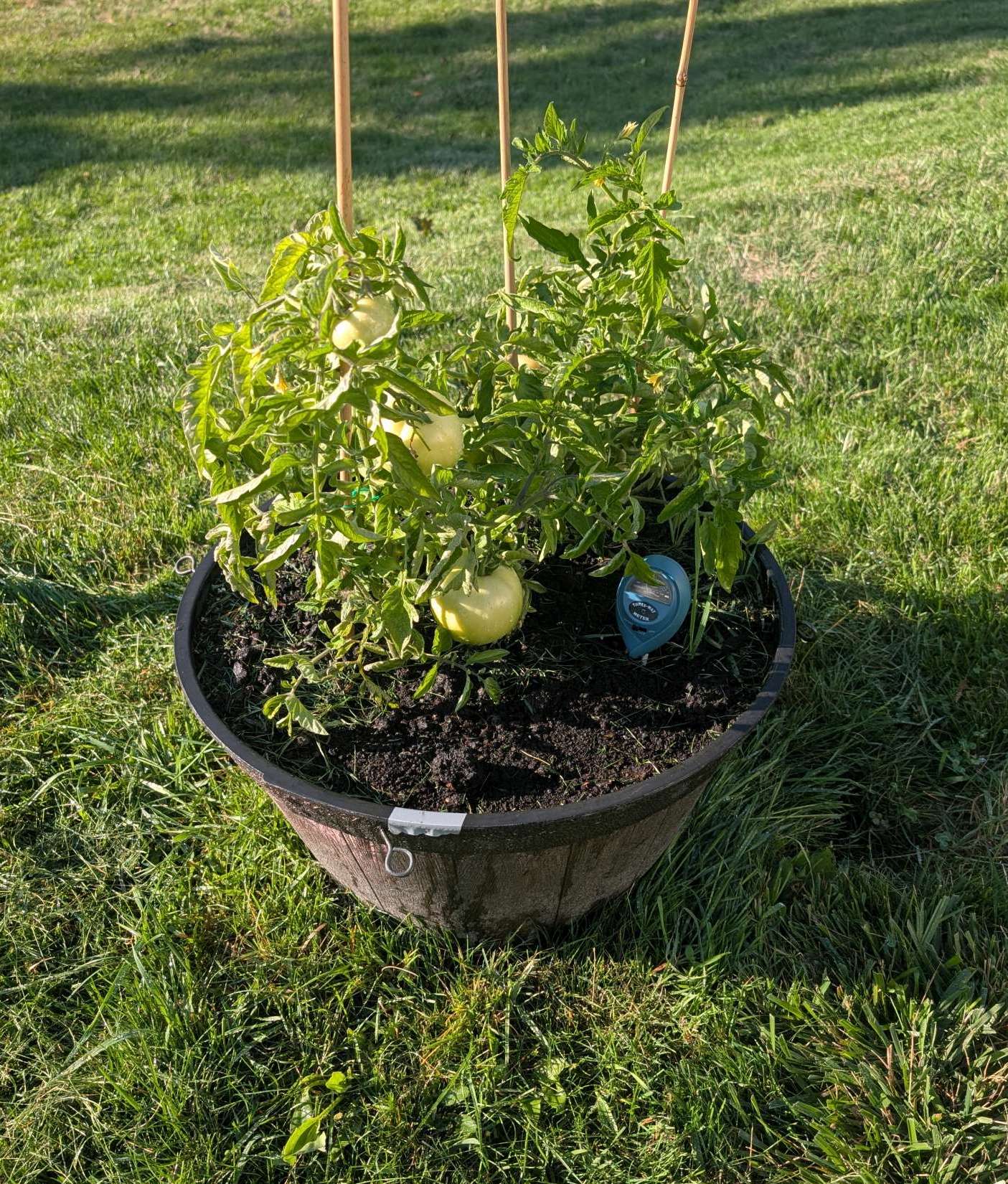 — 2025-08-21 – Thursday – day 57 – tied plants to stakes. currently ~28 tomatoes.