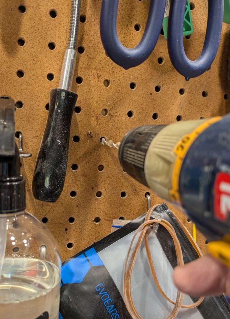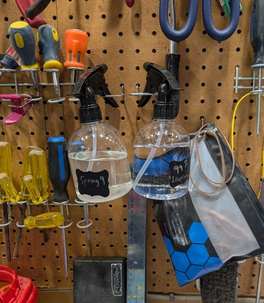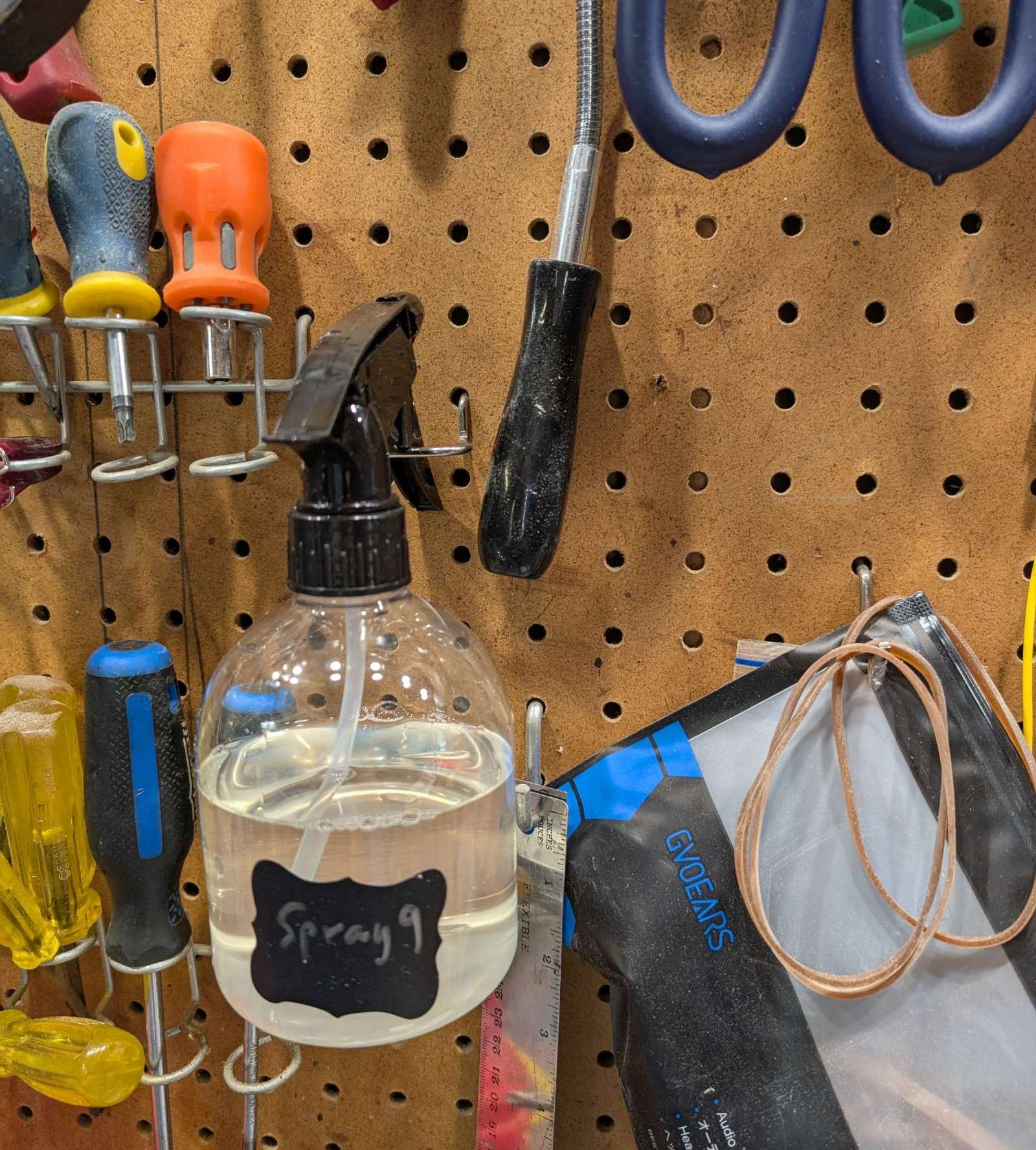 Spray 9 bottle using a pegboard thingy… i want the 2nd one next to it… but…