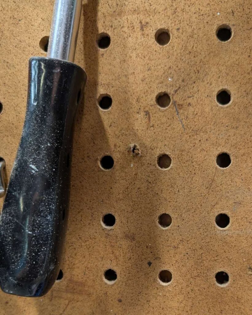 … but the 2×4 stud behind the pegboard prevents inserting holder thingy…