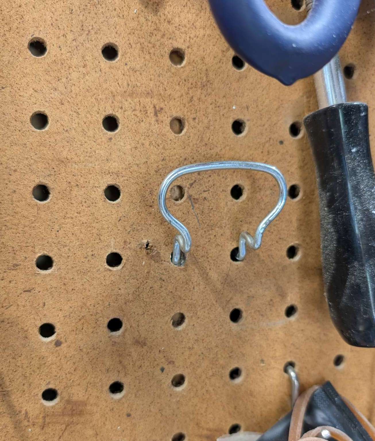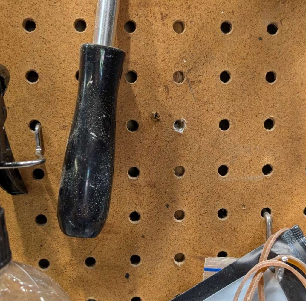 … but doesn”t work, since need more space behind the pegboard to swing down and lock into the pegboard… so could mangle the hole or make another one above it… ffs…