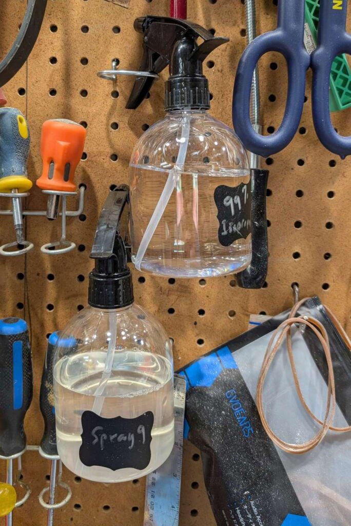 (1 with Spray 9, my current favorite general porpoise cleaner, 1 with 99% Isopropyl, used for many cleaning jobs, esp pre-gluing & taping where i really want it clean. also make a good wasp & fly killer,… hit them with a squirt and it somewho gets absorbed and kills them.