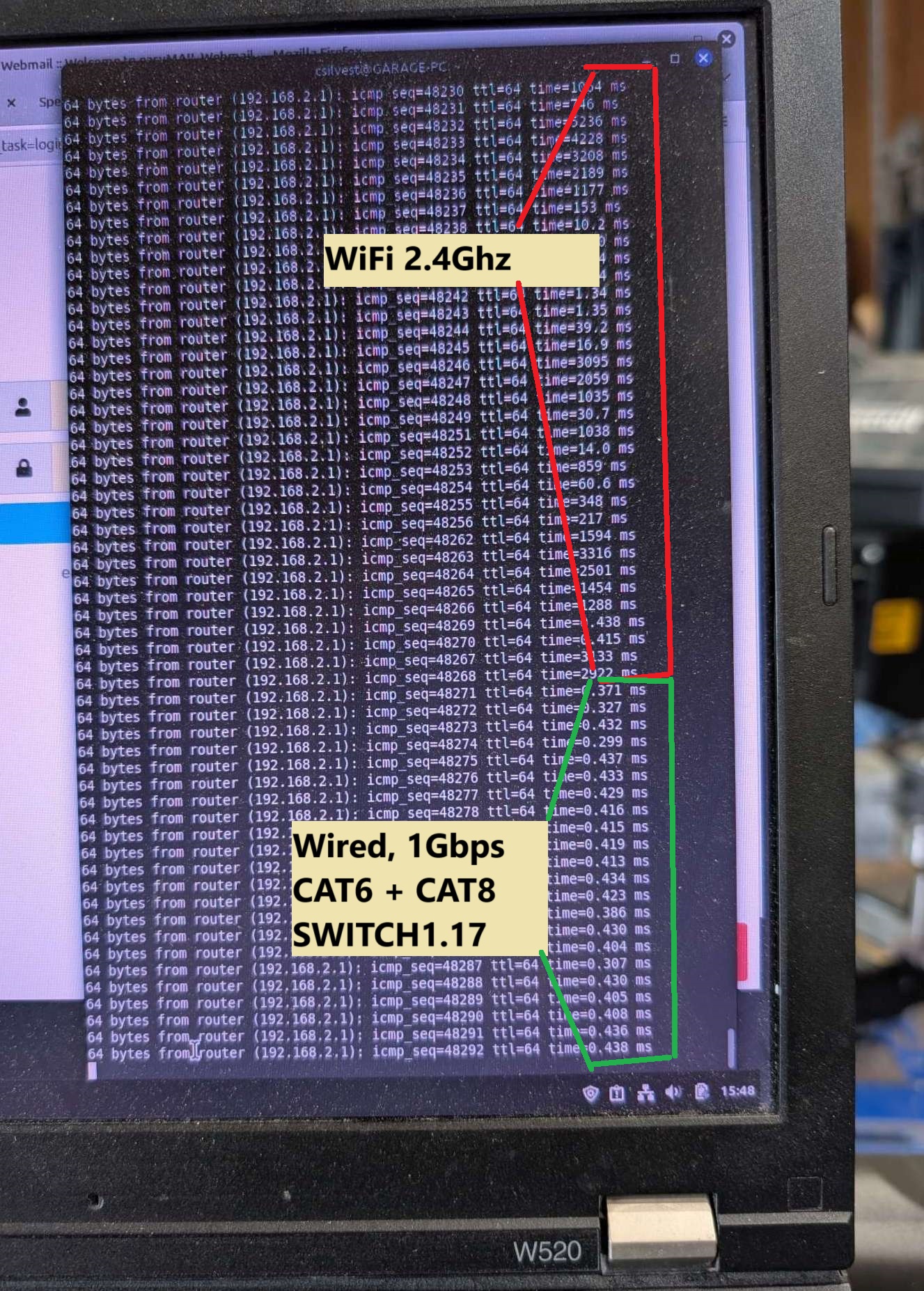 sadly, no pics! but I did take this screenshot of ping ROUTER1 times as I plugged in the ethernet cable and the machine switch from WiFi to wired…: