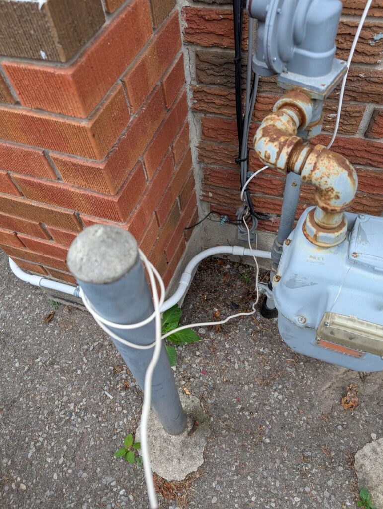 — 2025-06-30 – poked a fish wire in from the outsite, in the hole where there is a grey pair cable in a hole, i think this is cable Cogeco?. !!! not enough space to get the cat8 cable thru, MAYBE pull cable out (or cut and discard., since they’ll likely want to run it again it we ever change to cable?