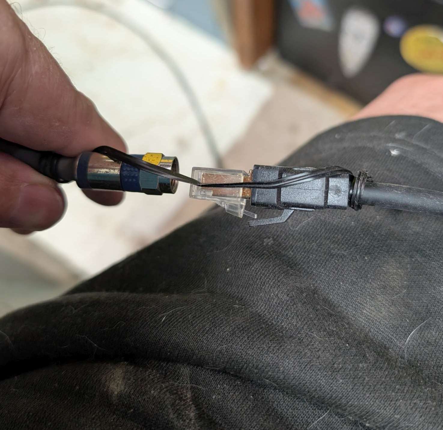 — 2025-07-12 – Saturday – i added a 25′ (10m?) cat6 cable using a F-F coupler; no sense in running cat7+ since laptop and my complete network are all 1Gbps. future me might upgrade, but doubtful…