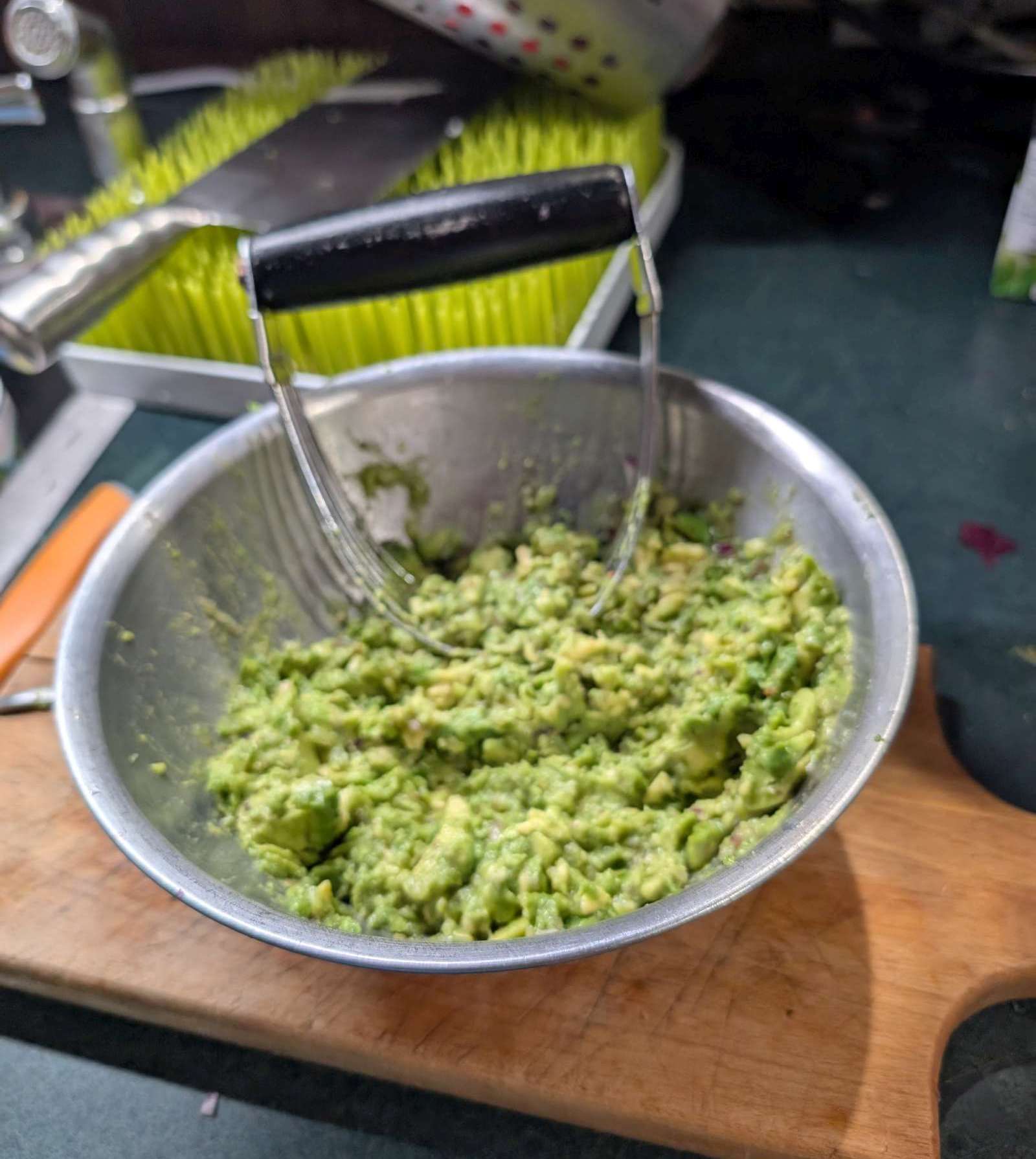 … a few stomps with the wire masher (i think really a pastry masher… not a pastry cutter, although that would likely work, too).. and perfect for dipping!