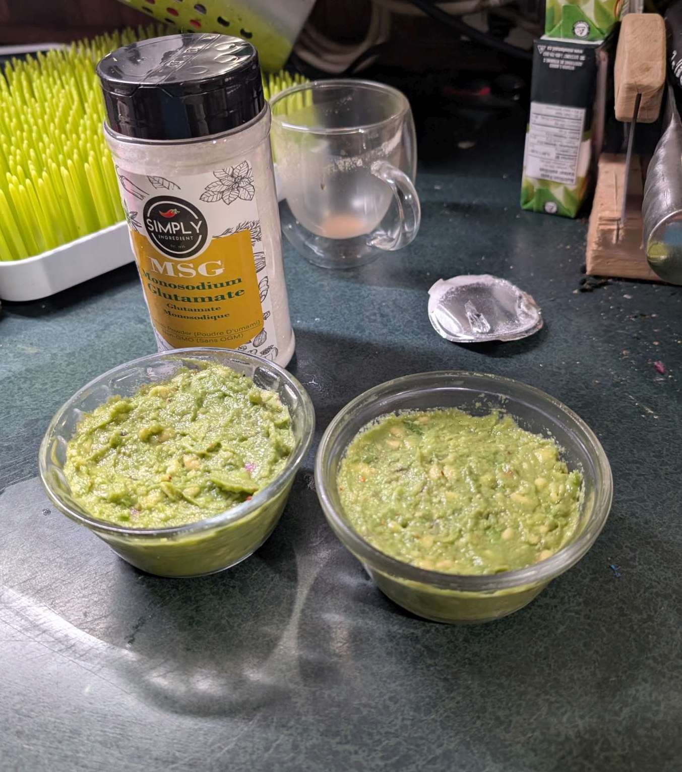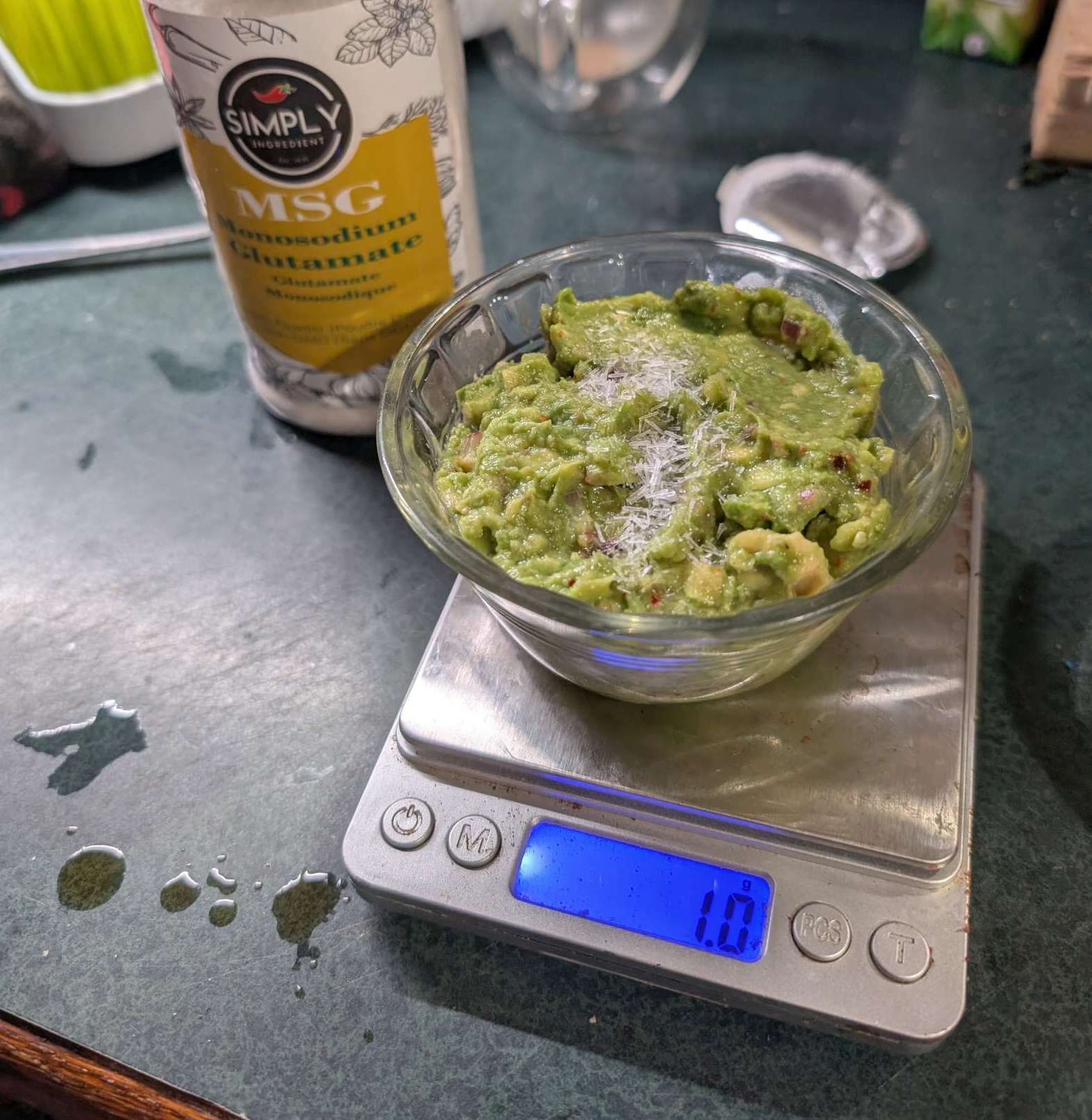 msg – added 1g imply Ingredient MSG Crystal Powder, Yum Yum Powder, Umami Flavour Seasoning, Premium Monosodium Glutamate, Non-GMO, 325 gram to one bowl of my standard guacamole (2 avocados ripe, 2tb finely chopped red onion, 1TB garlic minced, pepper, 2xsalt, tajin, juice 1/2 lime, coarse mush